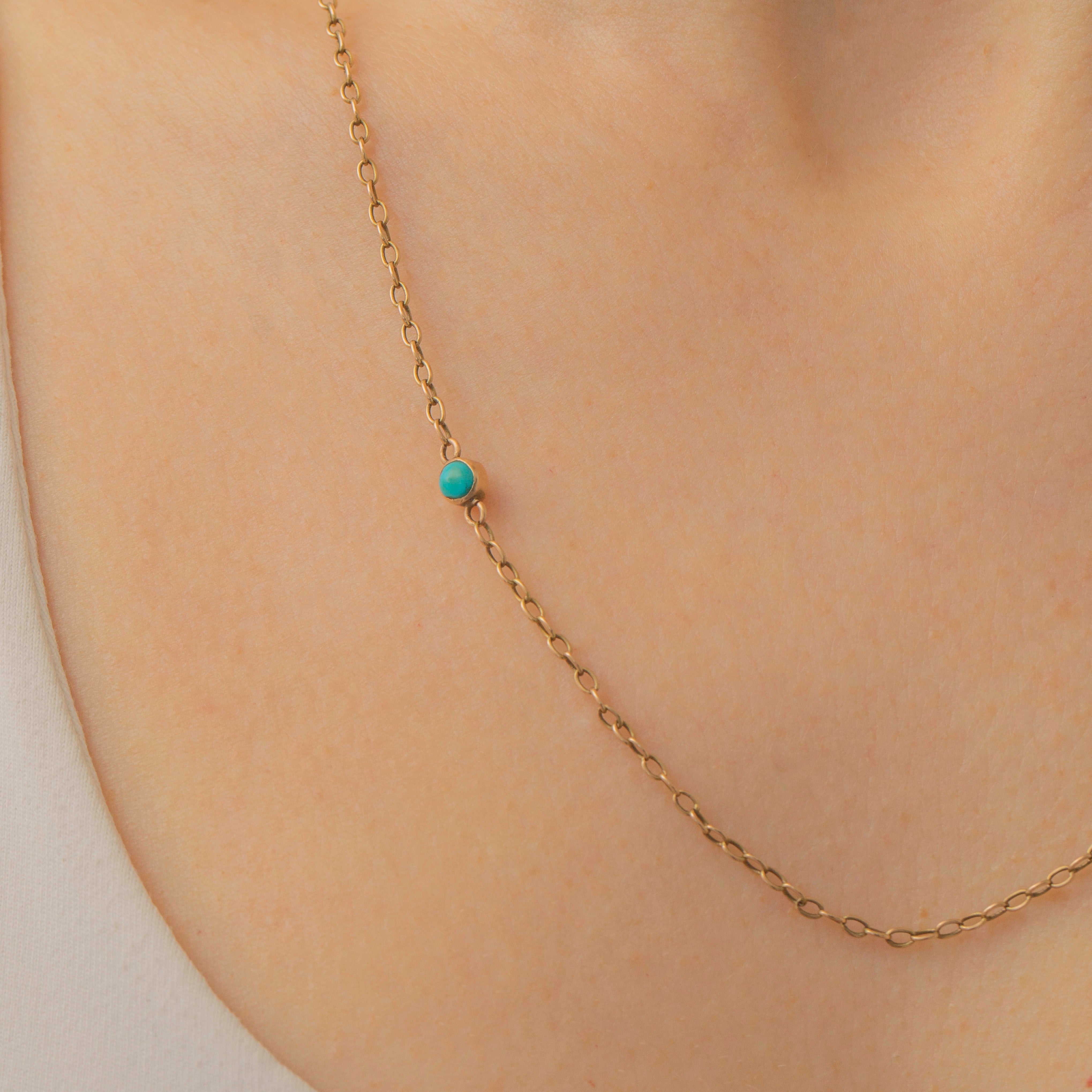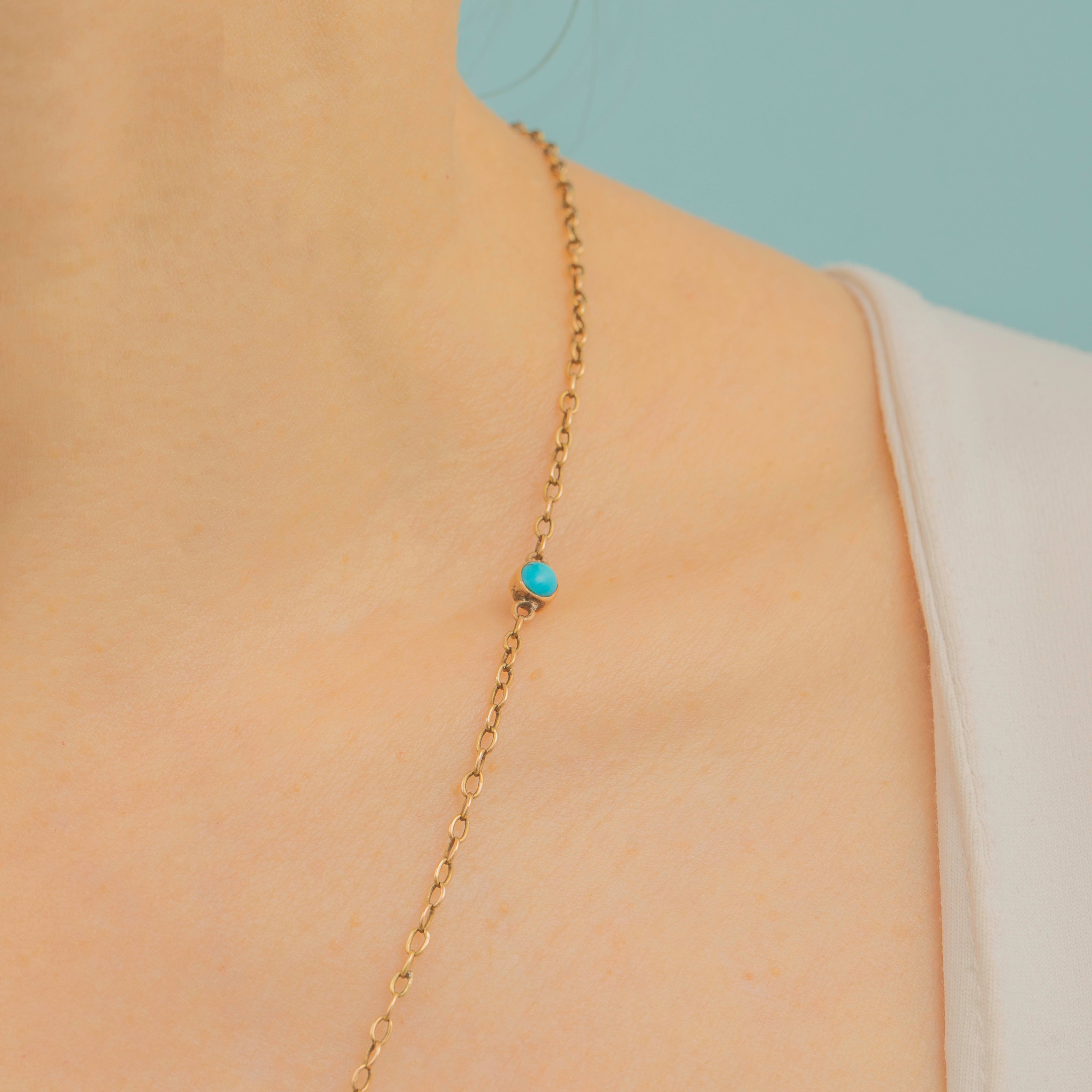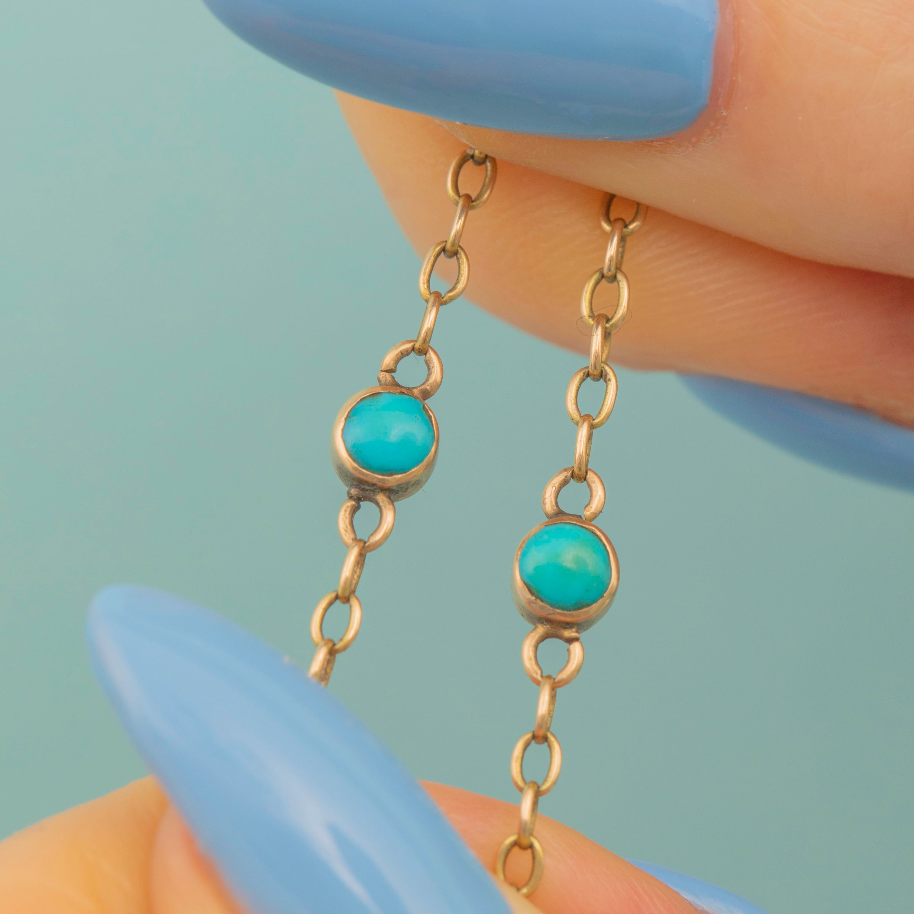 This antique 15ct Gold Turquoise beaded chain is truly stunning! Crafted from a brightly saturated 15ct Gold, the chain is interspersed with bright blue Turquoise stones for an eye-catching finish.