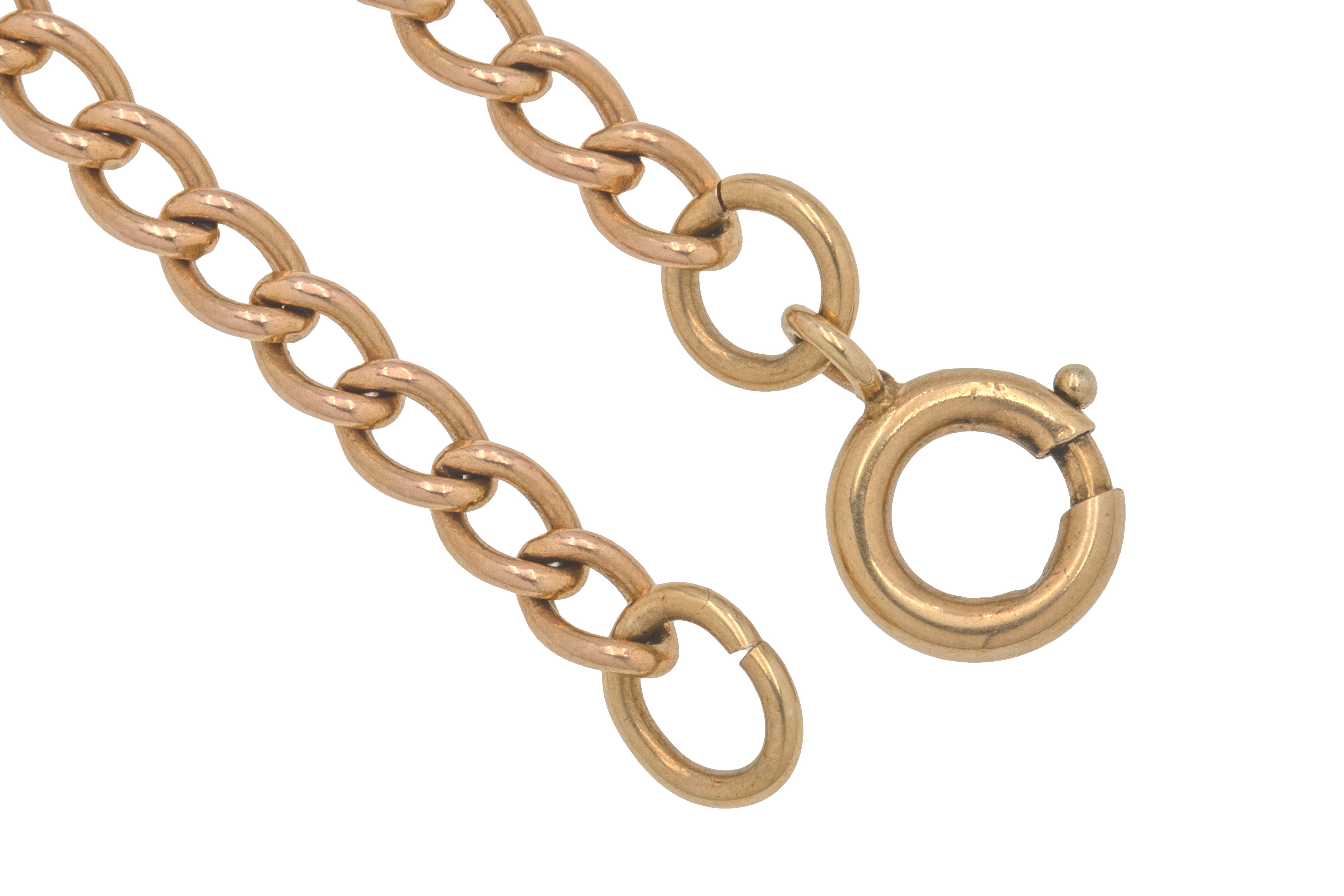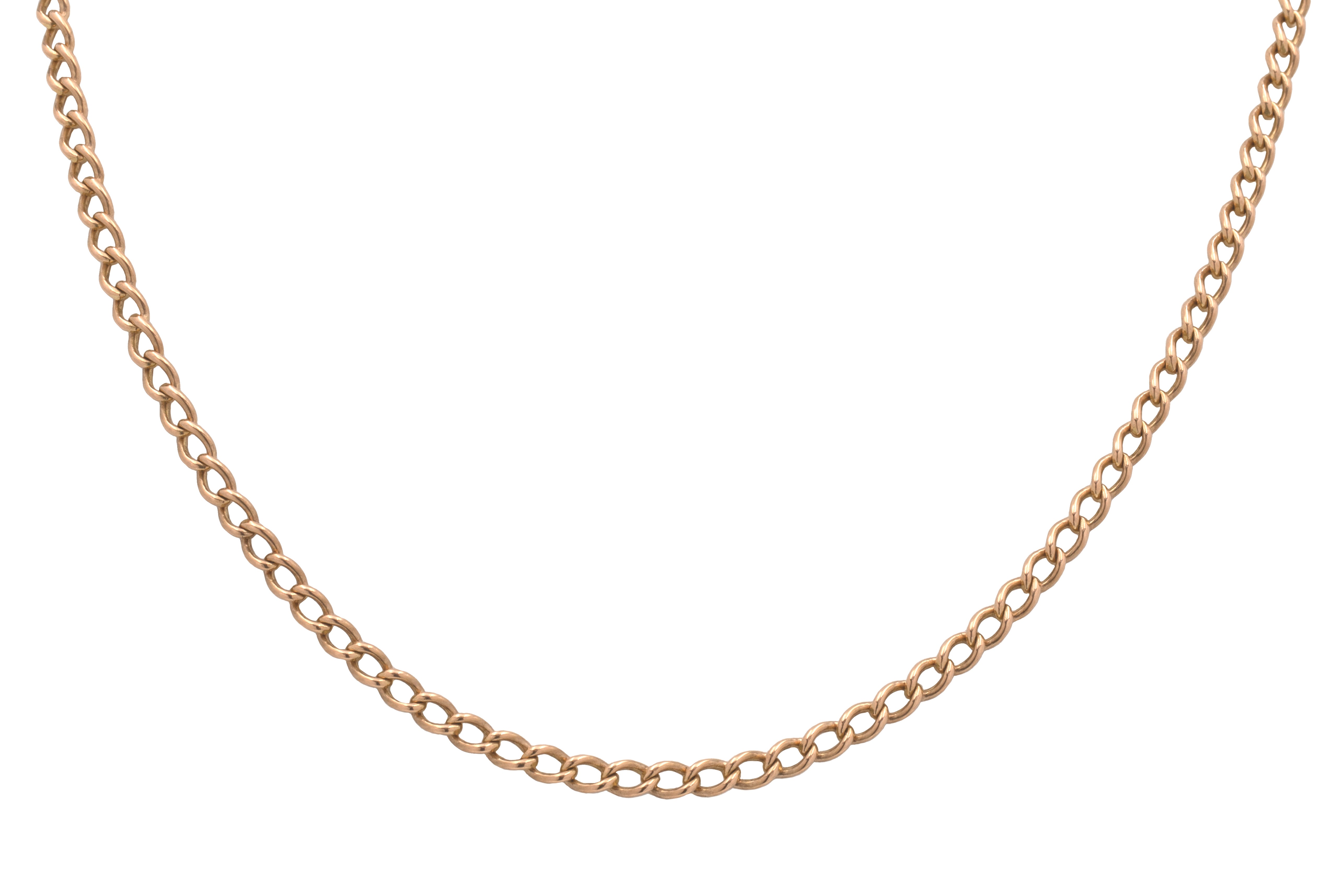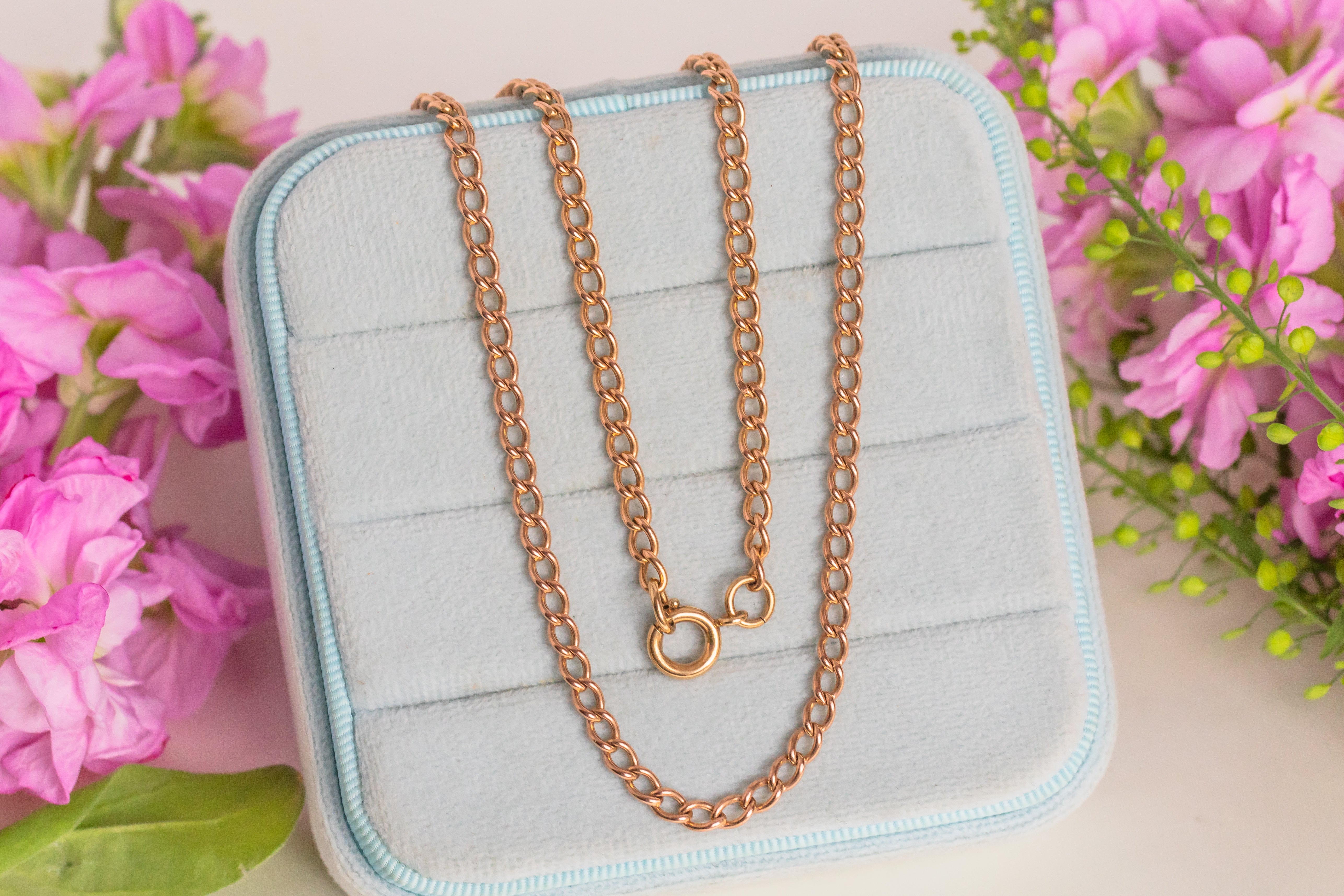 EXCELLENT. With little to report, this 26.5" antique 9ct Gold curb chain is in excellent condition! Her links are smooth to the touch, free from damage, and have a radiating glow throughout. The bolt ring is in perfect working condition allowing you to wear it securely with the utmost comfort!