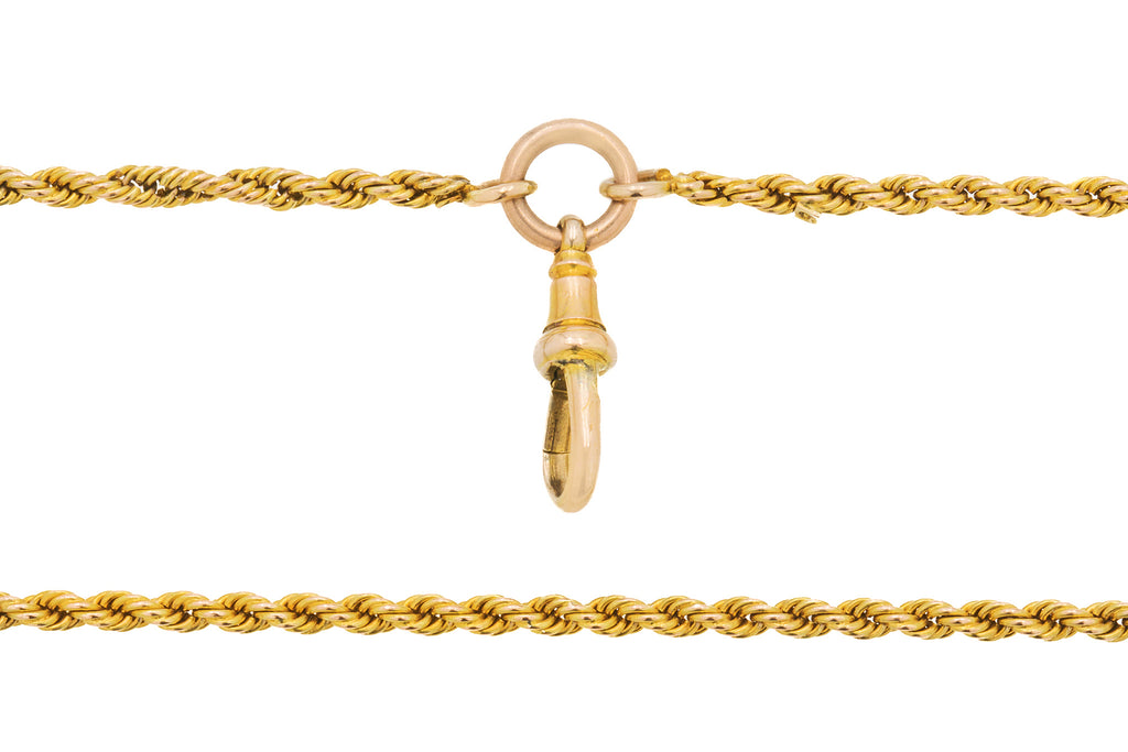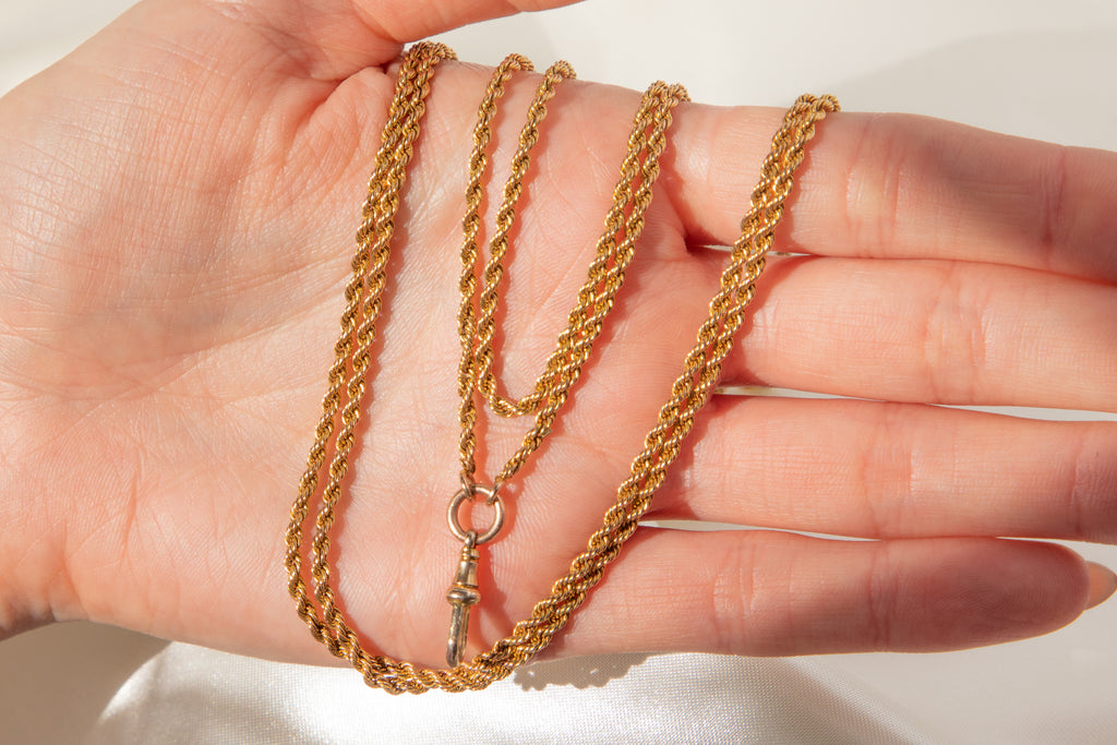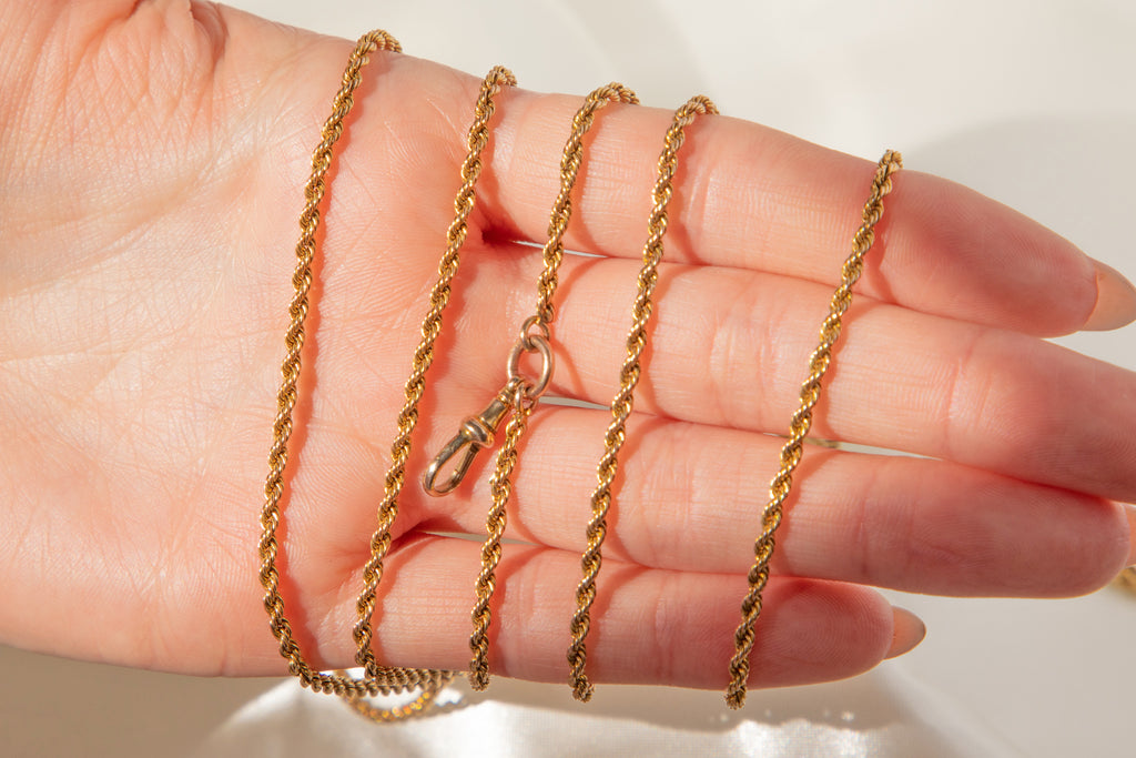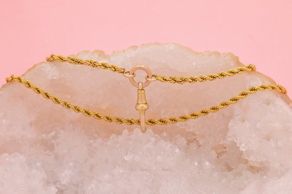 This 58.5" Victorian 9ct Gold longuard rope chain is a sensational piece of antique jewellery! Complete with a solid 9ct Gold antique dog clip, there are endless ways to style this Victorian Gold chain. Whether you choose to create a layered look by wrapping her around multiple times or even use her dog clip to attend to all your charm holding needs, this rope chain will look splendorous!