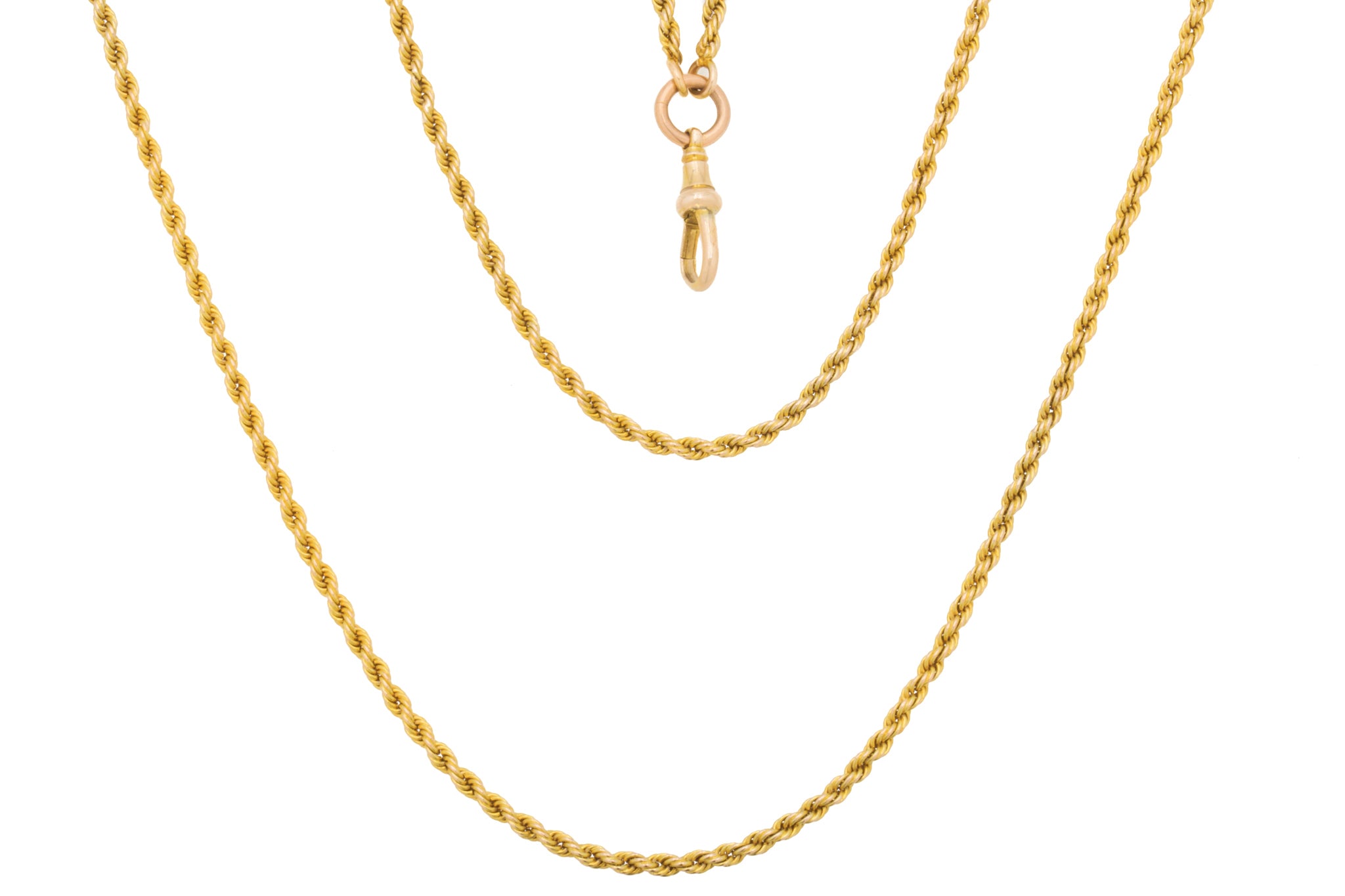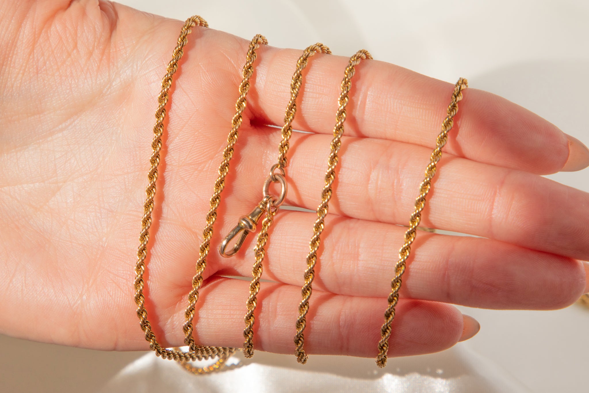 EXCELLENT: This Victorian 9ct Gold longuard rope chain is in mint condition throughout! The rope chain is beautifully interwoven and her smooth touch means she glides through your fingers with ease. With her incredibly bright hue, she is a testament to its perfect preservation. An antique we think you will wear on every occasion!