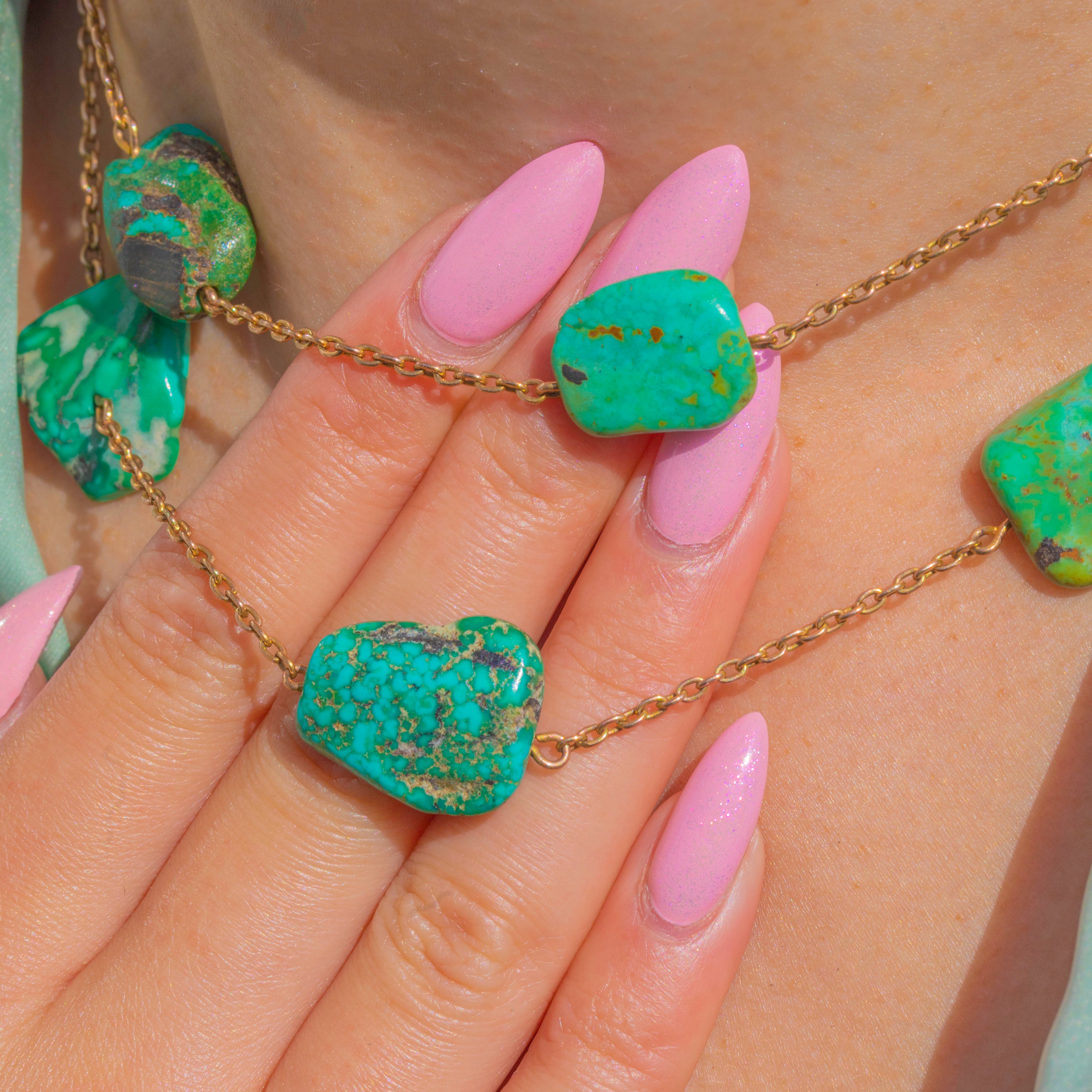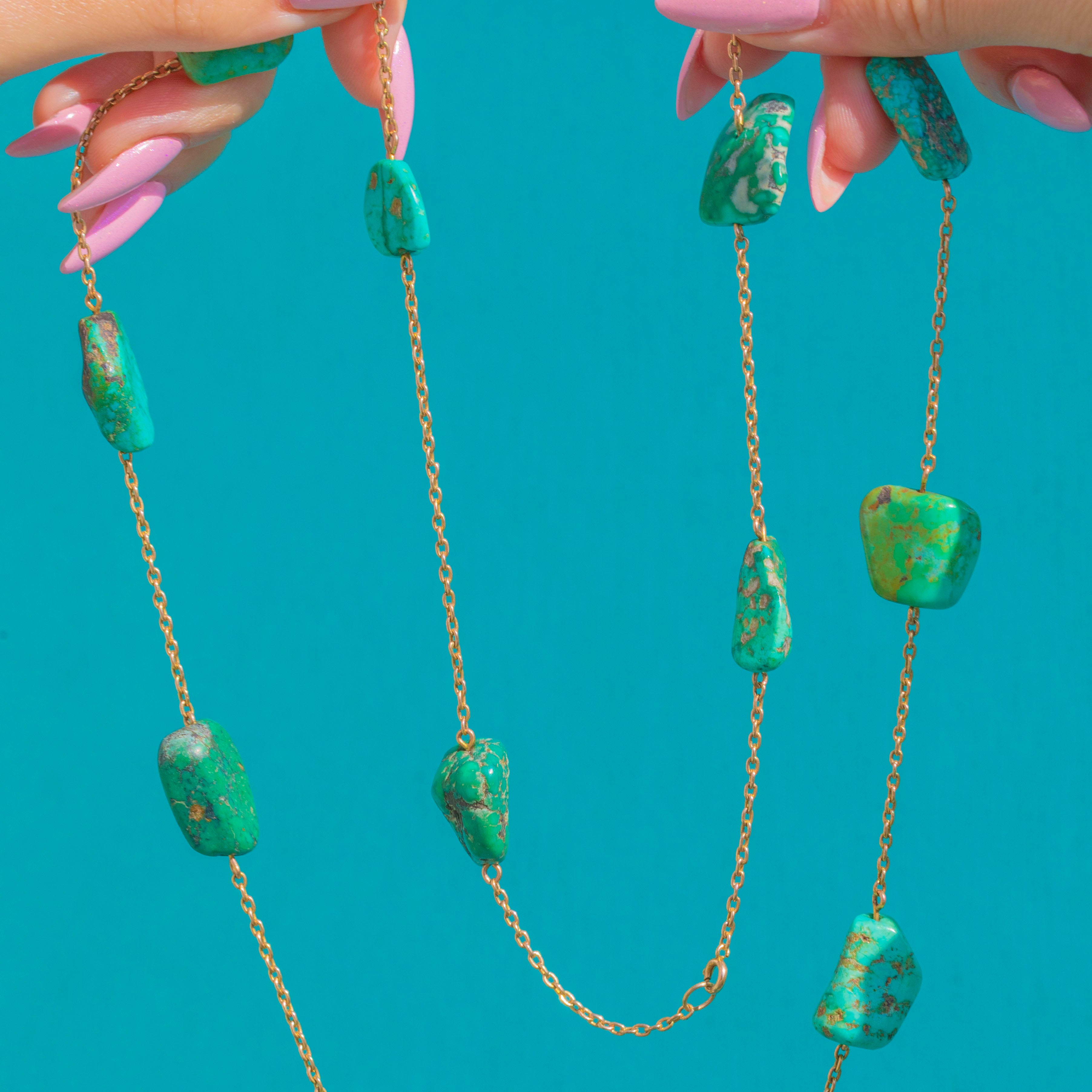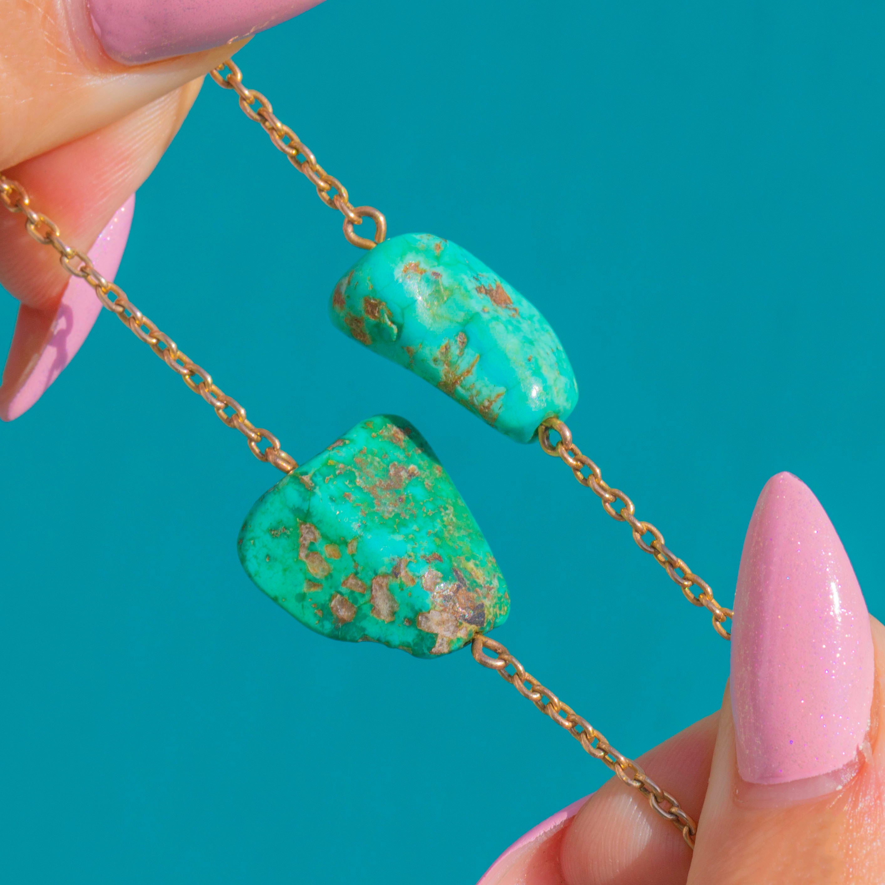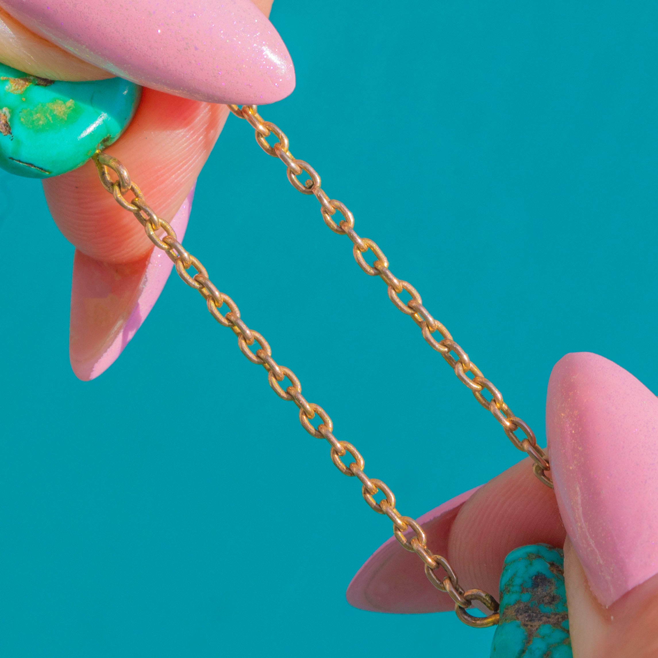 Glowing with character and colour, this antique 9ct Gold Turquoise necklace is pure joy to wear. An array of natural Turquoise stones showcases unique patterns and hues from cool mint to deep forest green, their beautiful matrix giving the piece an organic, earthy allure. The warm glow of 9ct Gold provides the perfect counterpoint, lending sophistication and effortless elegance.