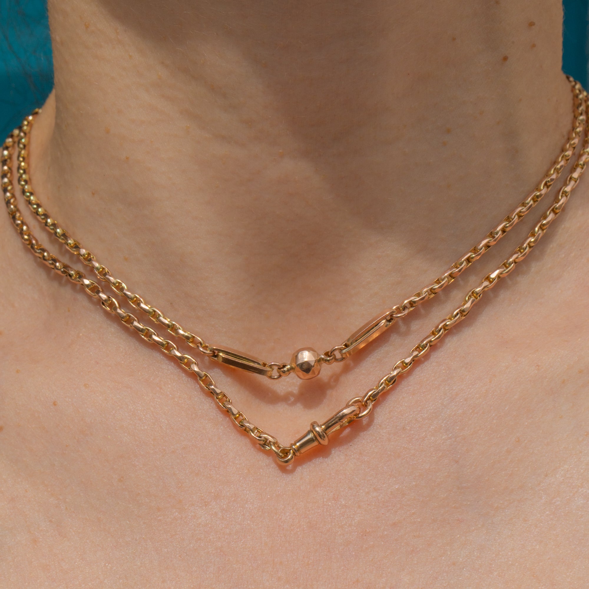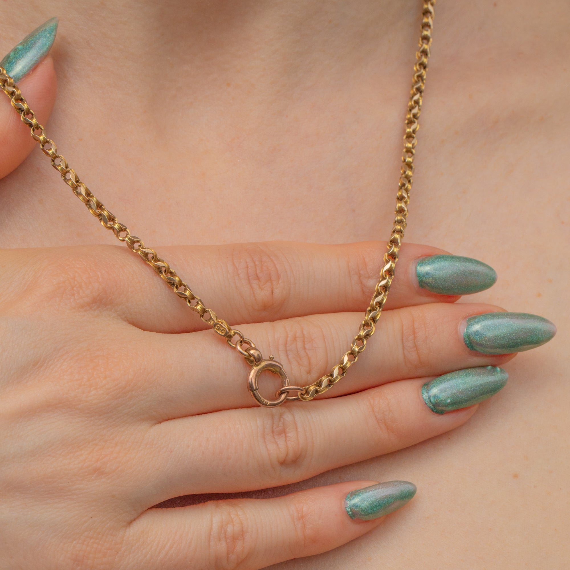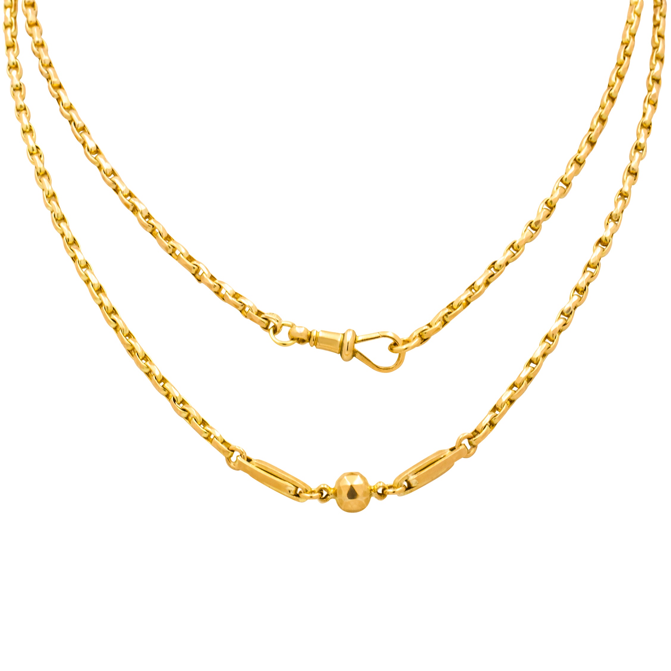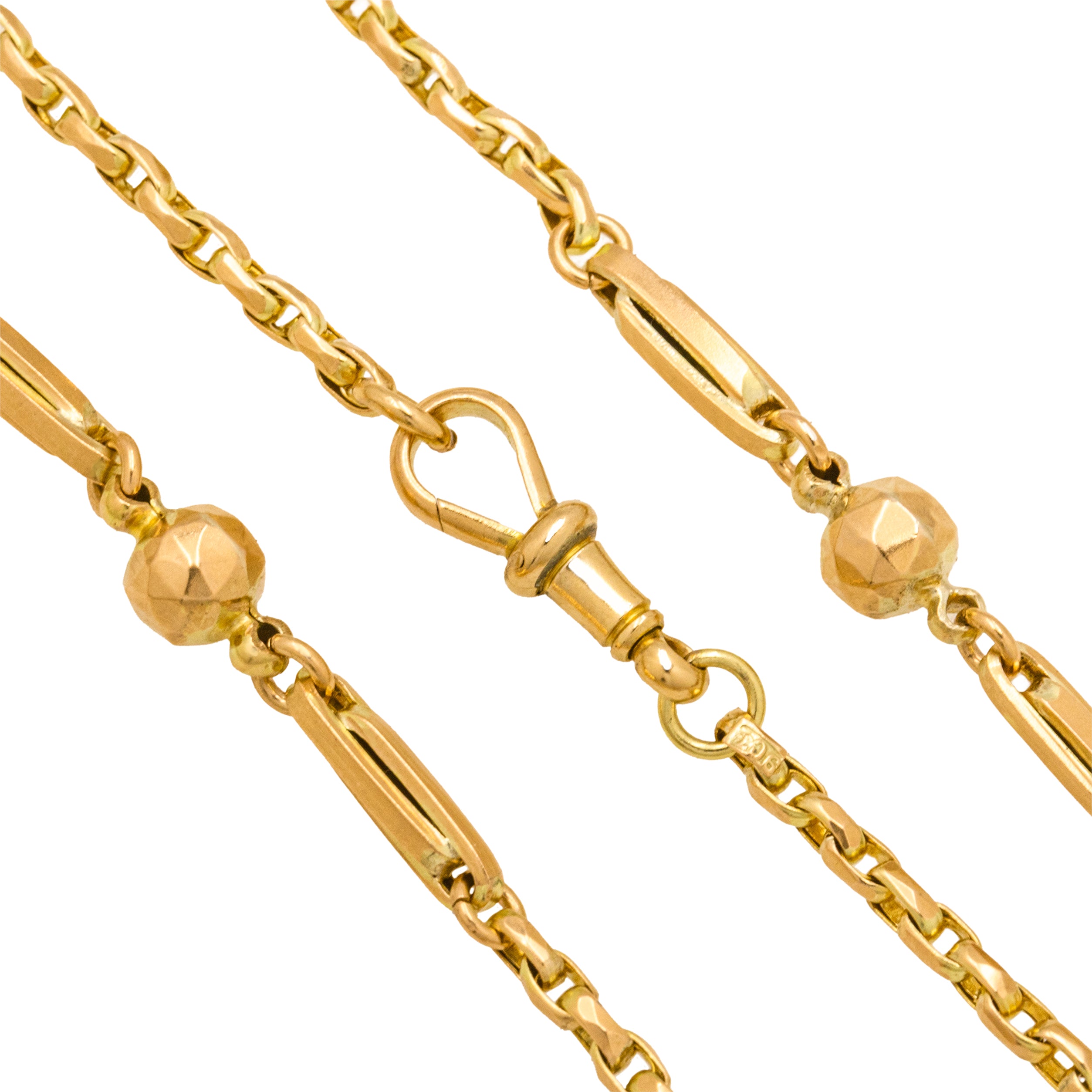 EXCELLENT. This 30.5" antique 9ct Gold ball and fetter belcher chain is in excellent condition throughout. The Gold is buttery and each link is securely connected and free from dings or dents. With a perfectly functioning dog clip, you can wear this splendid Victorian Gold chain confidently!