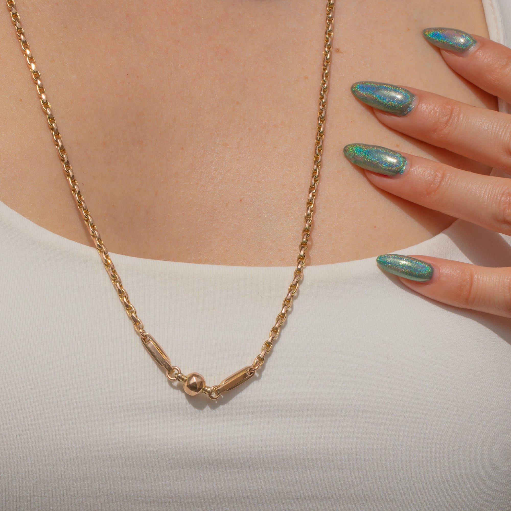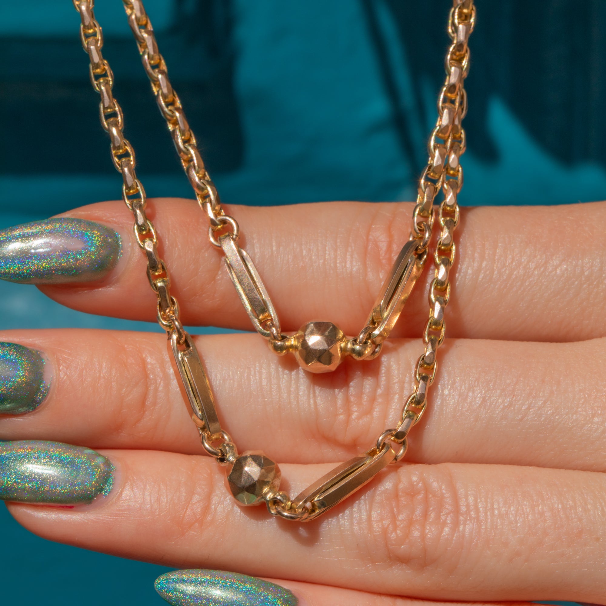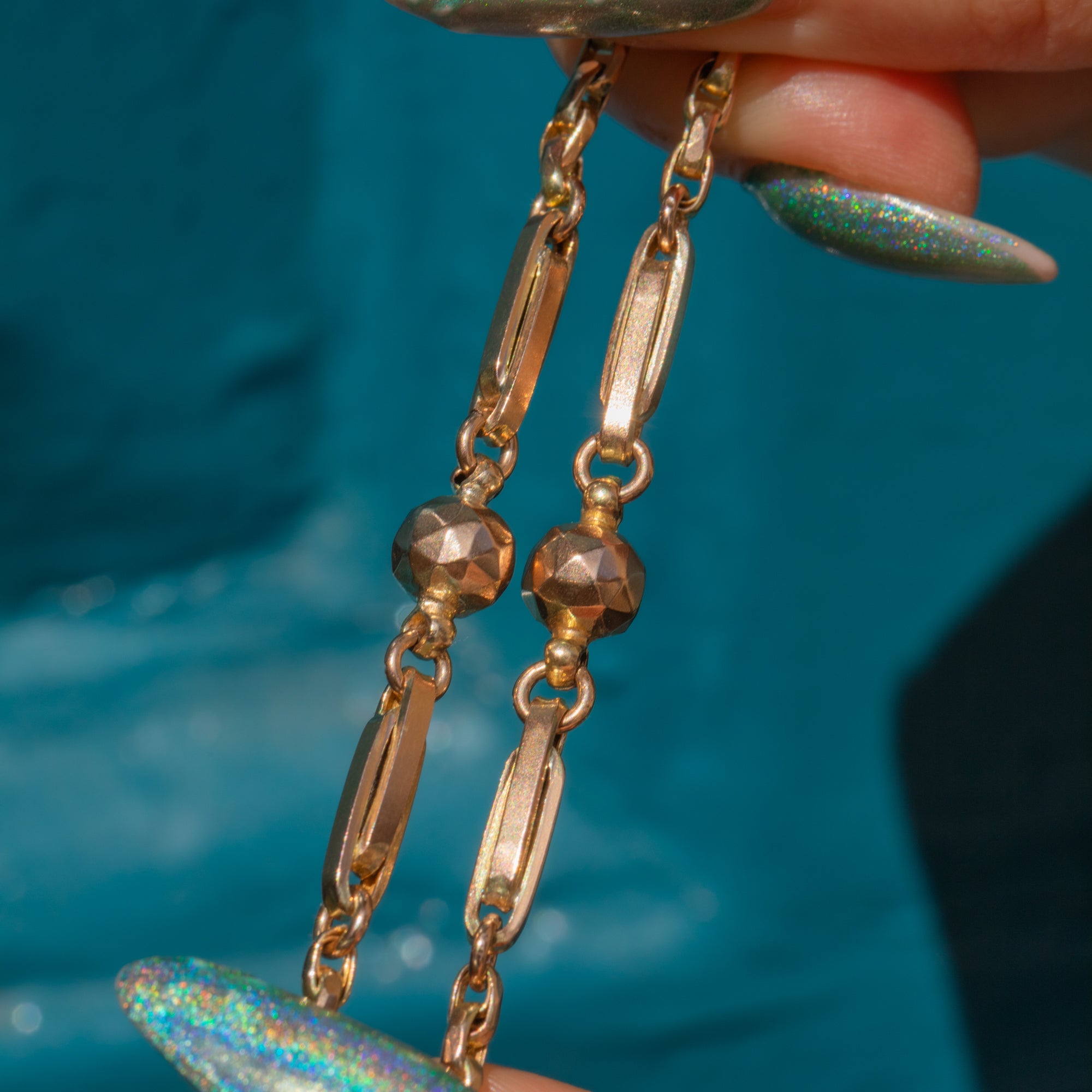 This 30.5" antique 9ct Gold ball and fetter belcher chain is a slice of heaven! Intwined amongst her belcher links are striking ball and fetter links providing a mesmerising glisten as they beam beneath the light.