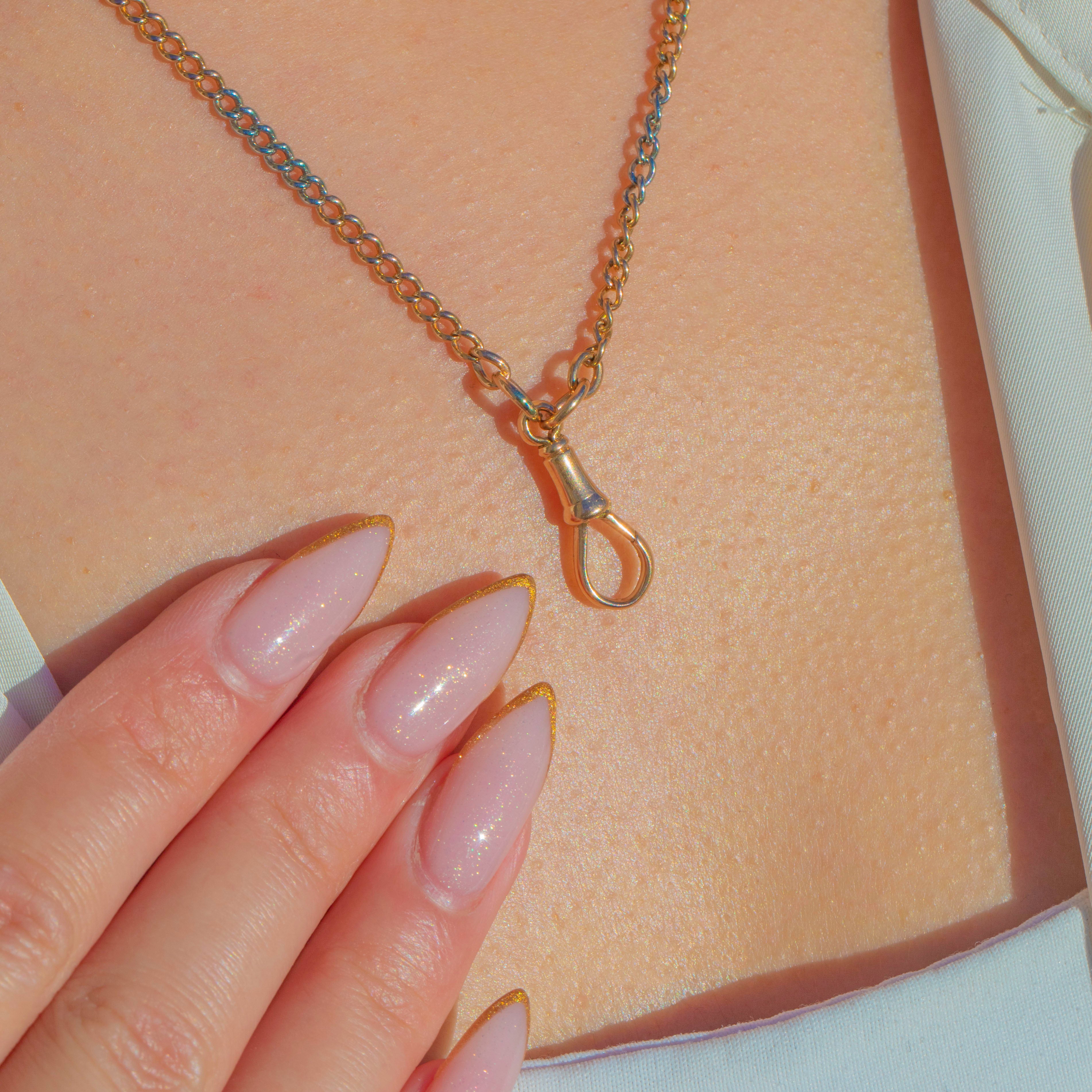 VERY GOOD: The chain links are strong with light surface wear in keeping with age and use. The dog clip closes securely and is ready to hold charms or pendants. Overall a beautifully preserved piece, ready to wear.