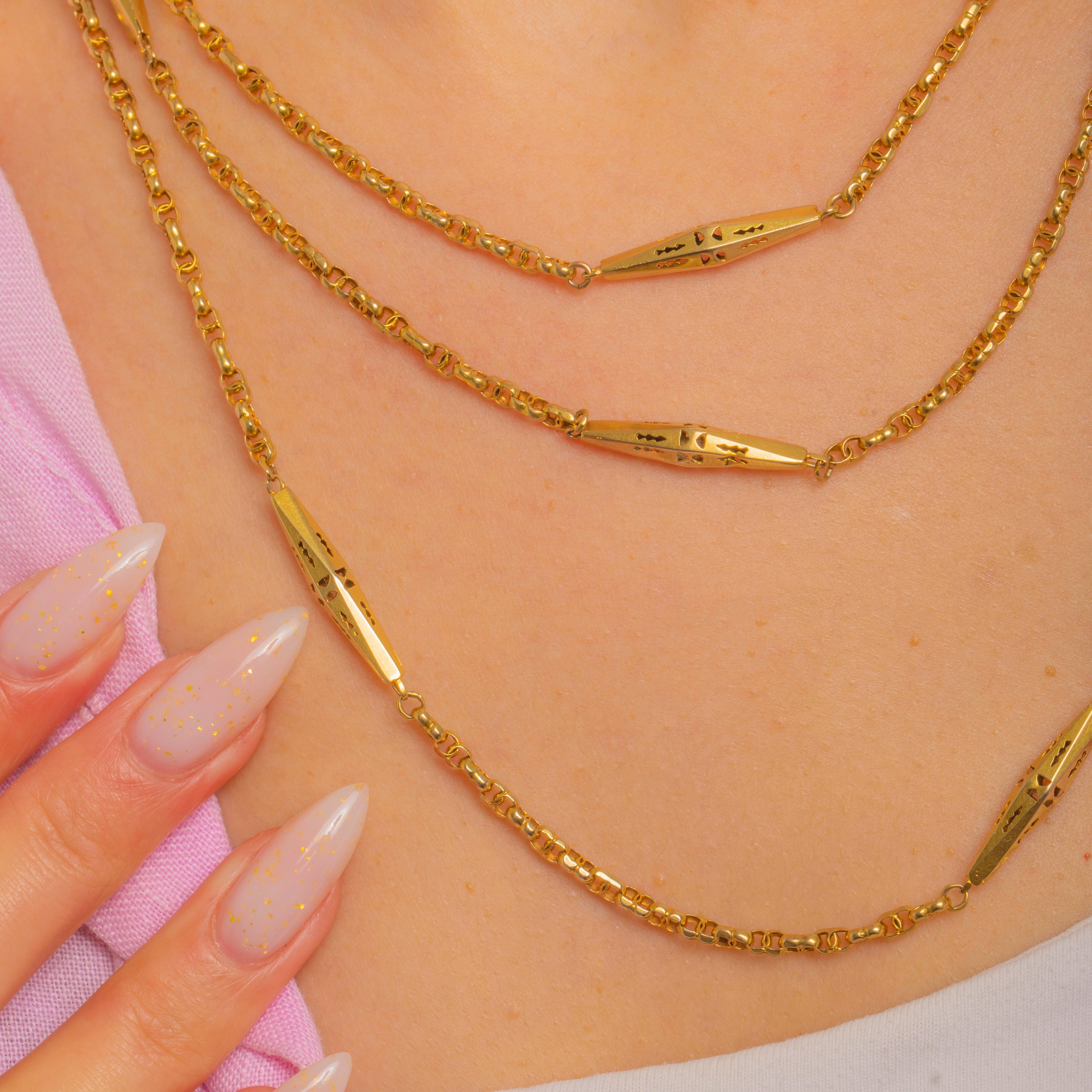 An exquisite Victorian longuard chain, this 63" sautoir is composed of elegant pierced lozenge stations in glowing 9ct Gold, linked by a fine, uniform fancy chain. Each elongated navette is light-catching and airy, with delicate geometric cut-outs and subtle engraved accents that lend beautiful texture and finesse.