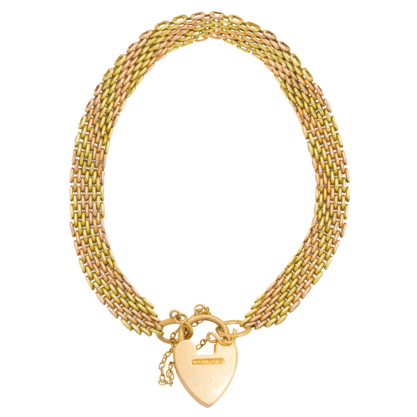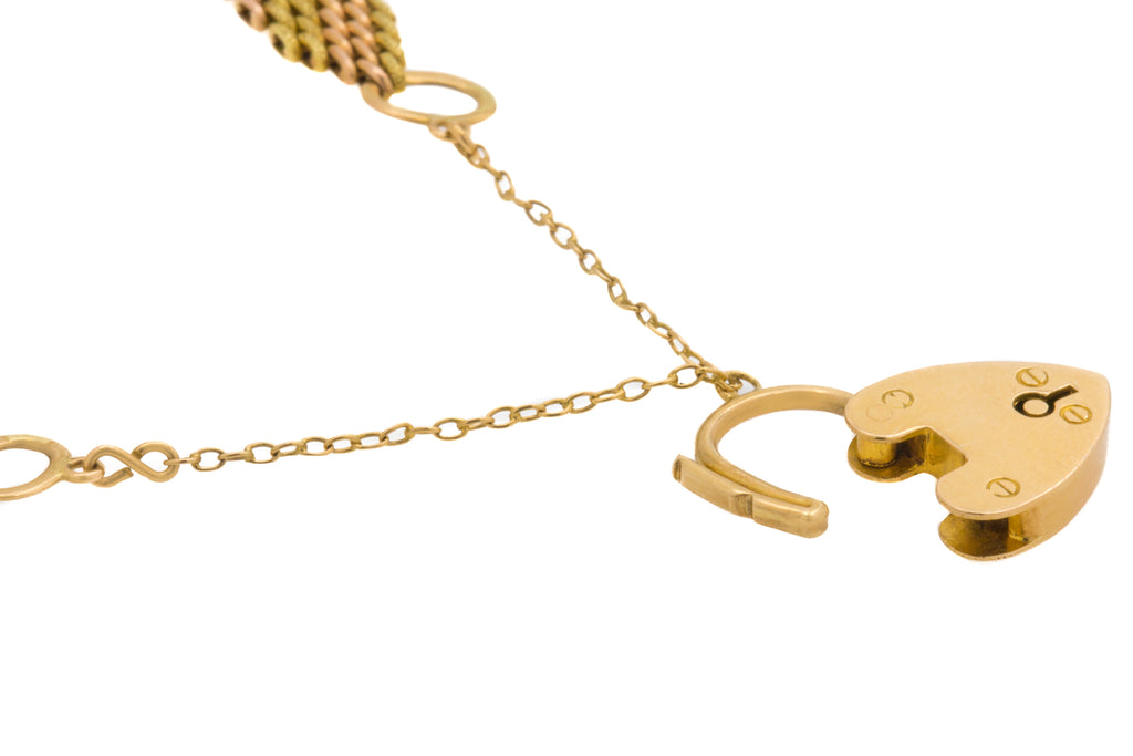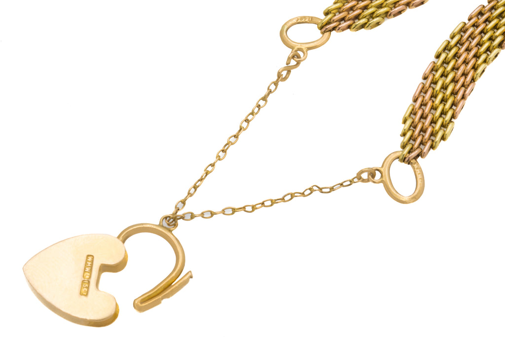 7" Antique 15ct Yellow Gold & Rose Gold Gate Bracelet, Heart Padlock, 16.1g