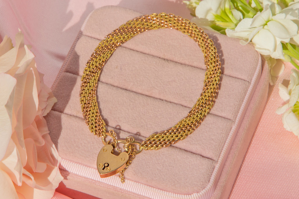 A gorgeous 7" antique 15ct yellow Gold and rose Gold gate bracelet complete with a heart padlock. The textural links crafted from both rose and yellow Gold add a unique touch that we simply adore!