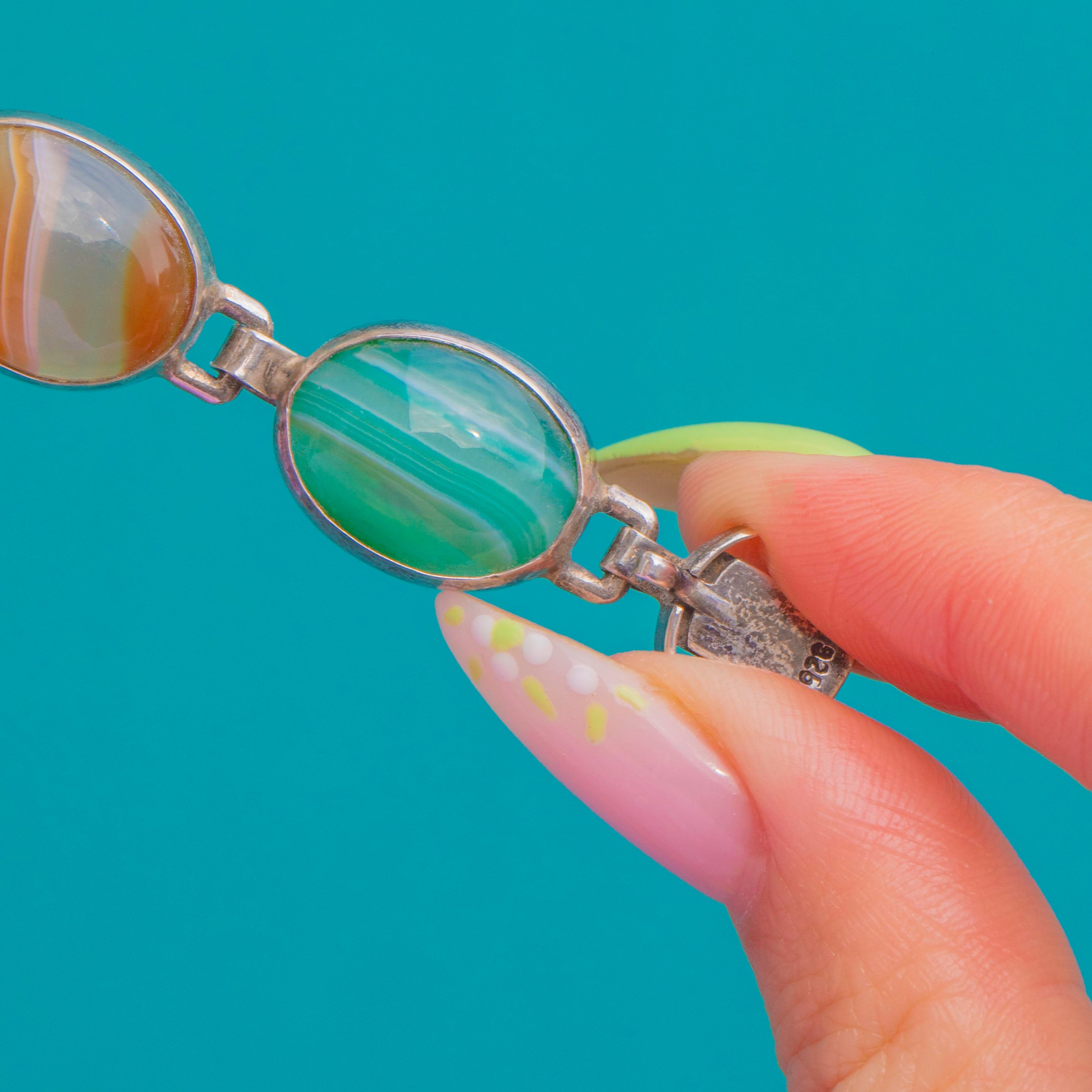 Alive with colour and character, this Art Deco Sterling Silver bracelet parades a joyful spectrum of domed cabochons in sleek bezels, articulated for beautiful movement on the wrist. The smooth ovals showcase natural banding, mottling and translucency, creating a richly varied palette that feels both refined and effortlessly vibrant.