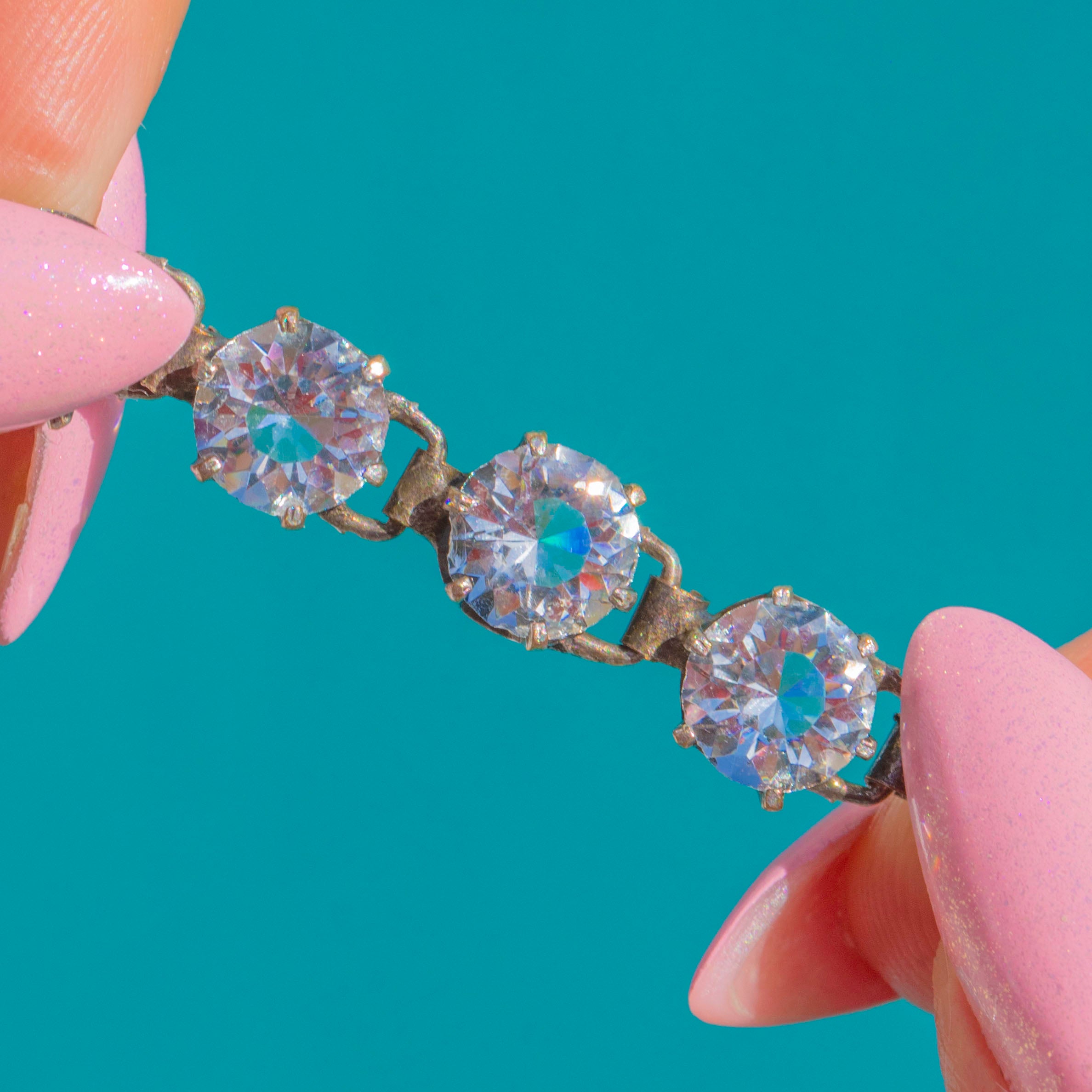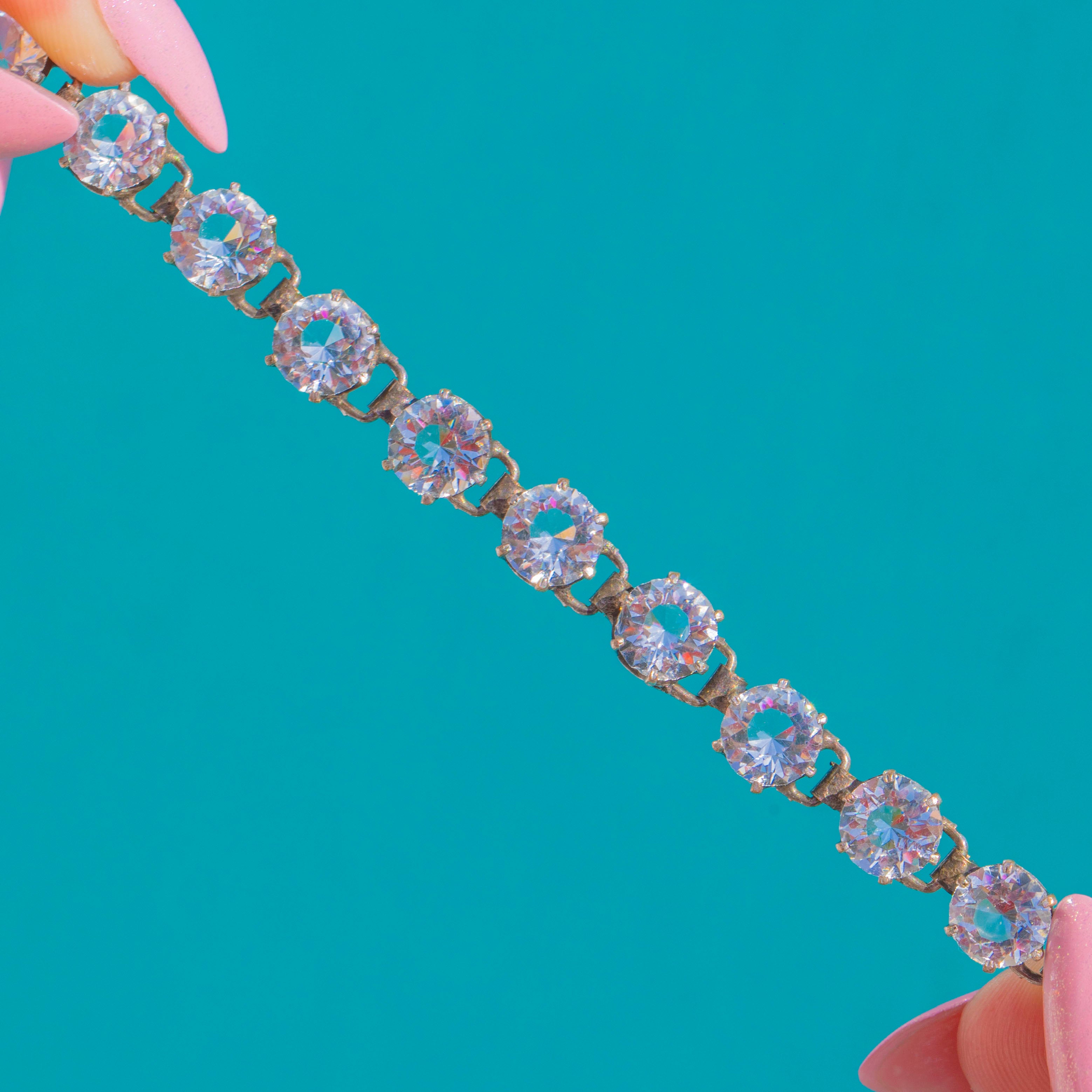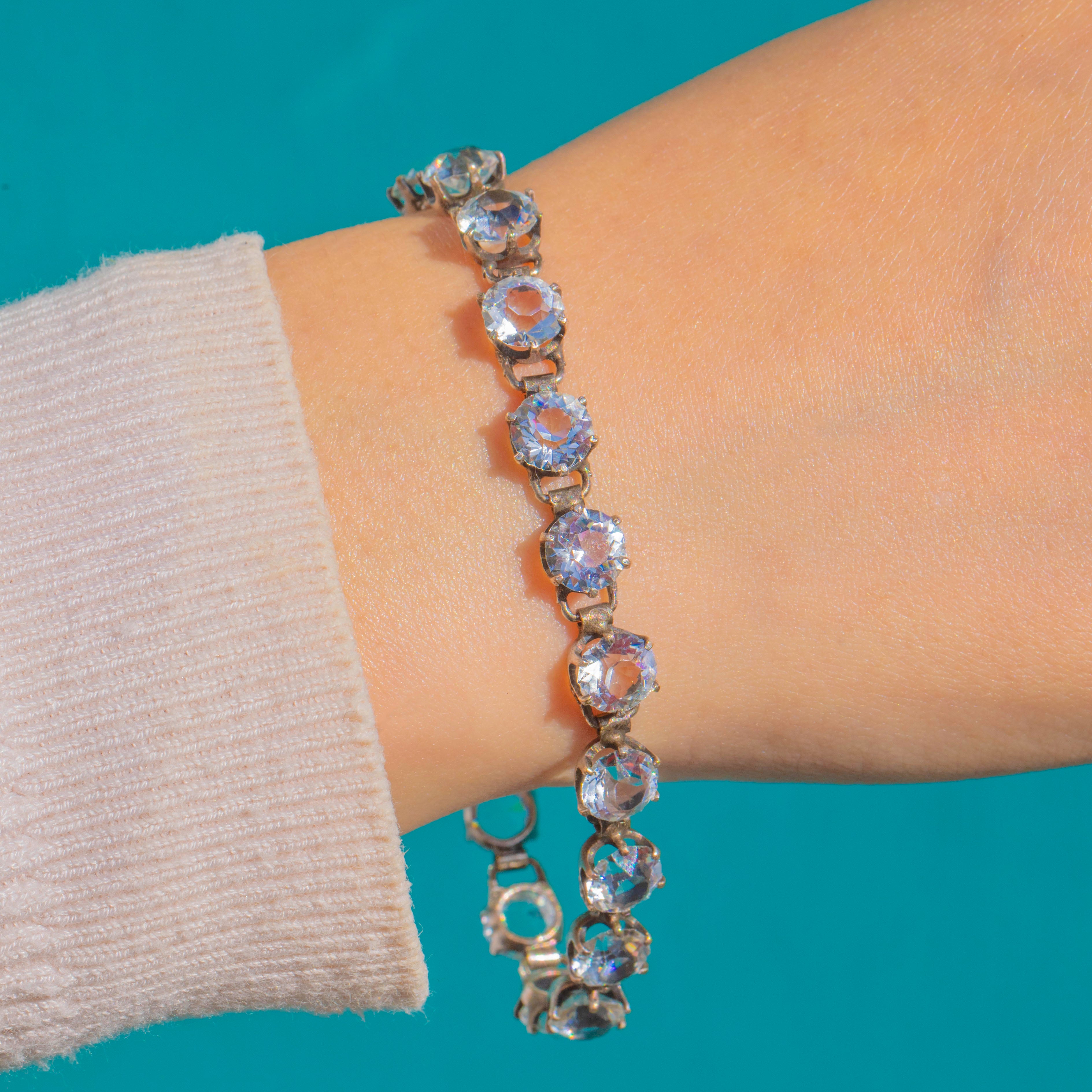 A timeless Art Deco rivière bracelet, set with a sleek single row of round White Paste that shimmer with crisp, elegant sparkle. Each stone is individually set in Silver, creating a fluid line of light that sits beautifully on the wrist.