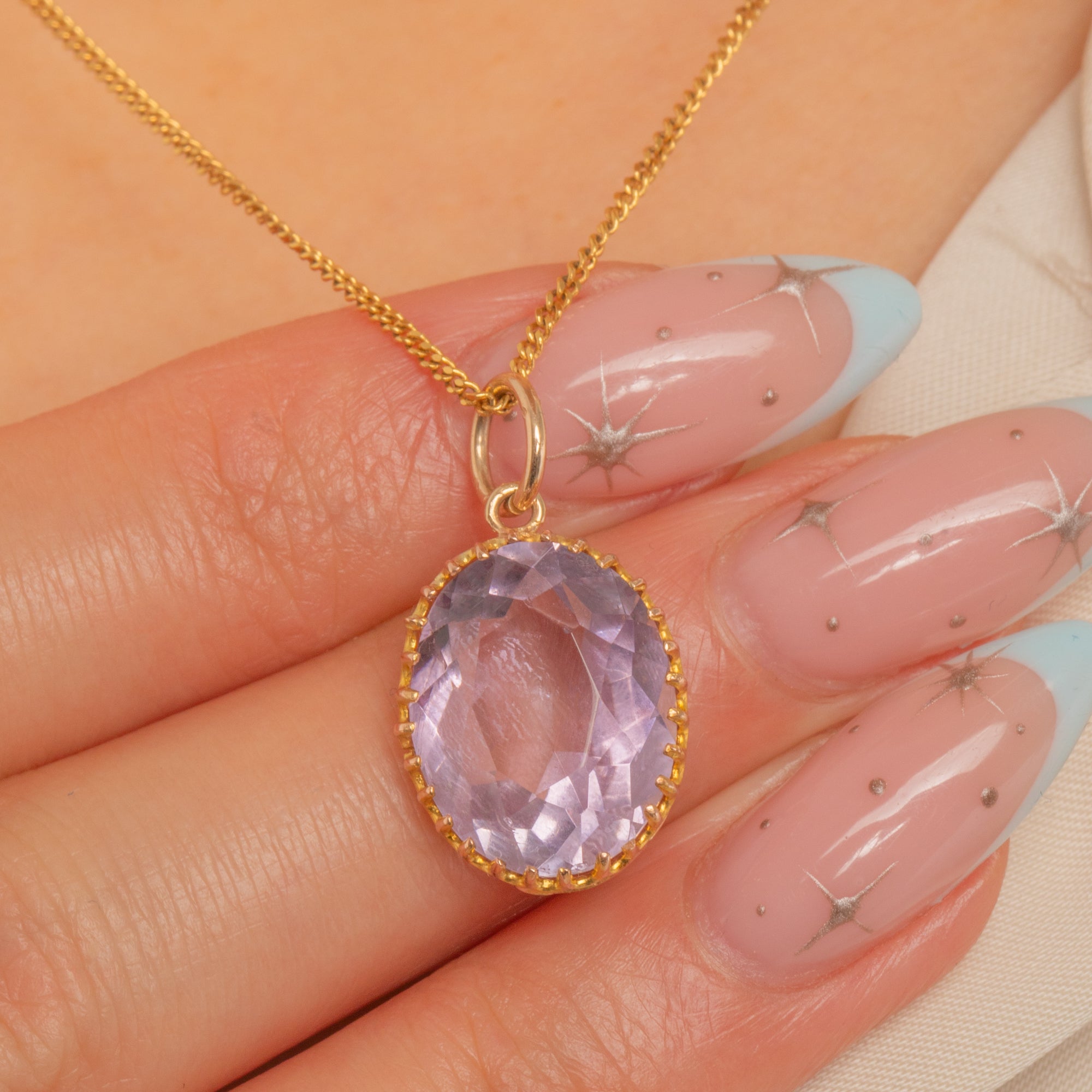 Classic Victorian in feel, the refined open-back setting and neat jump ring bail make this an effortlessly wearable piece, perfect for adding a whisper of colour to any look. With its graceful proportions and finely detailed Goldwork, it’s a timeless jewel you’ll reach for again and again.