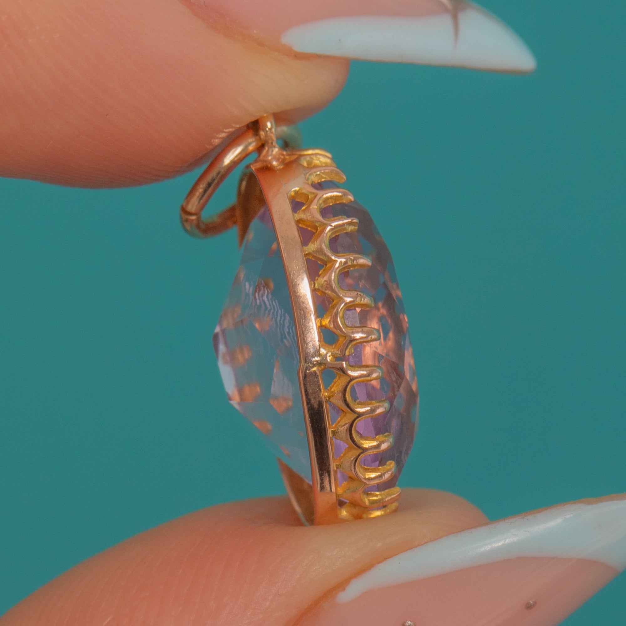 EXCELLENT: The Amethyst is bright with crisp facets and only light surface wear visible under magnification; no chips or cracks observed. The 9ct Gold coronet and openwork gallery are secure and well-formed, with a firm jump ring and minimal wear. Gentle, natural patina consistent with age; no visible repairs.