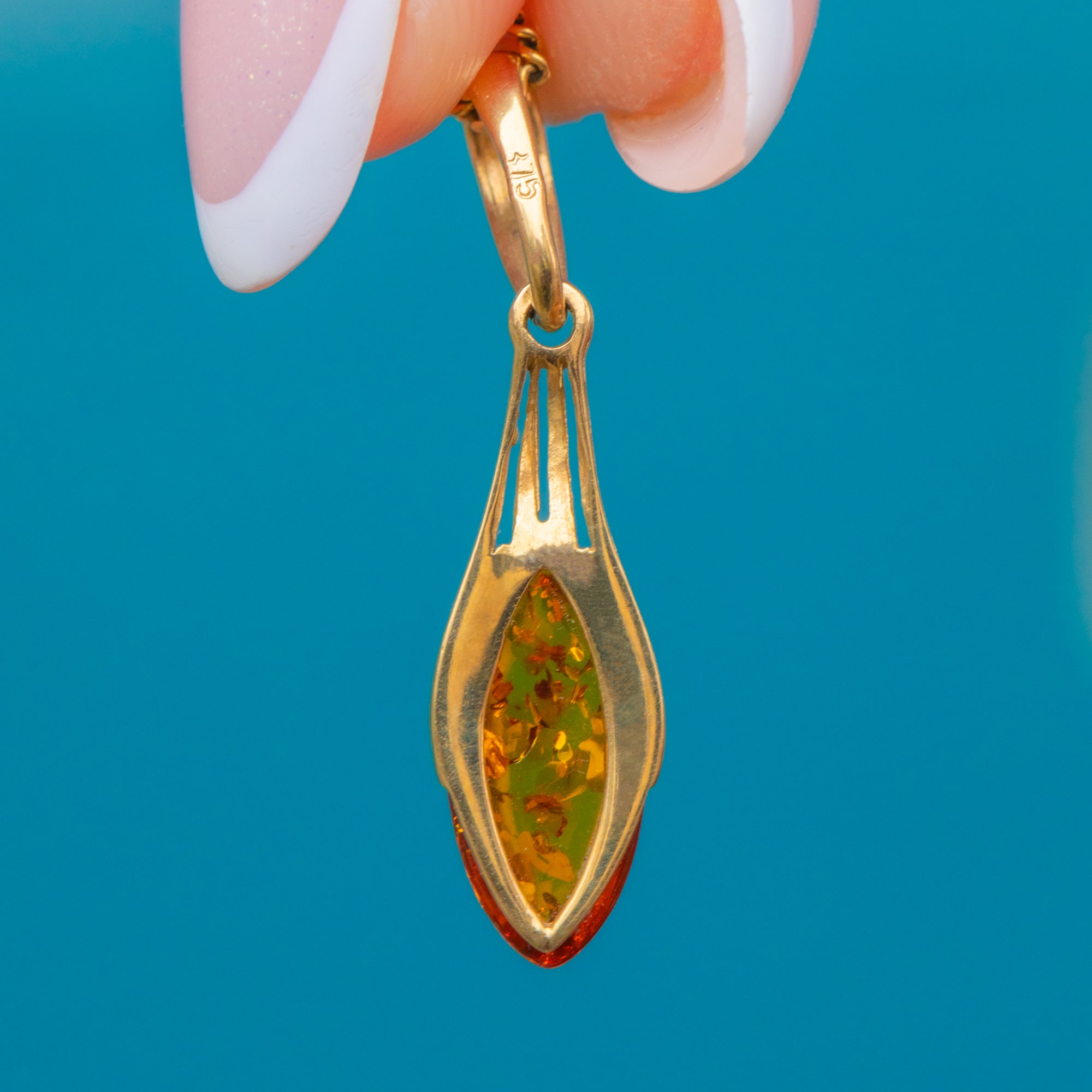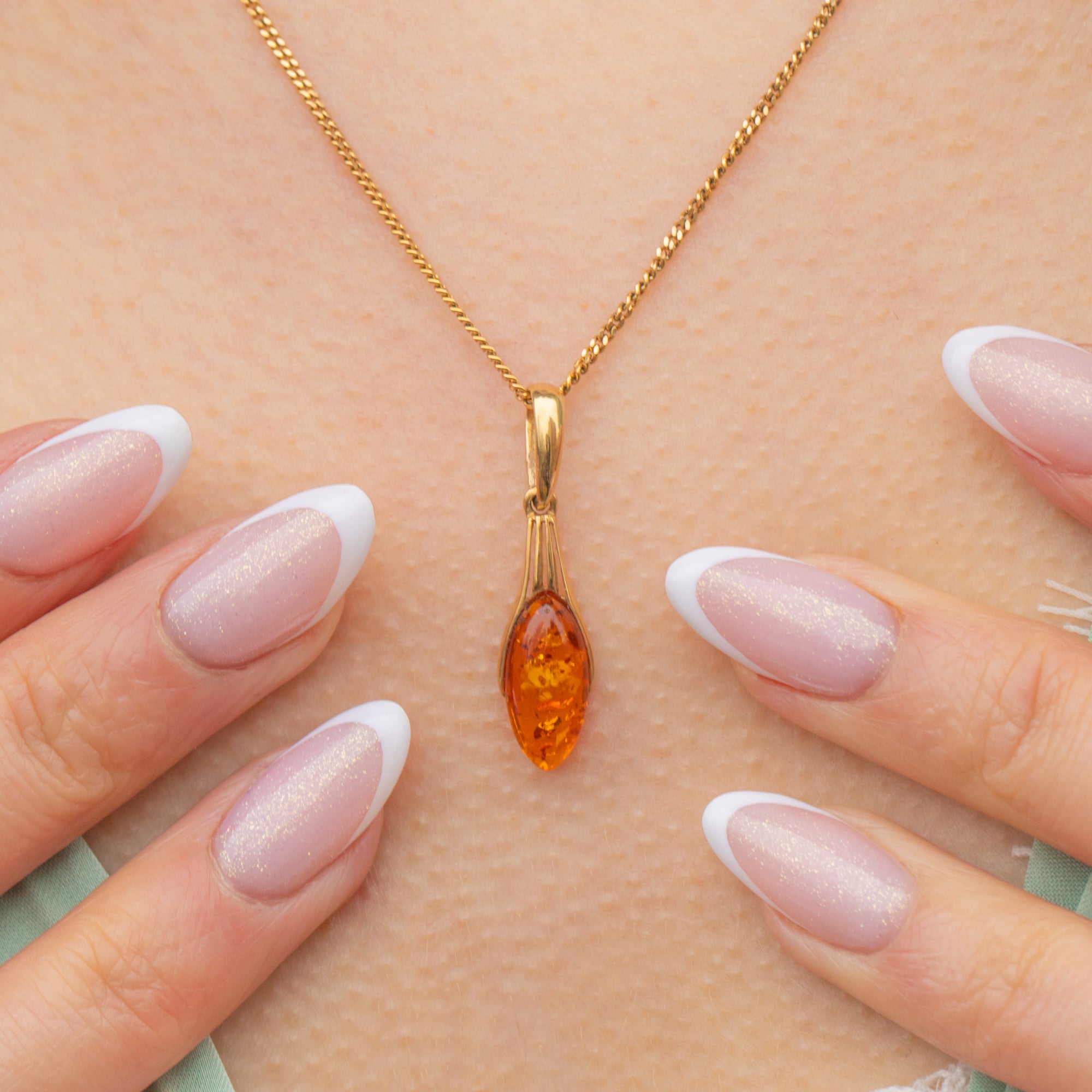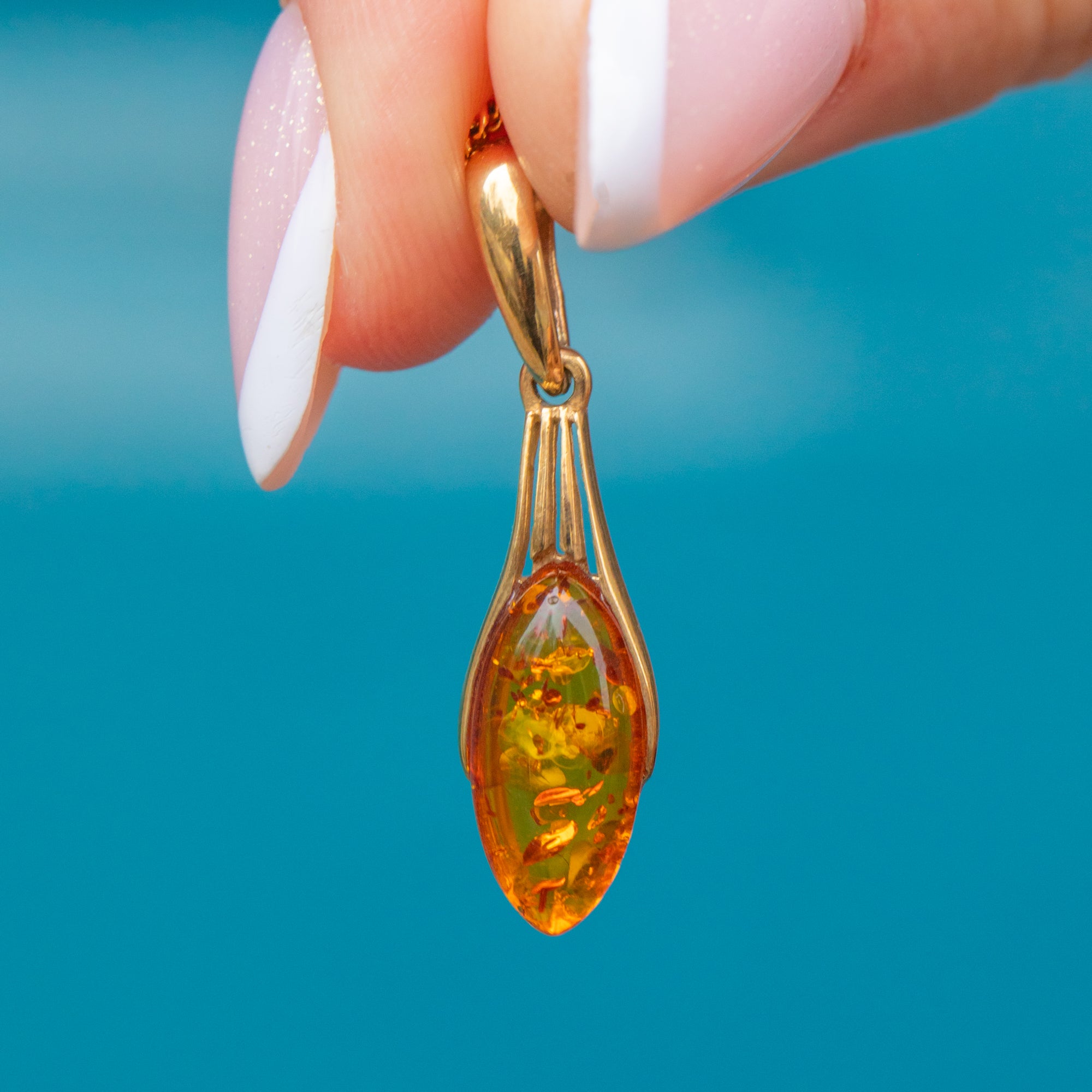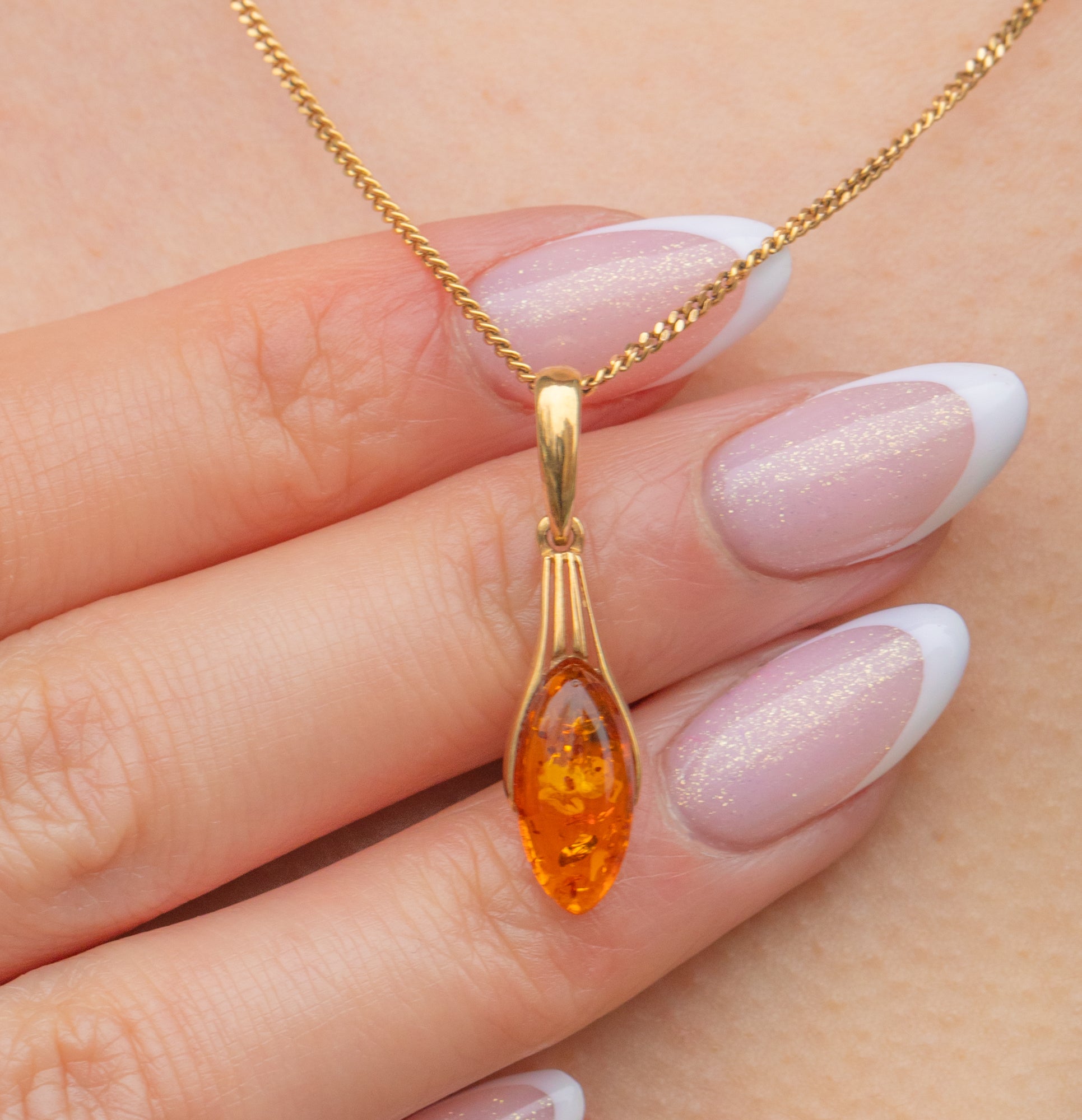 This 9ct Gold Amber charm is an elegant piece for everyday wear! The Amber displays a unique selection of inclusions within the elongated navette-shaped cabochon, its vibrant tangerine hue enhanced by the smooth, buttery Gold bezel.