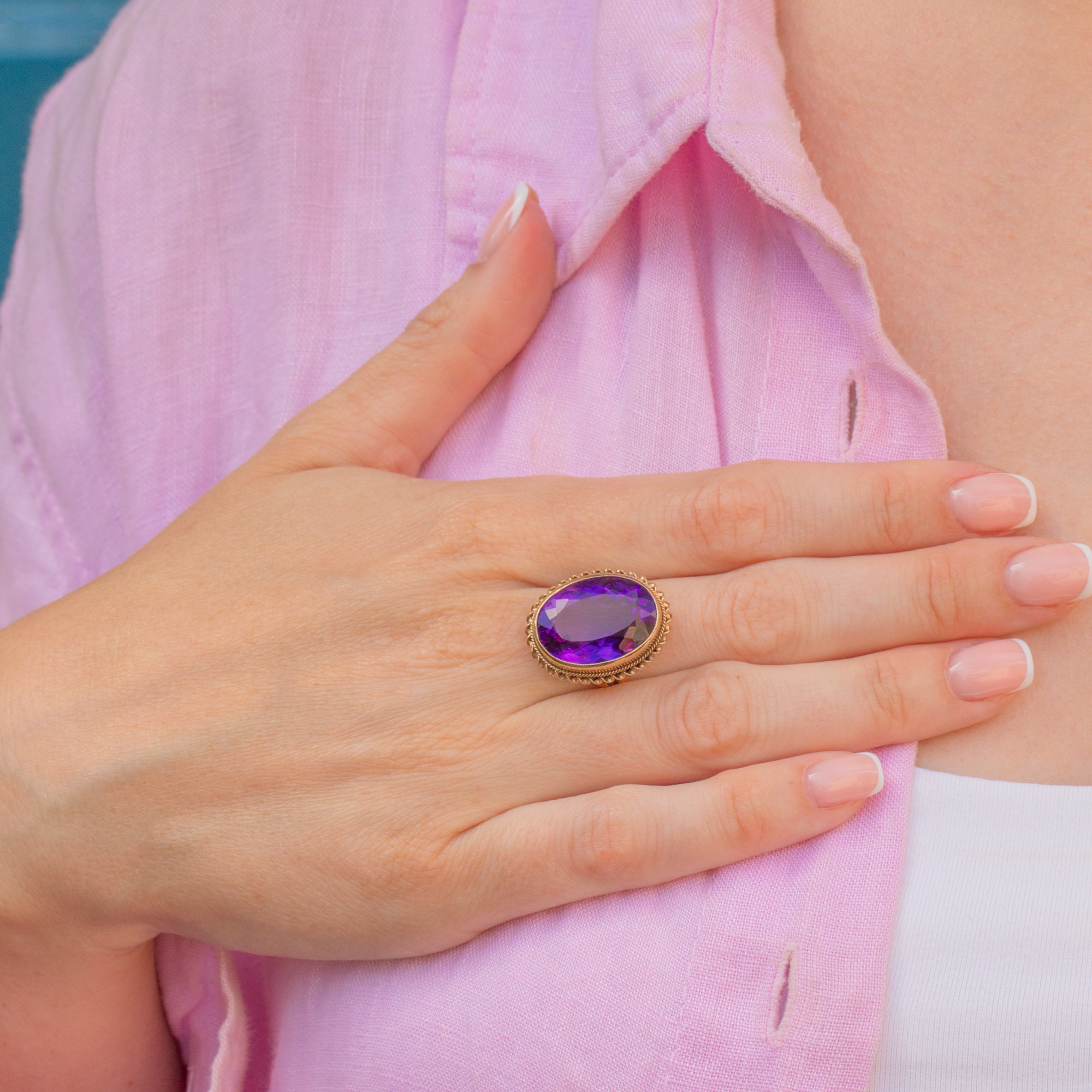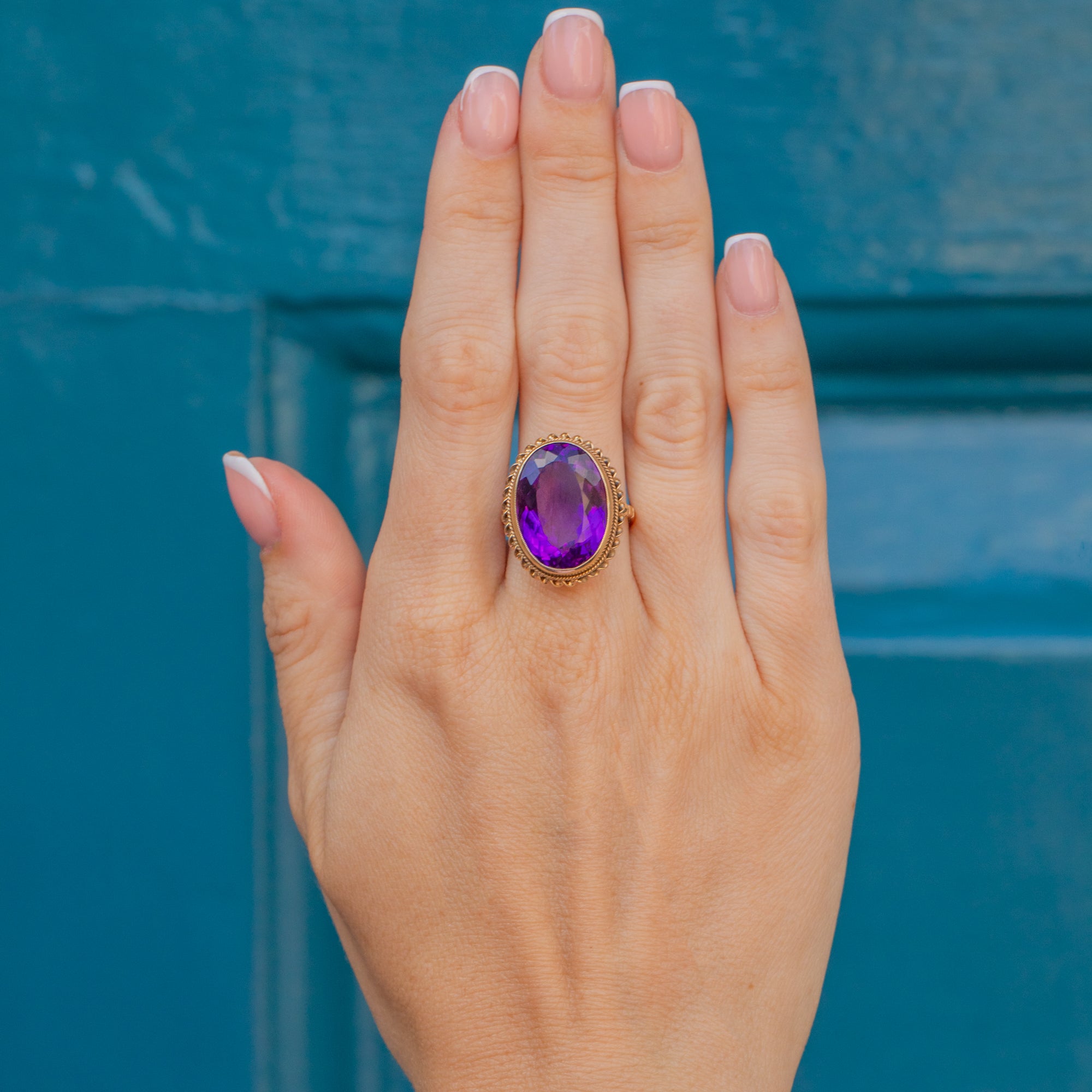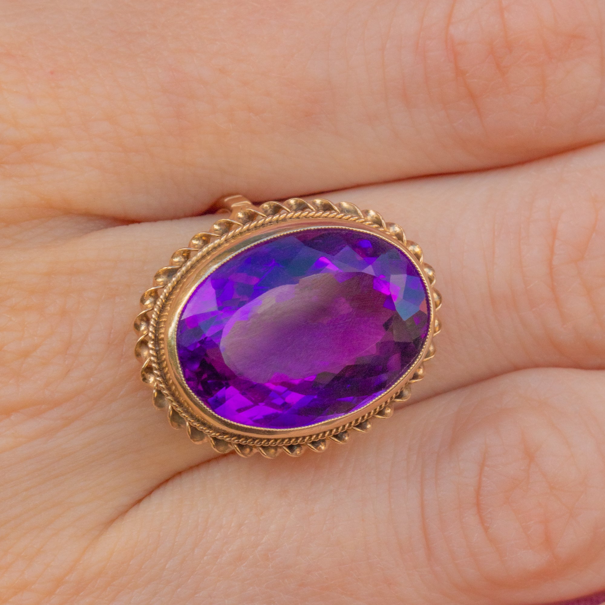 EXCELLENT. This 9ct Gold Amethyst cocktail ring is in excellent condition! The Amethyst sits secure within the bezel setting with no damage to the facets to note. The rope details are securely soldered to the bezel setting and the Gold poses no damage to note. Although the ring band isn't completely round, she sits uber comfortably, the perfect accessory for any formal attire.