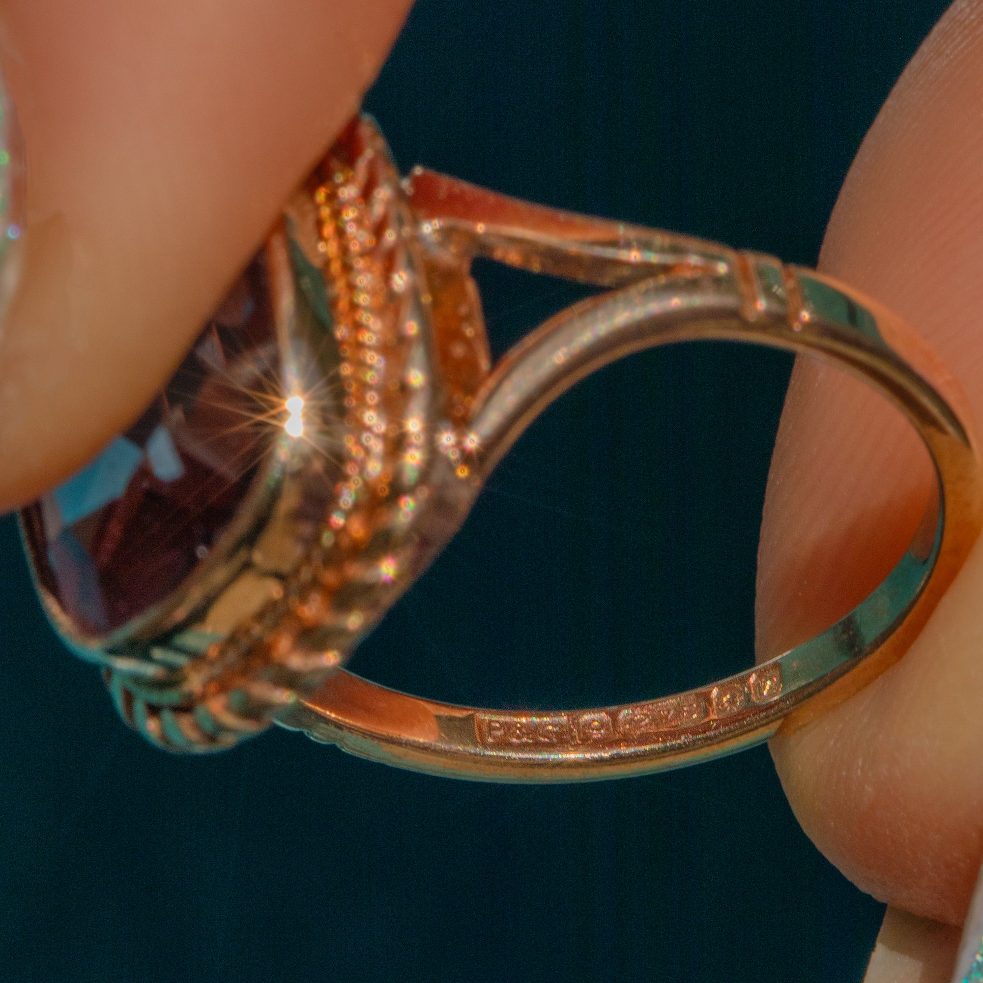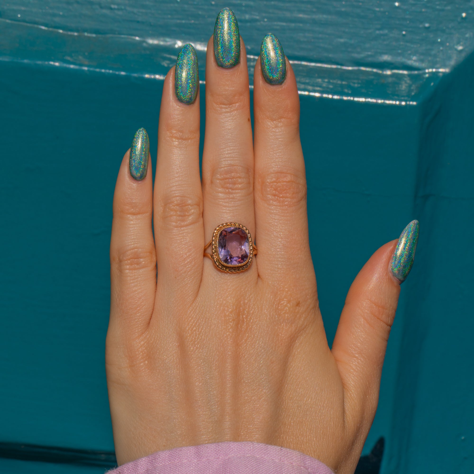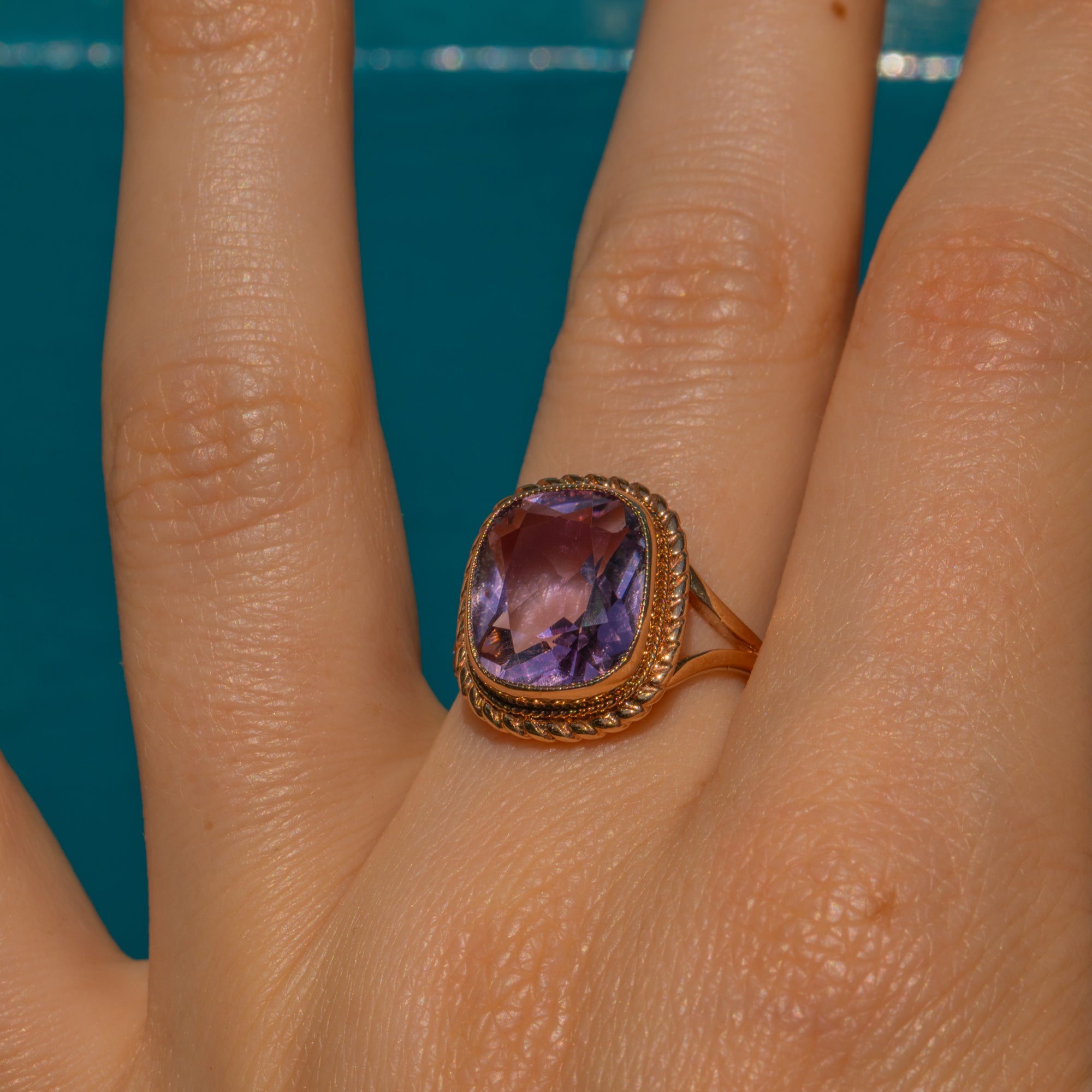 EXCELLENT. This 9ct Gold Amethyst cocktail ring is offered in excellent condition! The Amethyst is pristine with no chips or abrasions and securely held within its bezel setting. The Gold is buttery and the band has retained its form well with a full set of hallmarks still visible on the inside.