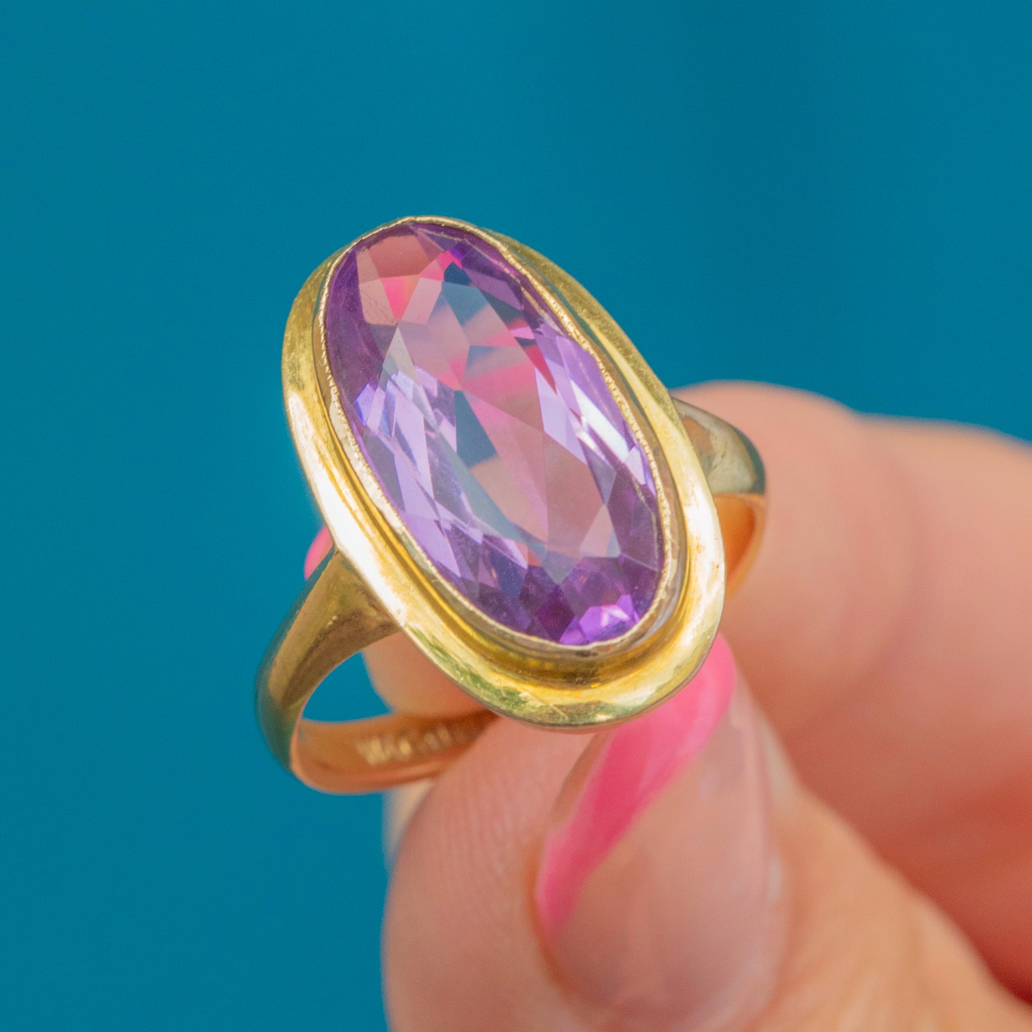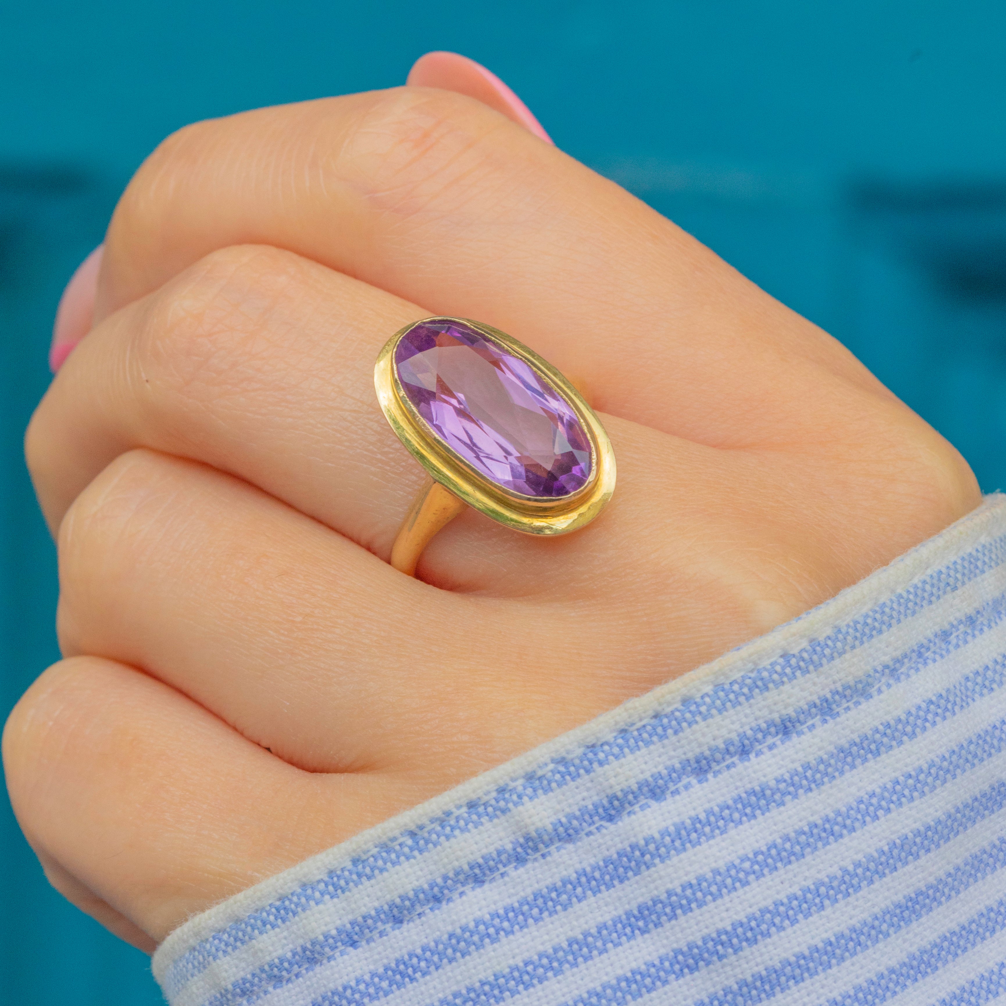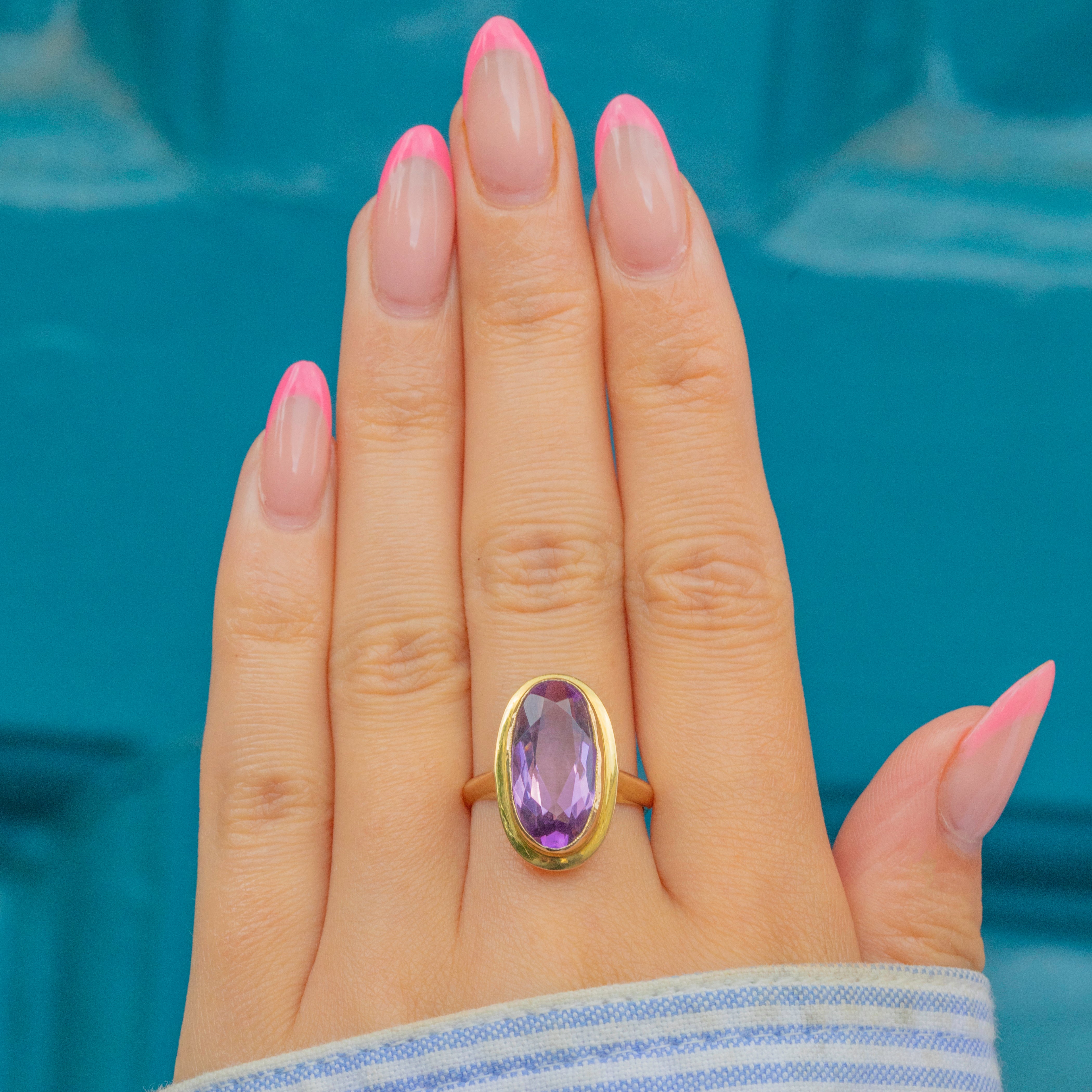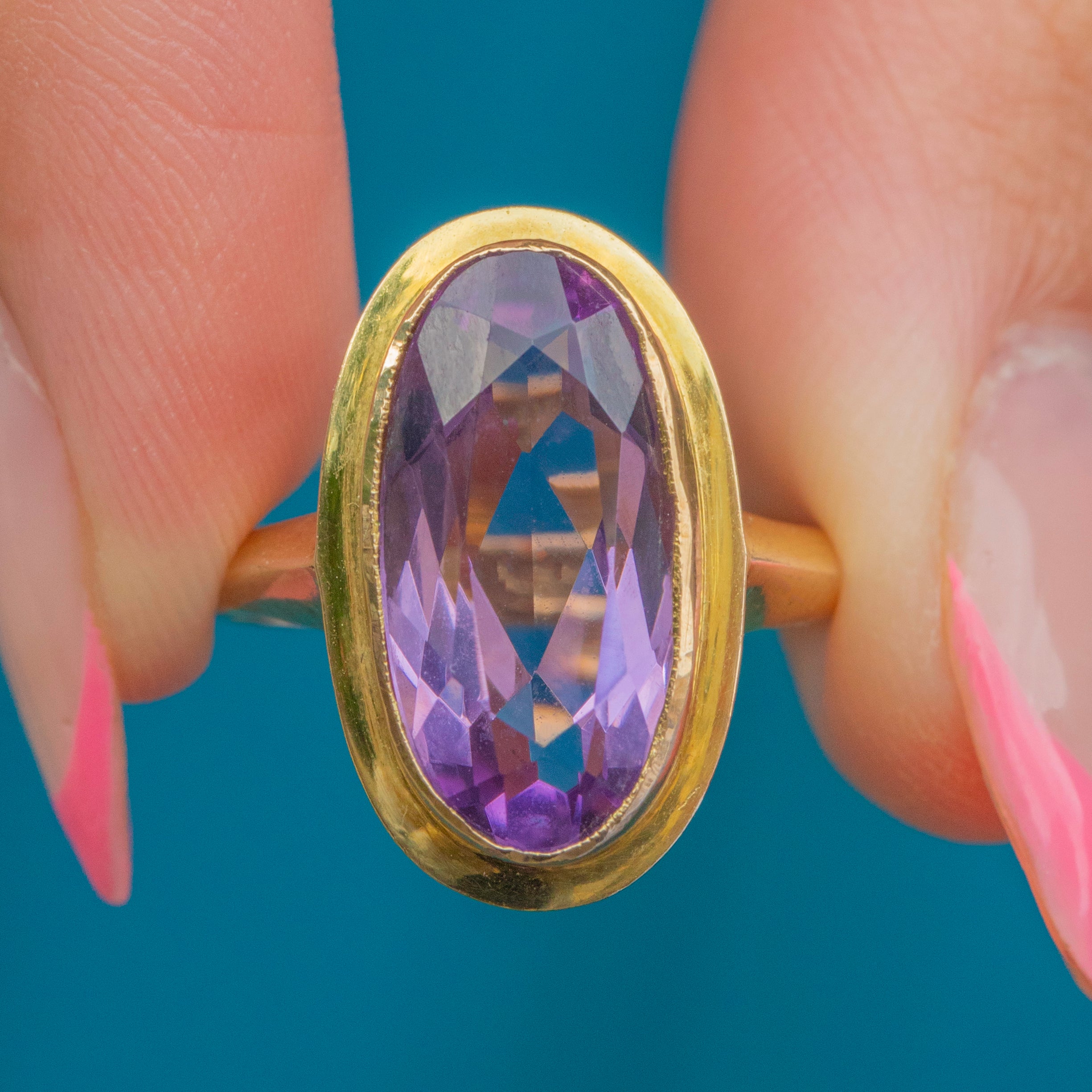 With a 9mm ring profile, her Amethyst sits raised upon your hand, perfect for that single statement ring to accompany any outfit. With a sleek Gold band to finish, this vintage Amethyst ring will bestow splendour on its wearer!