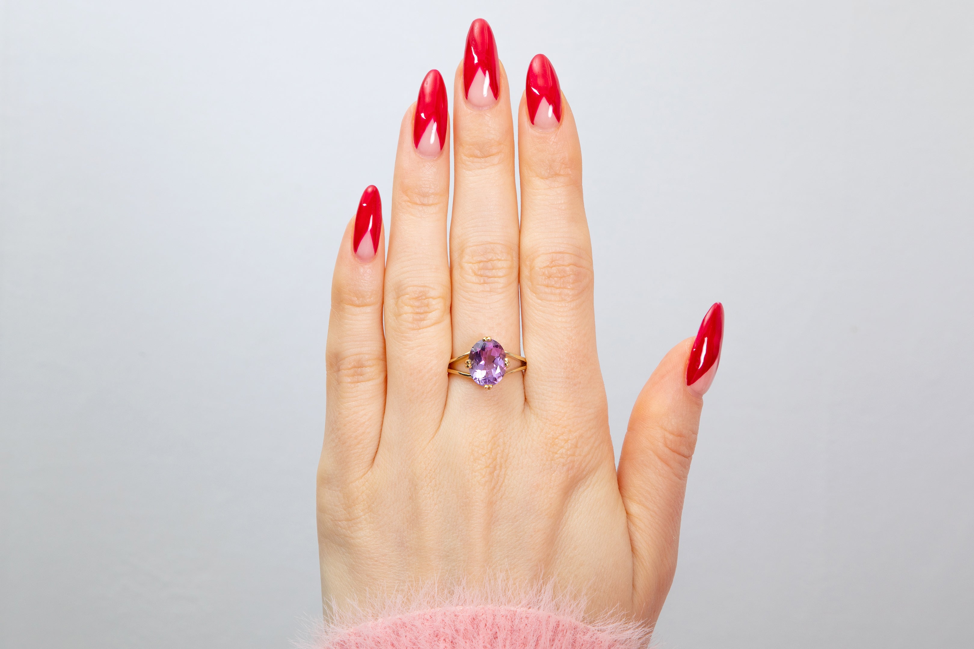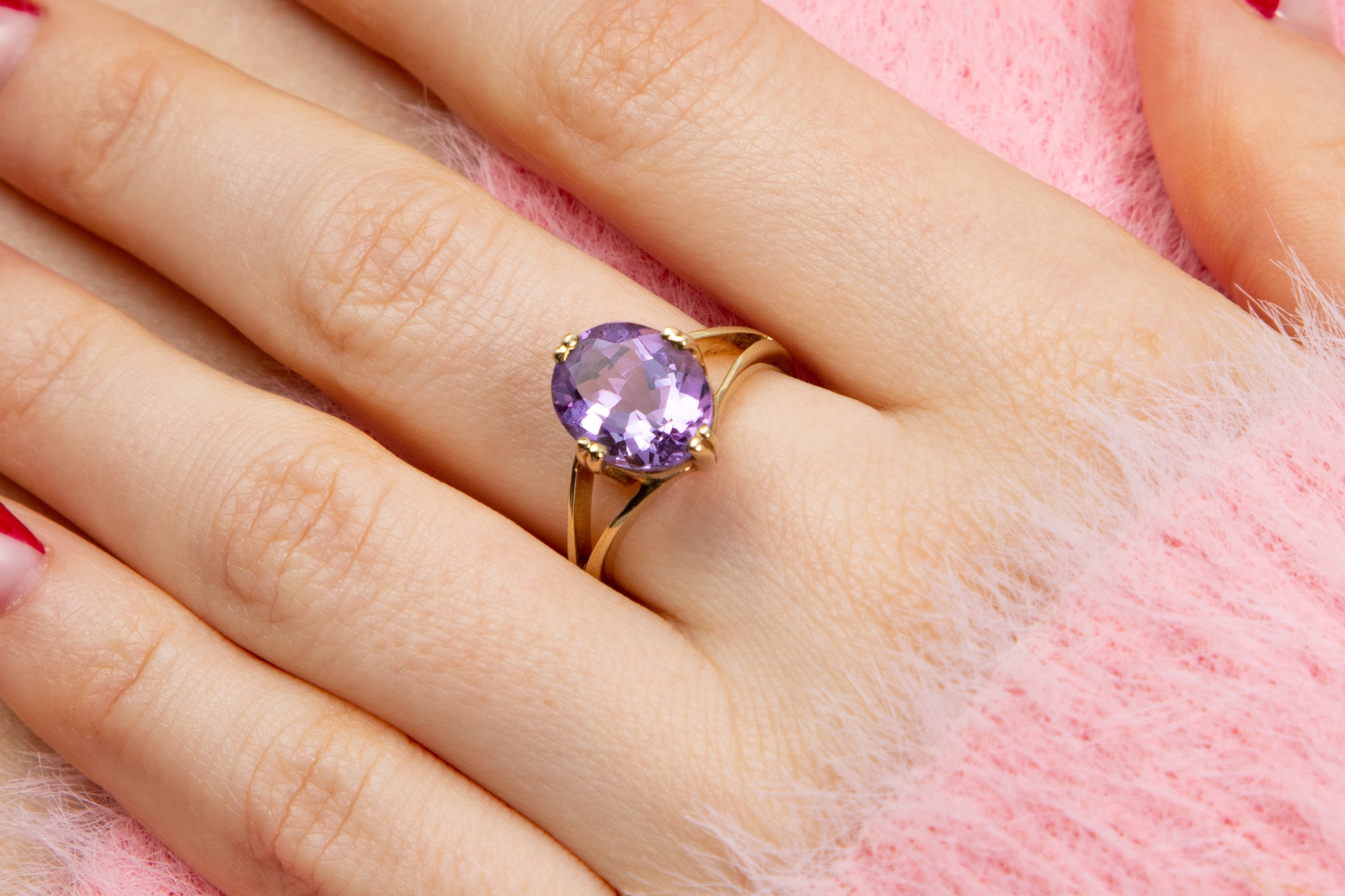 This 9ct Gold Amethyst oval solitaire ring is the sweetest treasure. Her Amethyst possesses a heliotrope hue of gentle lavender and electric lilacs. Light dances across the face of the Amethyst, like ballerinas taking the stage, and leaves us dazzled.
