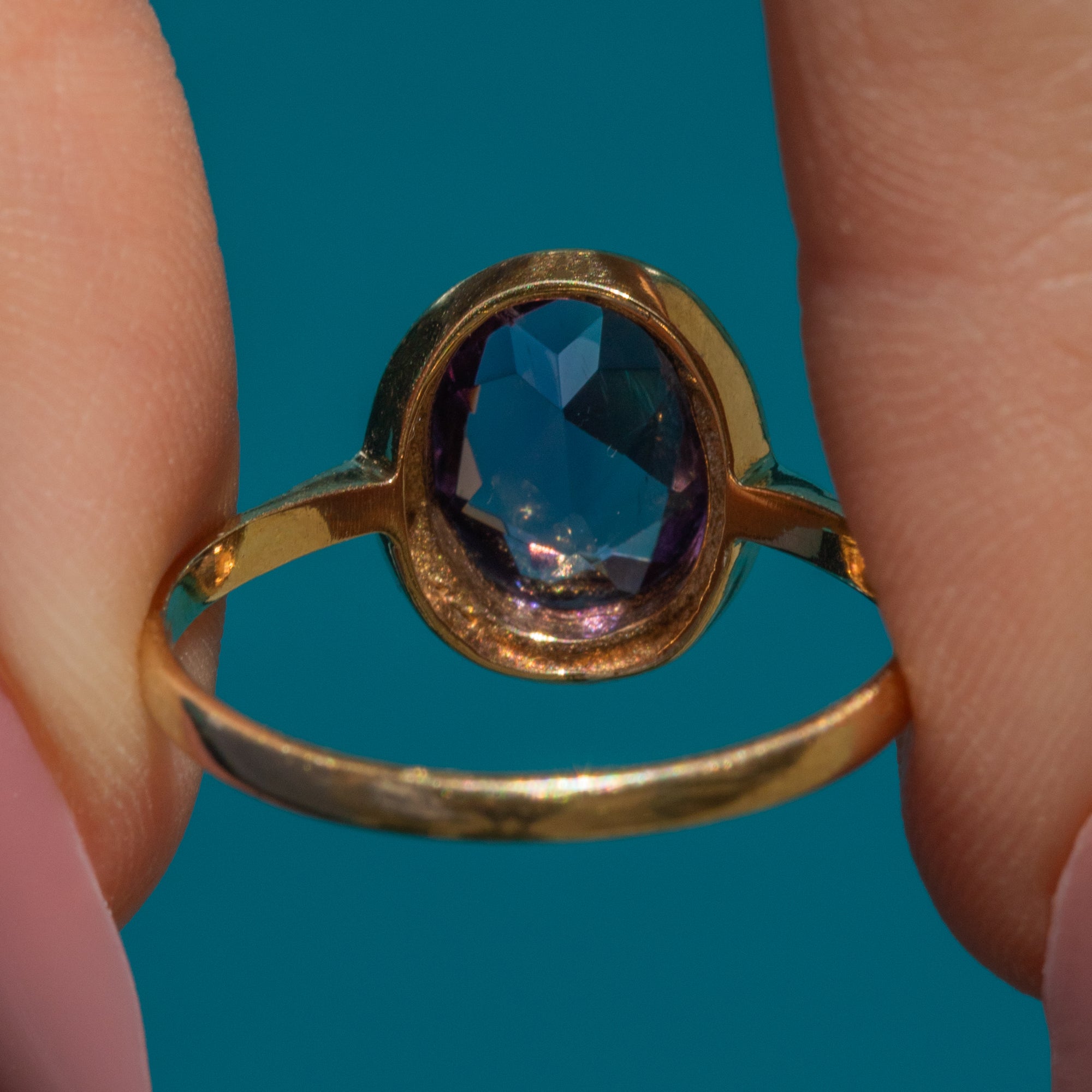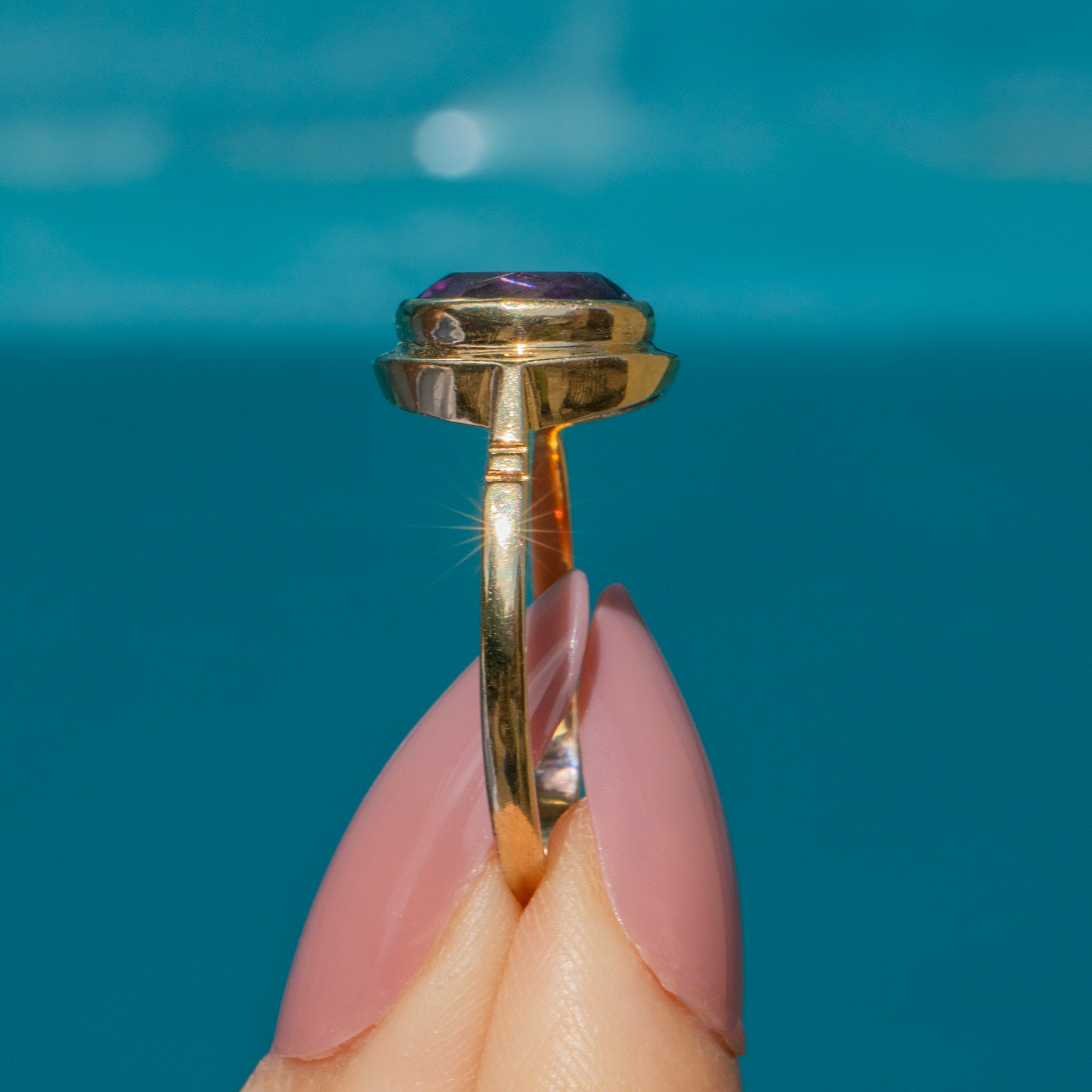 The low profile of this striking piece makes her perfect for daily wear, boasting a fiery Diamond flanked by royal blue Sapphires promising years of enjoyment. With a full set of hallmarks on the inside of the band, dating this Victorian gypsy ring to 1899, she is a fine collector's piece guaranteed to be admired for generations to come!