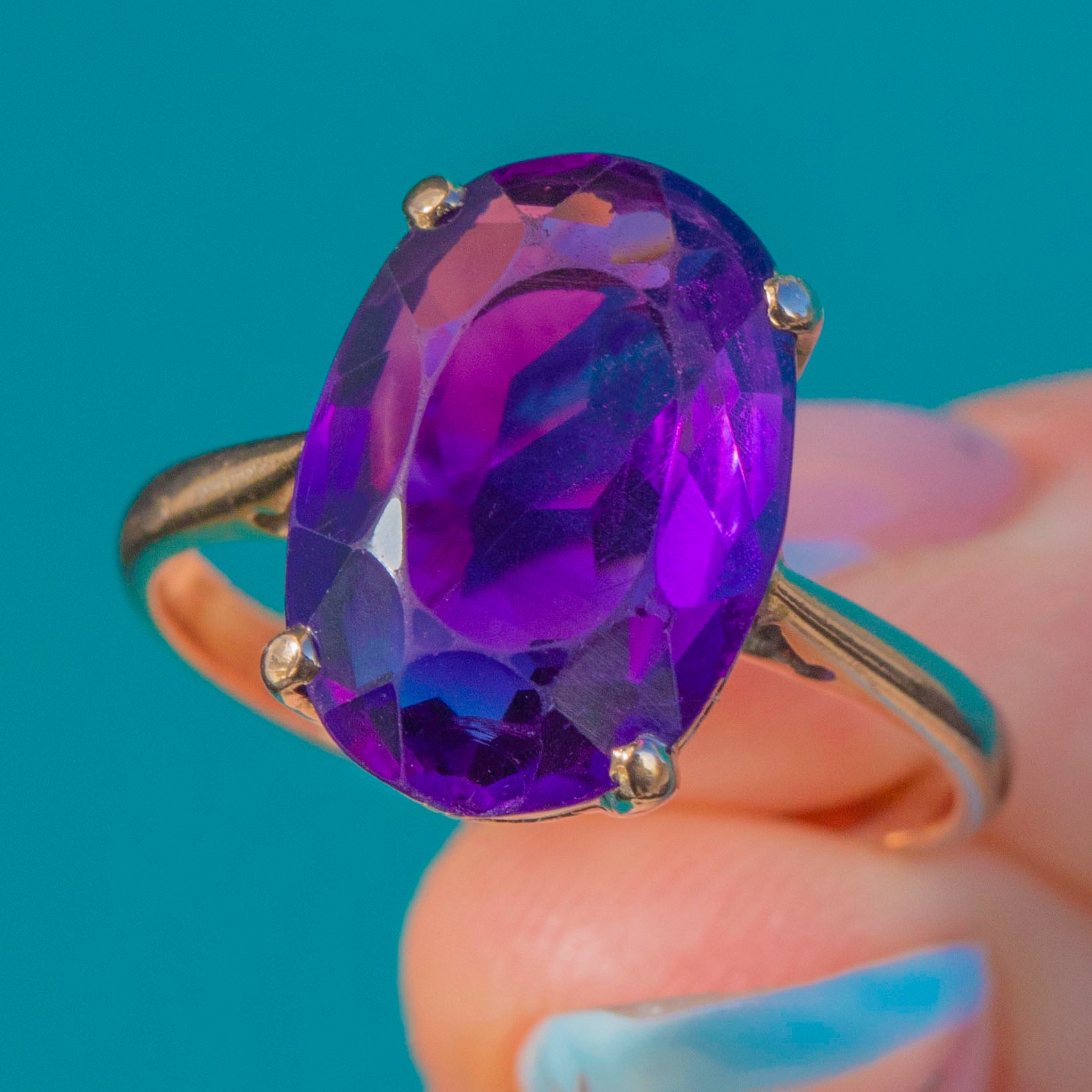 A striking Mid-Century solitaire, this Vintage c.1950s ring centres a luscious elongated oval Amethyst of approximately 3.30ct. Saturated deep plum with lively violet flashes, the stone is the star of the show, catching the light beautifully and delivering that quintessential cocktail allure.