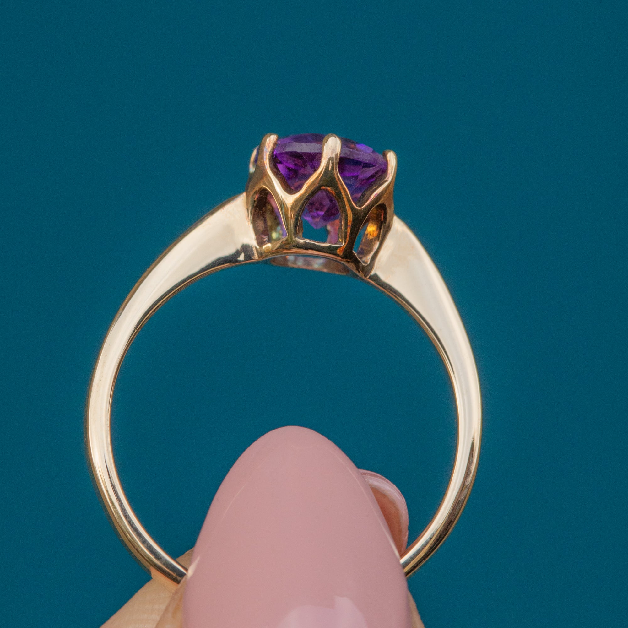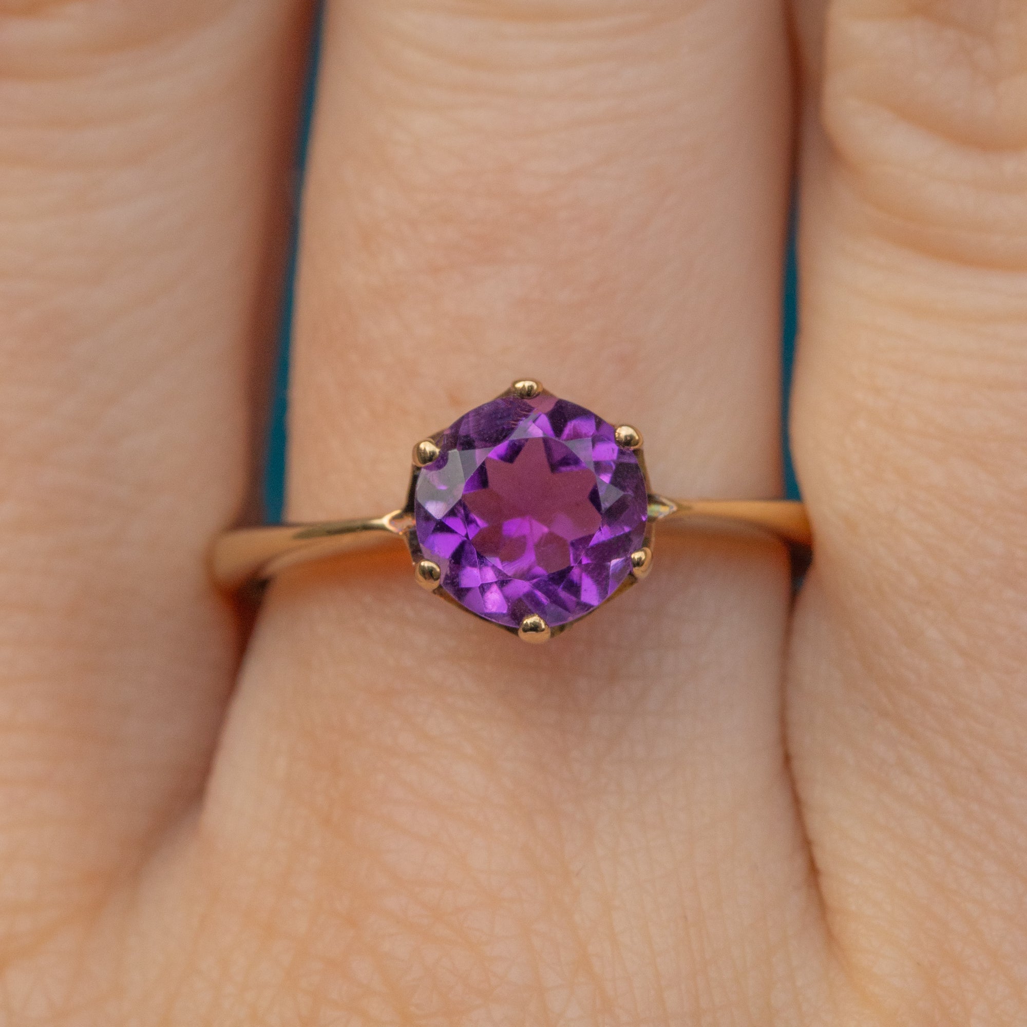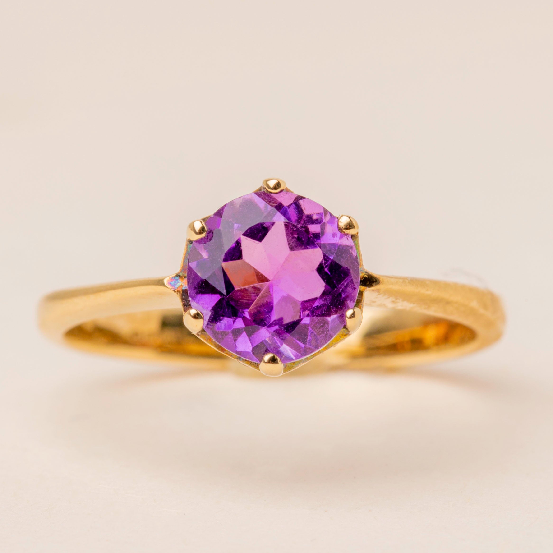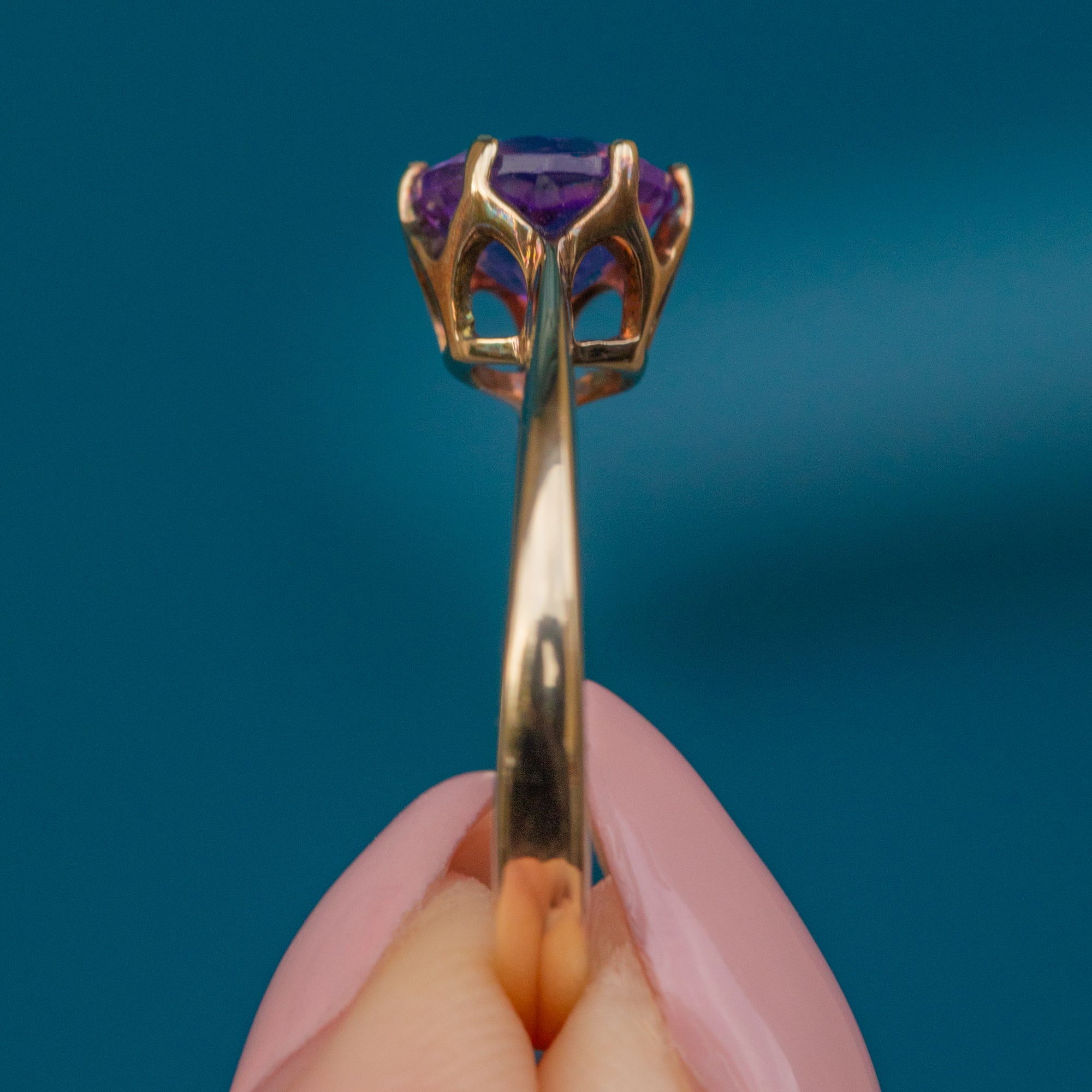 EXCELLENT. This 9ct Gold Amethyst solitaire ring is in excellent condition. The Amethyst has a crisp set of facets and is free from chips or abrasions. The 9ct Gold is buttery throughout and the shank has kept its elegant form well, and each claw is present holding the Amethyst securely in place.