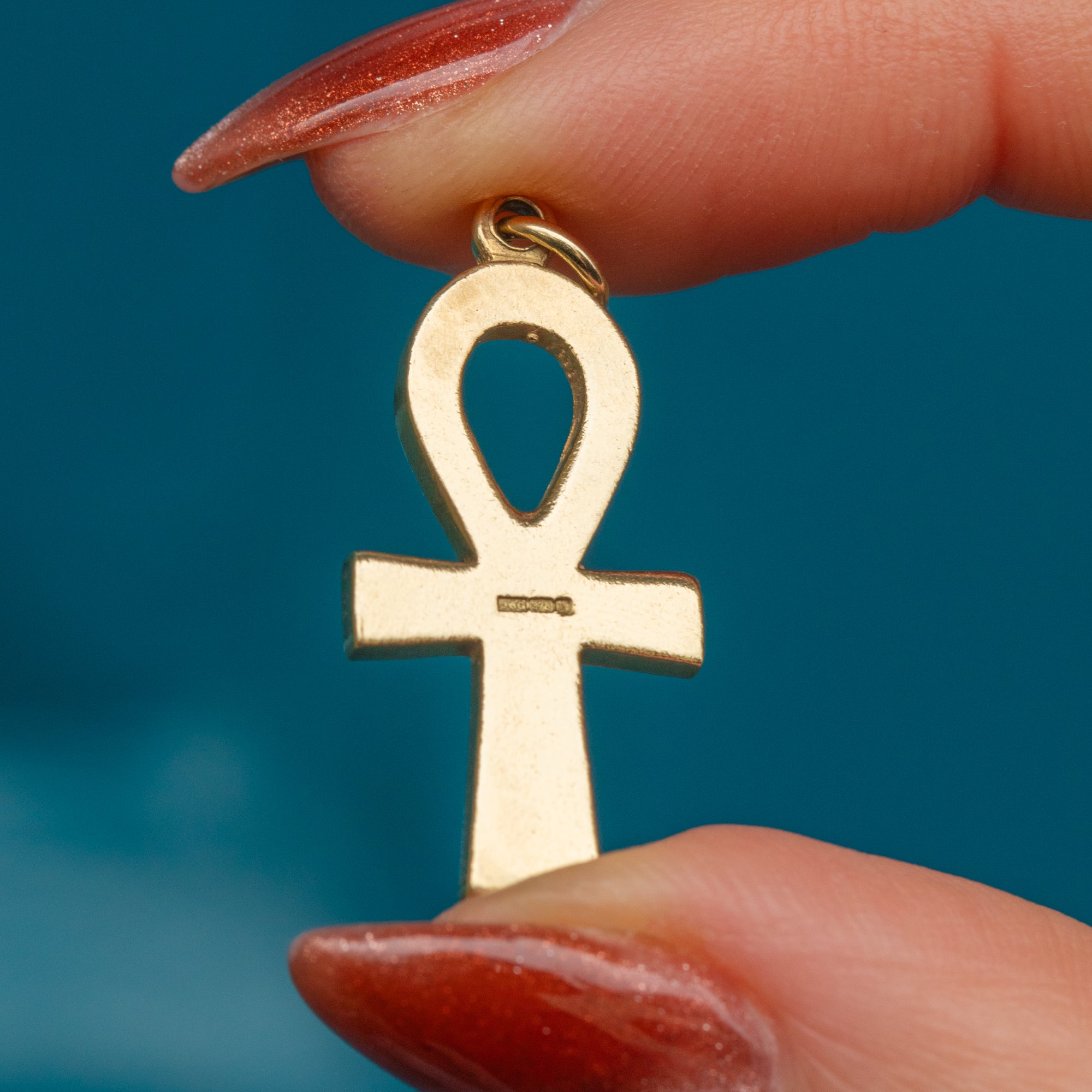 VERY GOOD-EXCELLENT. In lovely condition, this 9ct Gold Ankh pendant boasts a buttery golden hue with only minor surface wear. A small nick inside the circle of the Ankh is present but is only noticeable under close inspection.