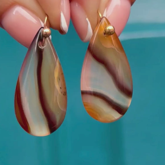 These 9ct Gold antique Agate pear drop earrings are simply delightful. Sleek pear cut striped Agates rest within elegant 9ct Gold hooks, infused with warm earthy tones throughout.