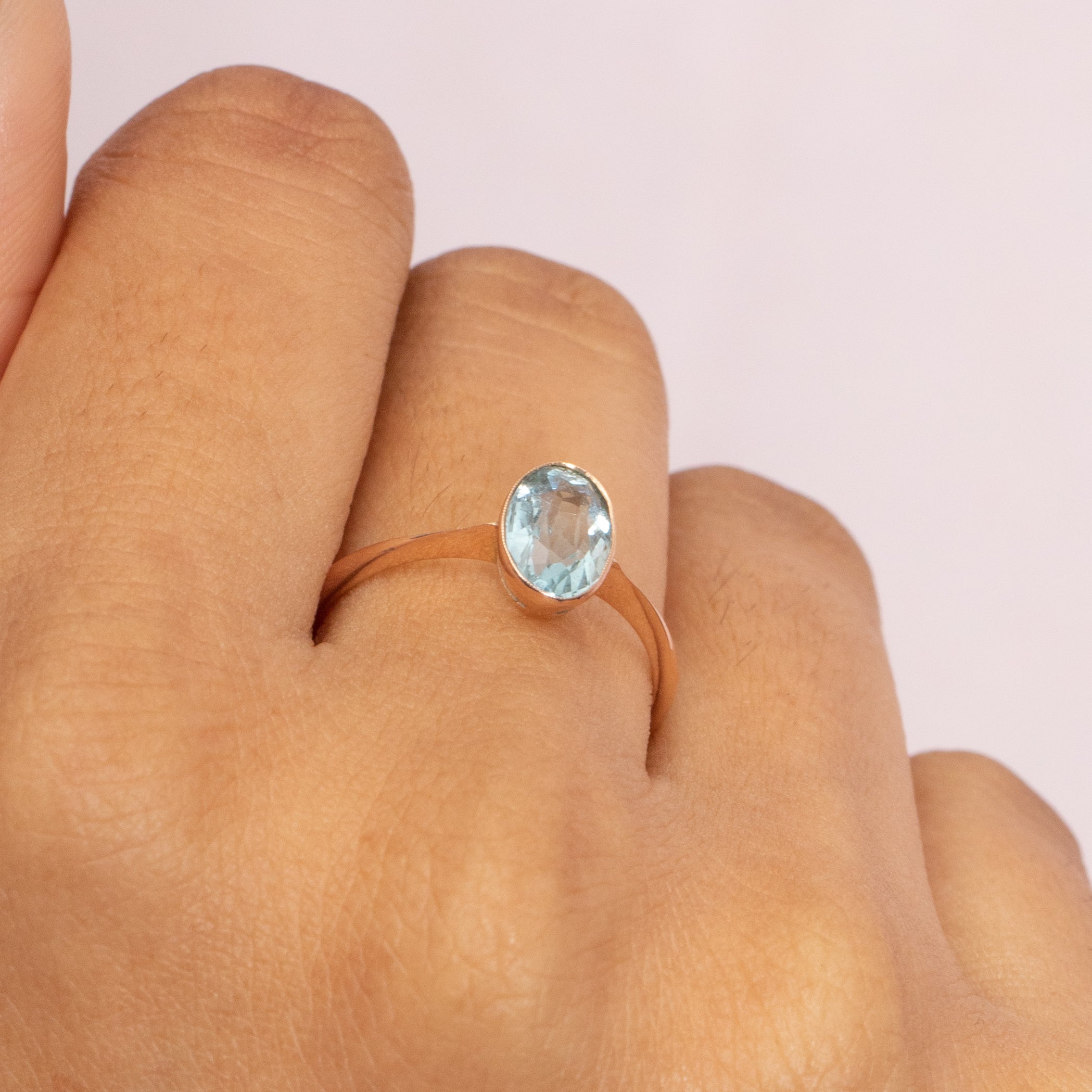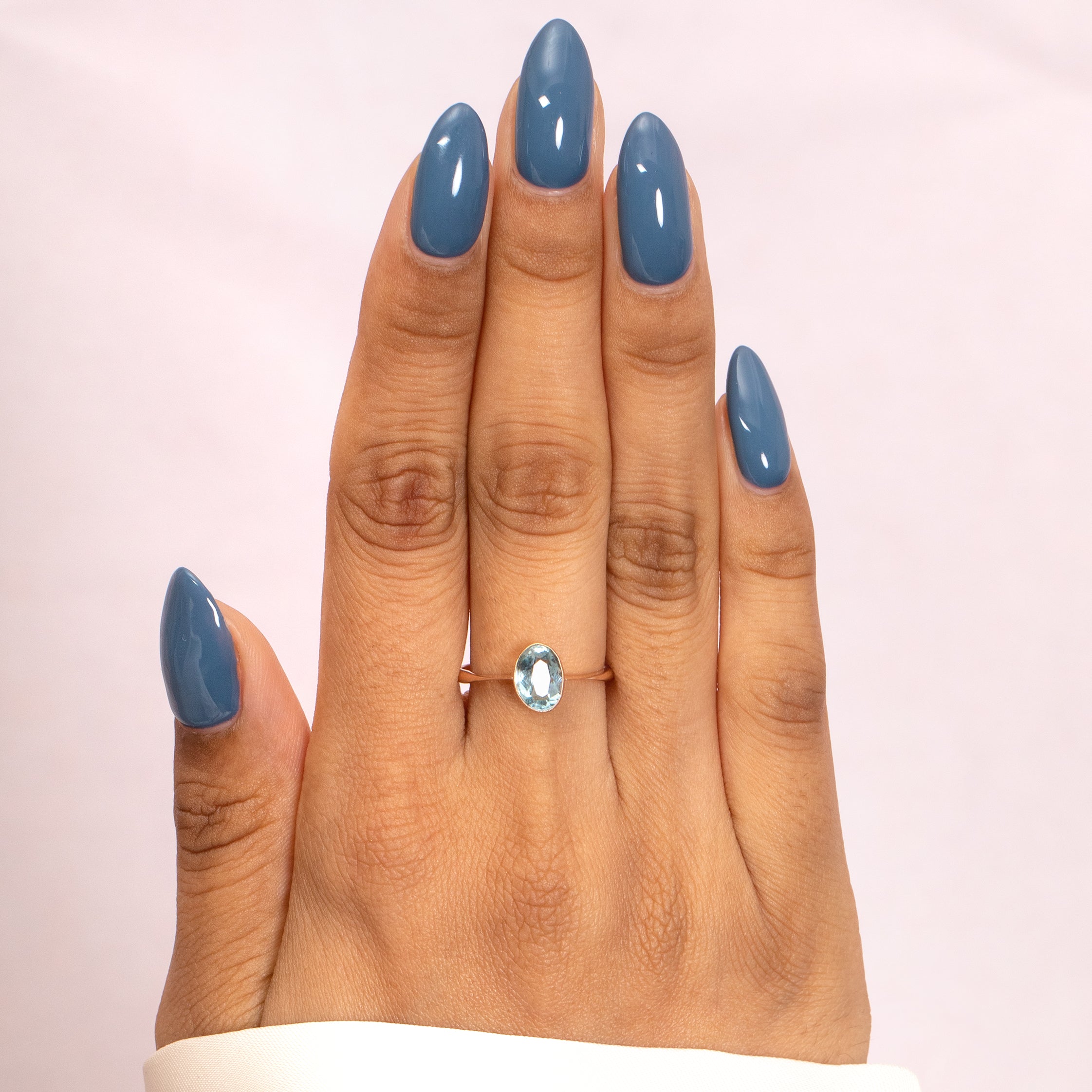 This exquisite 9ct Gold Aquamarine oval bezel-set solitairering exudes elegance and sophistication. The 1.00ct Aquamarine is akin to a pool of icy water, with the facets shimmering and changing with the light, flashing with deep azure and Turquoise undertones.