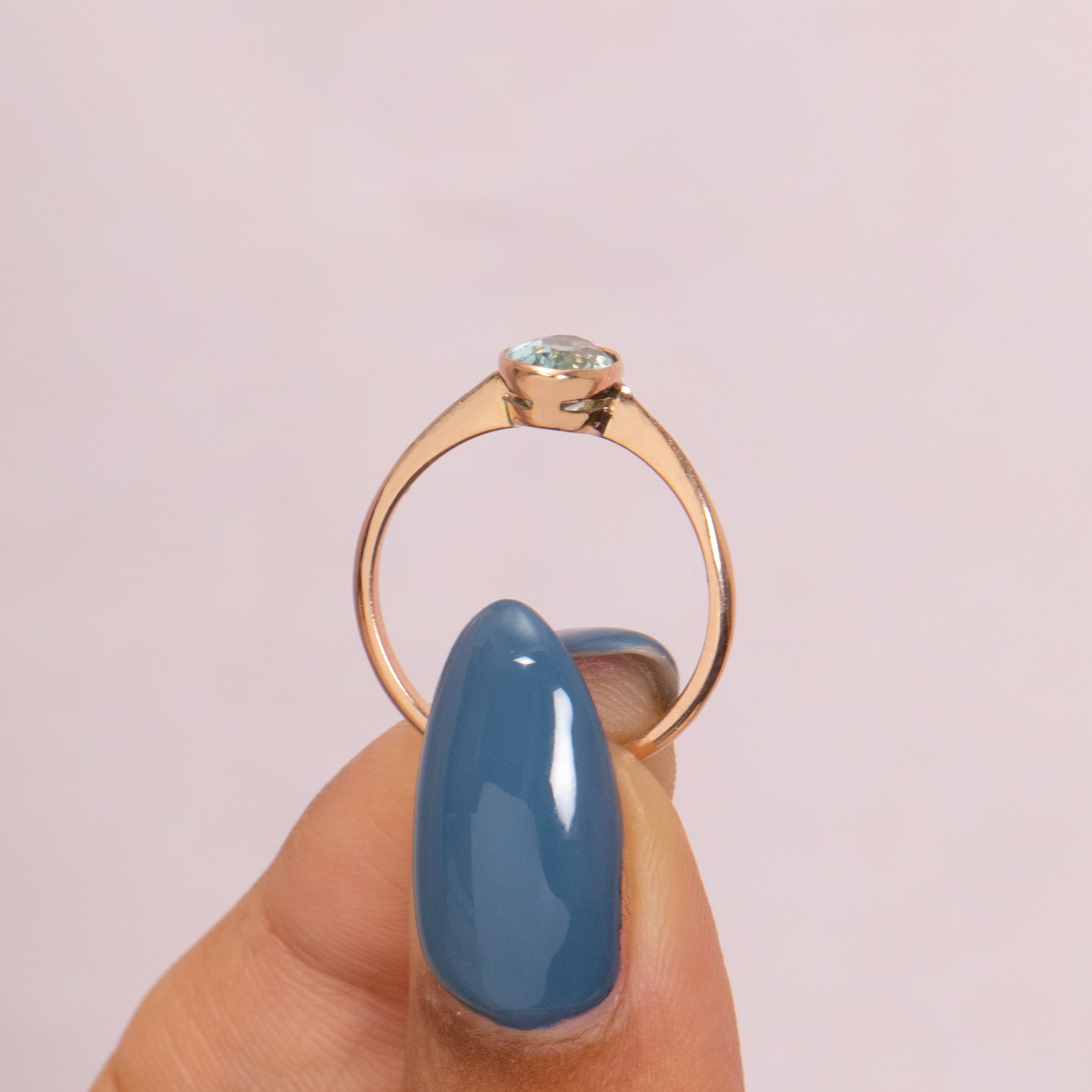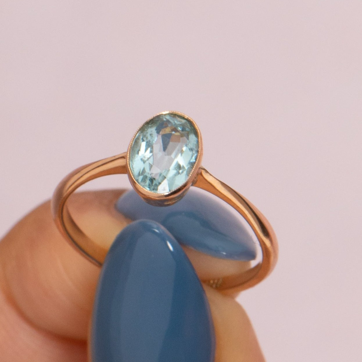 The colour combination of rosy Gold and icy blue makes a pretty pairing, and the bezel setting frames the stone elegantly. It would make a gorgeous gift for any occasion or a unique Victorian solitaire ring to add to your collection.