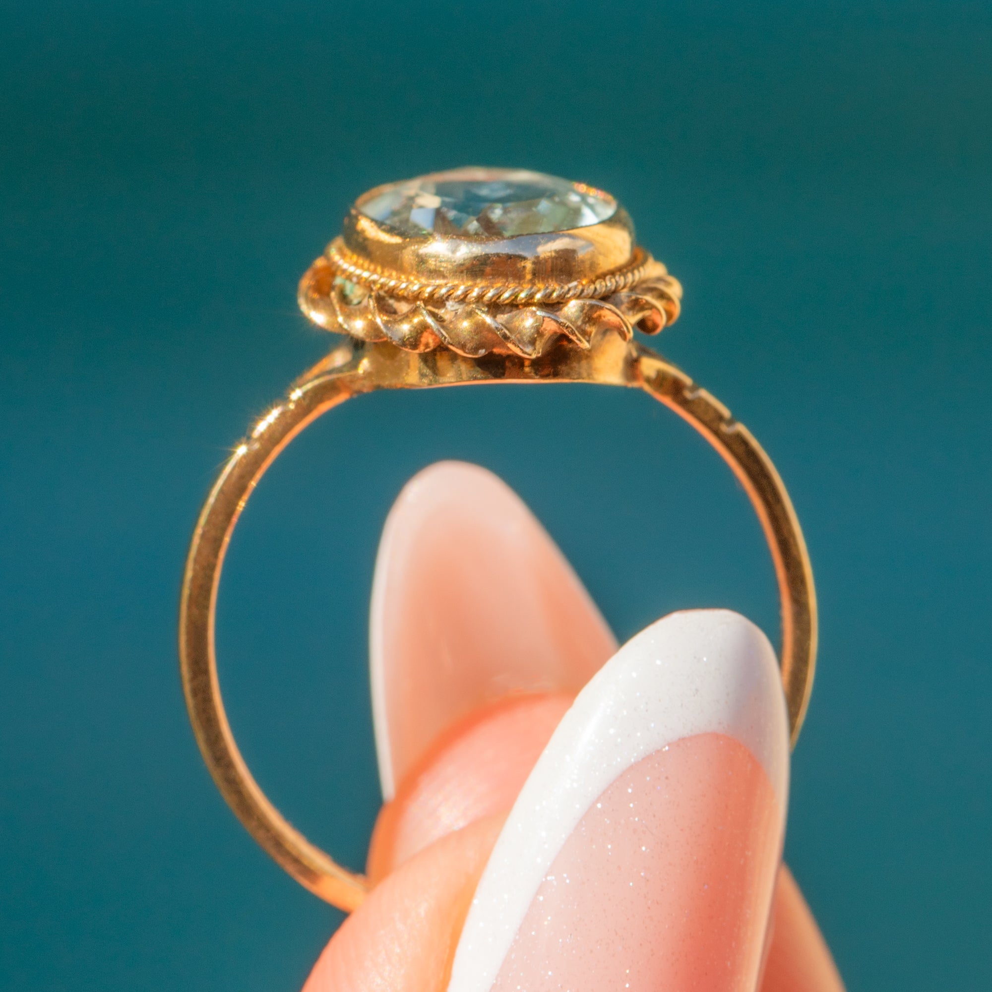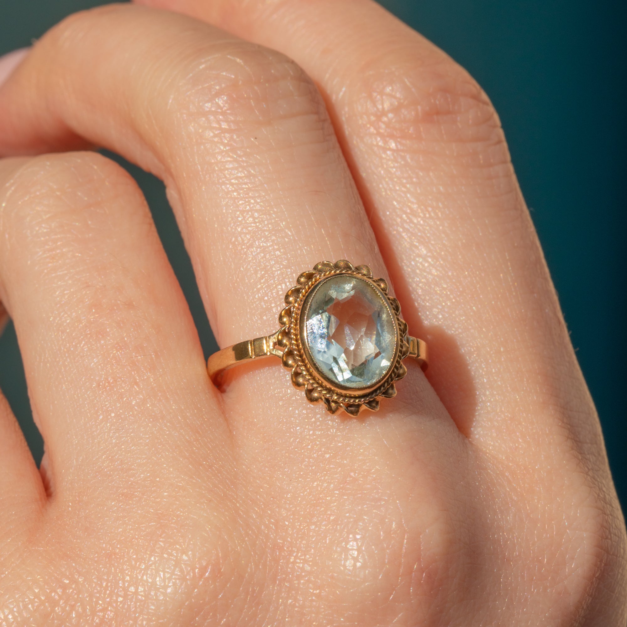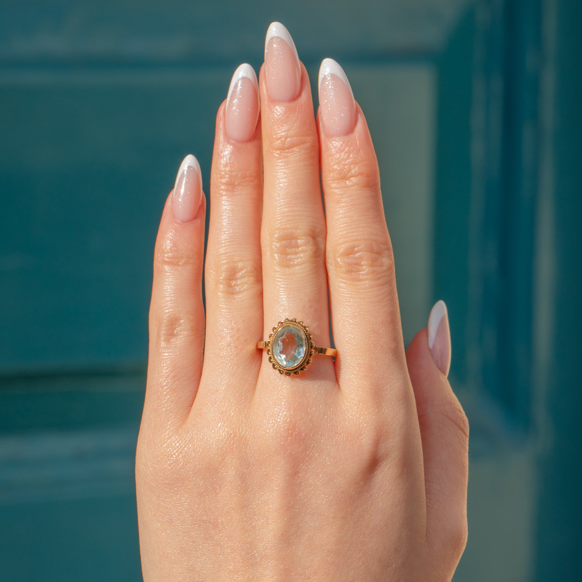 In her centre sits an icy 1.50ct Aquamarine, faceted beautifully and revealing cool azure hues as she catches the light. She is set within a buttery 9ct Gold bezel with a striking rope border providing a lovely texture.