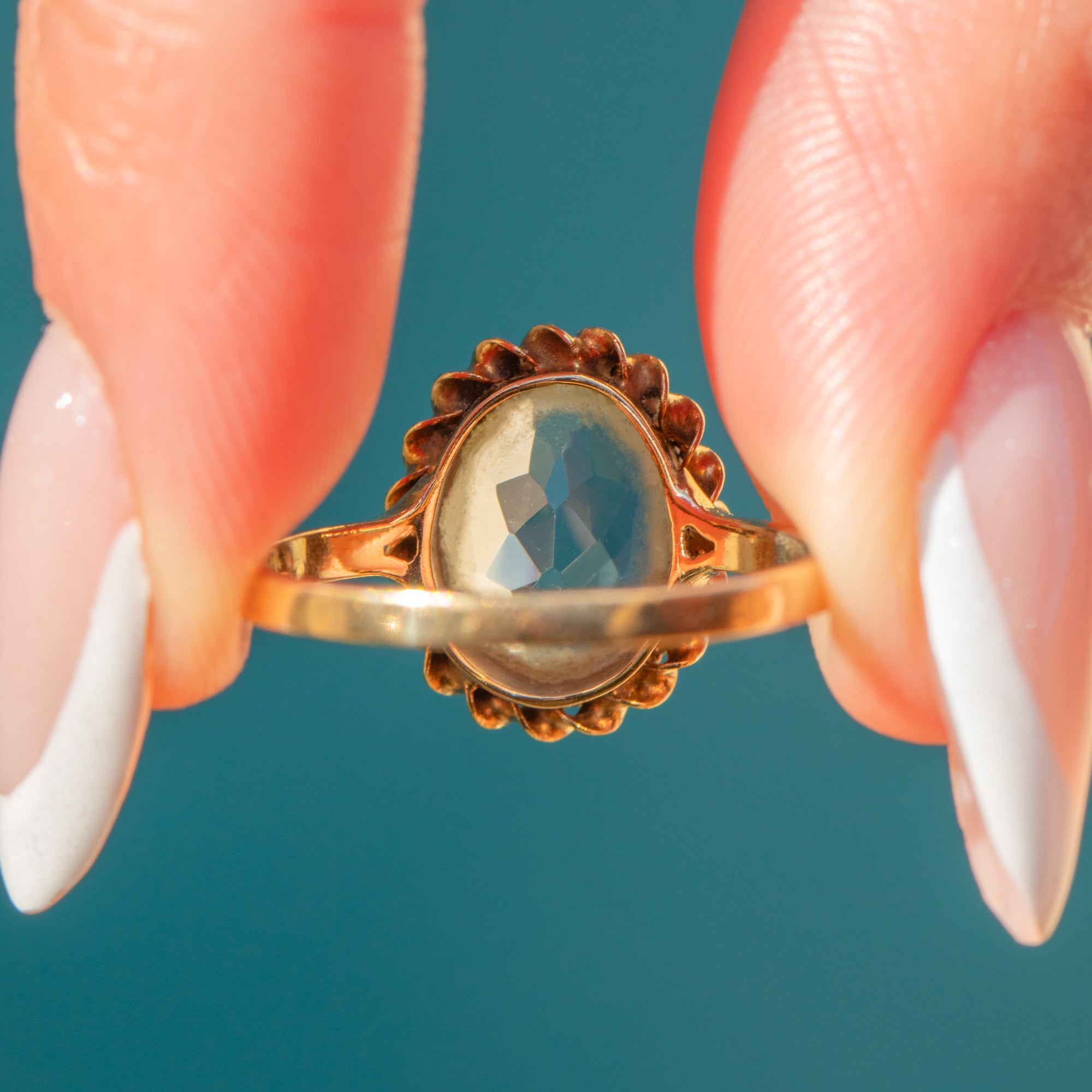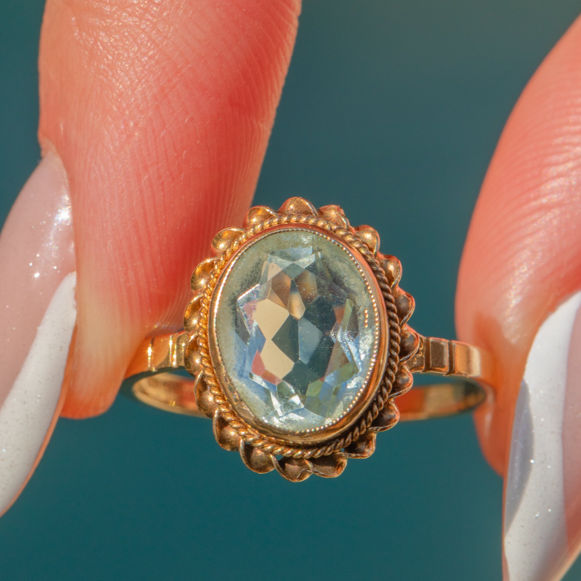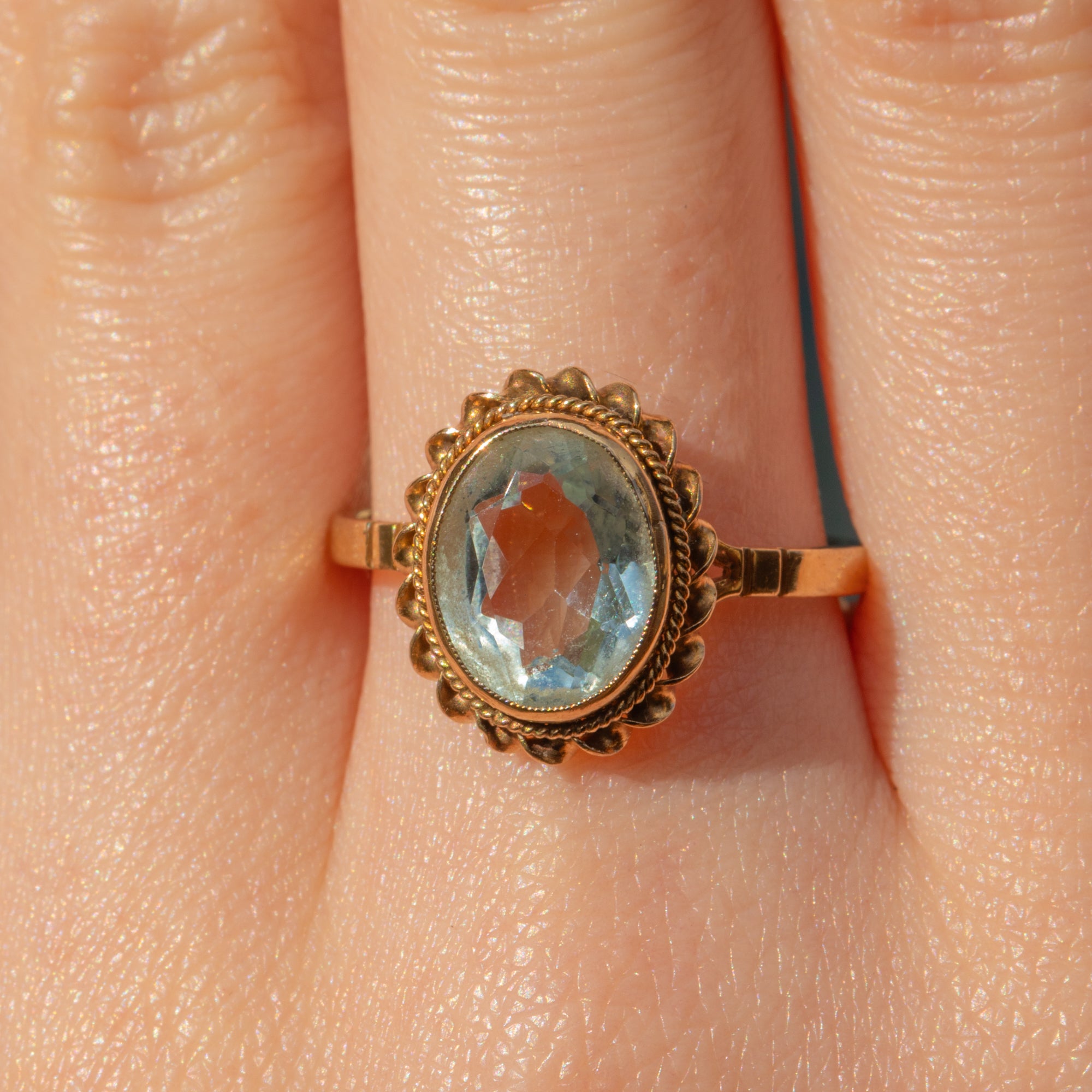 In her centre sits an icy 1.50ct Aquamarine, faceted beautifully and revealing cool azure hues as she catches the light. She is set within a buttery 9ct Gold bezel with a striking rope border providing a lovely texture.