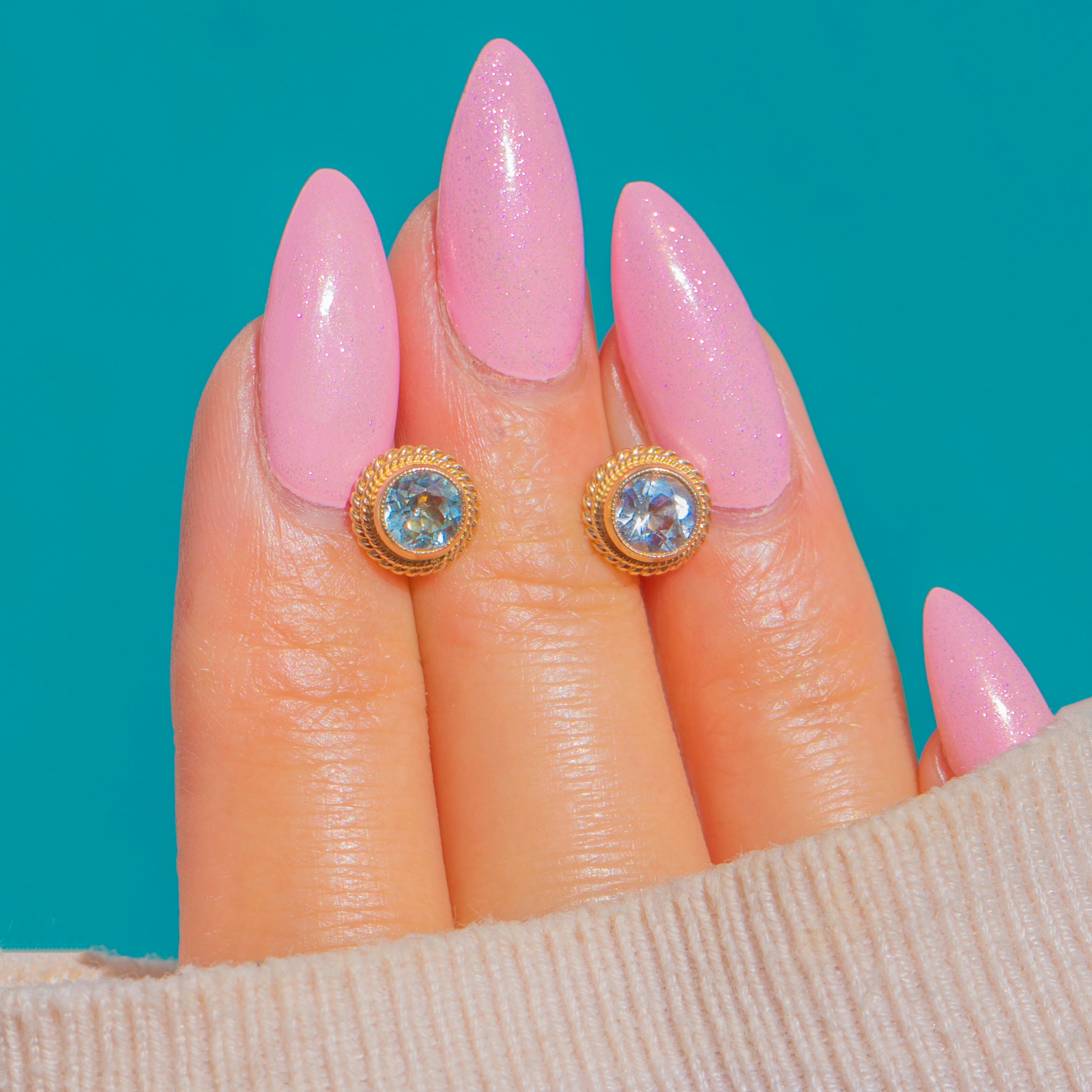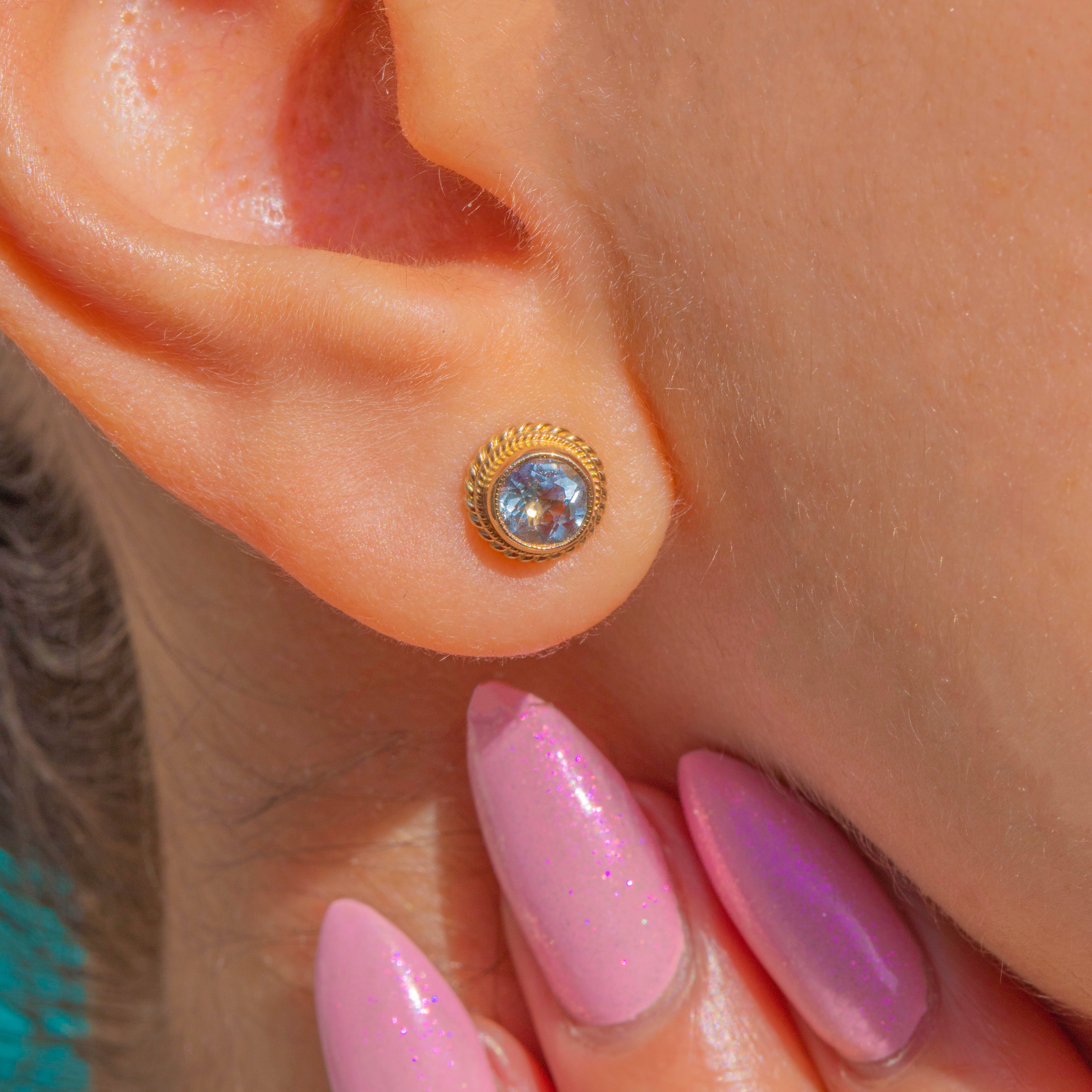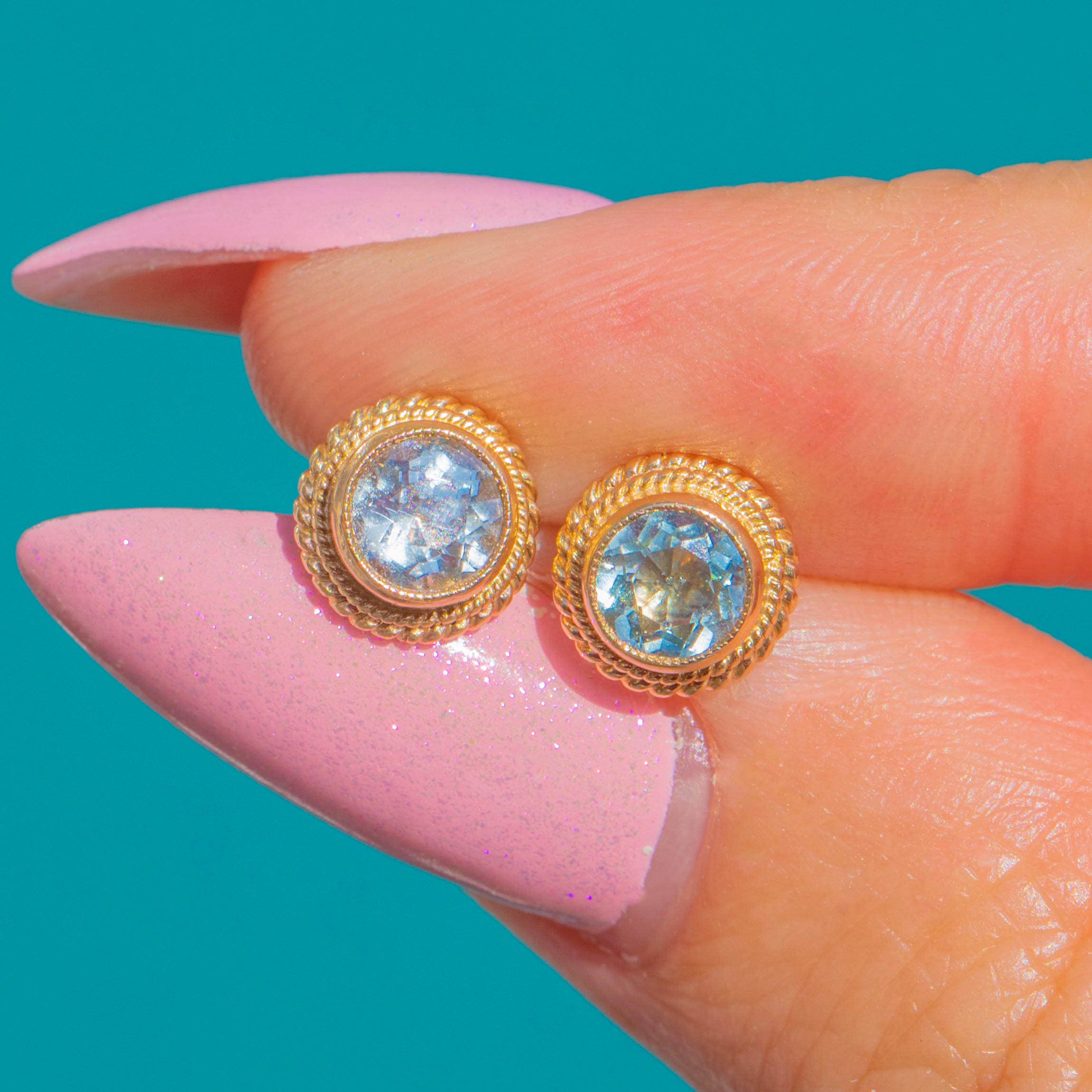 These Vintage 9ct Gold Aquamarine stud earrings are effortlessly elegant, each showcasing a pale blue round Aquamarine in a smooth bezel framed by a refined rope-twist border. The textured Gold halo adds a touch of heritage charm while keeping the look beautifully understated for everyday wear.
