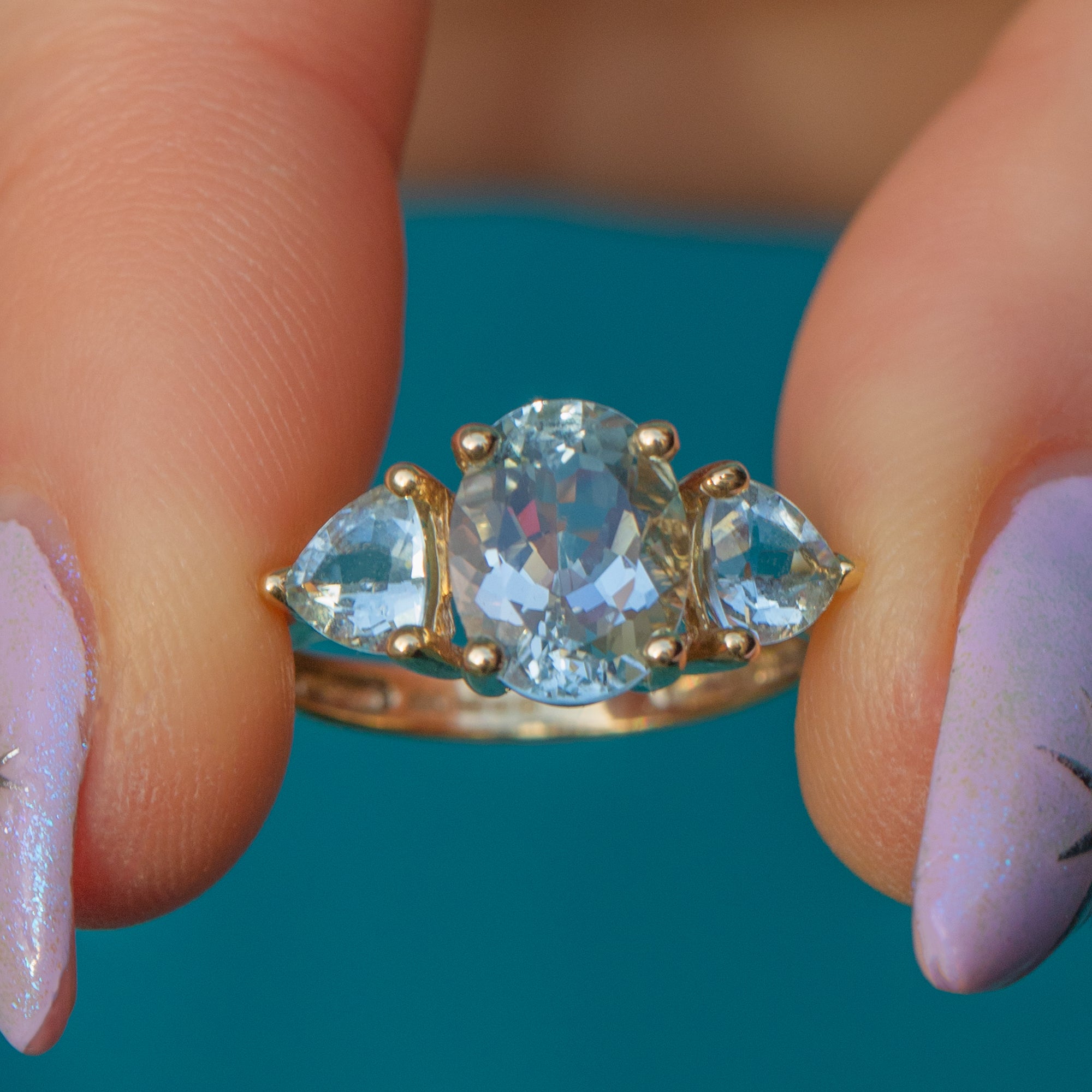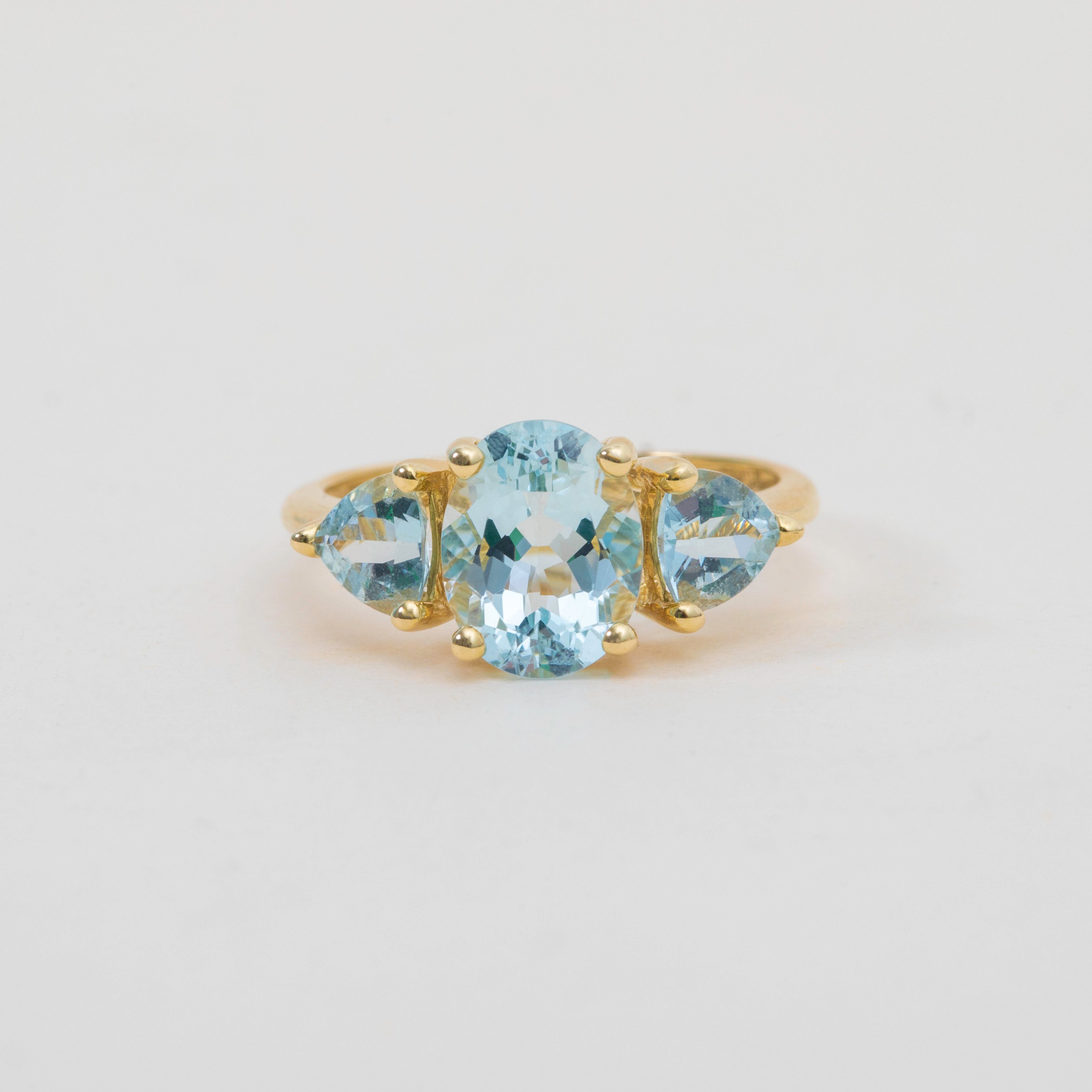 EXCELLENT. This 9ct Gold Aquamarine three stone ring is in excellent condition, with a smooth, polished band. The Aquamarines are securely set, with no visible abrasions or chips. This vintage Aquamarine trilogy ring will make a gorgeous addition to your collection!