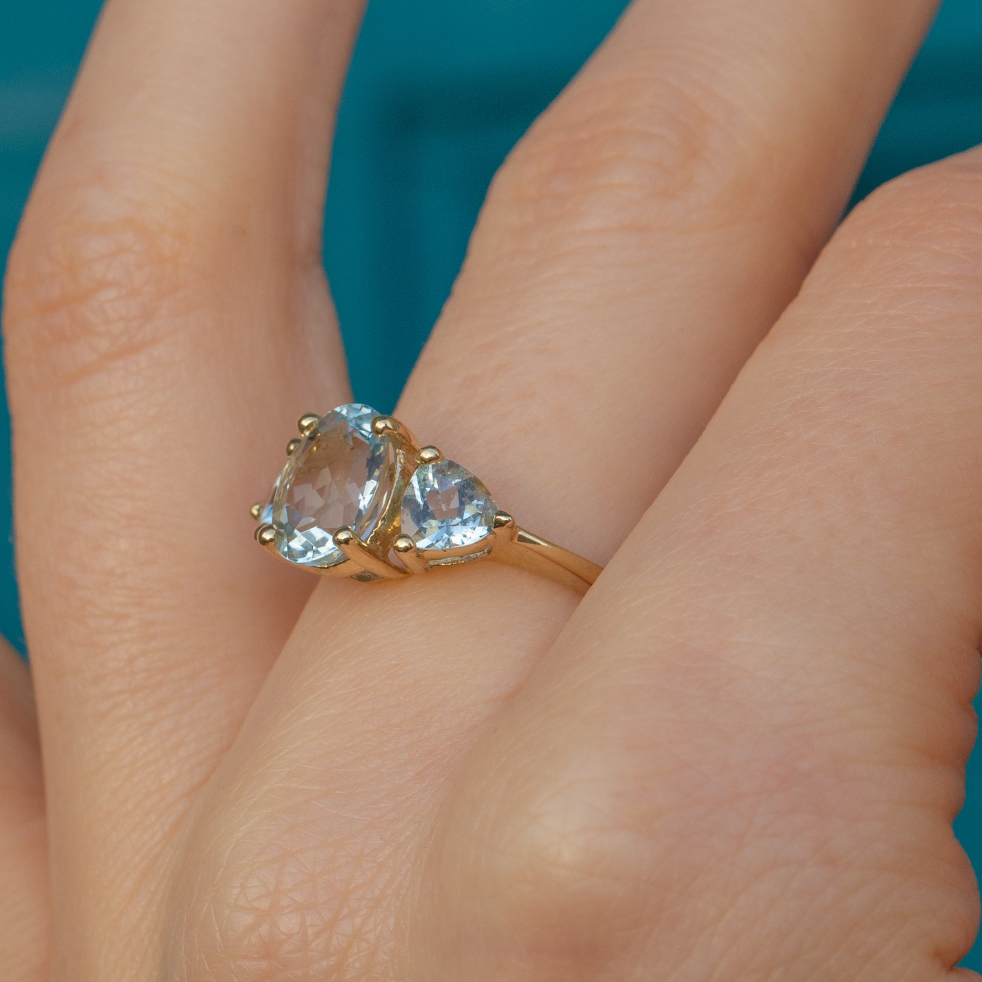 This exquisite 9ct Gold Aquamarine three stone ring has a classic and timeless design! The Aquamarines have a gorgeous icy blue hue, with a delicate translucence that catches the light beautifully. Each stone is elegantly faceted, enhancing their natural brilliance and creating a soft, ethereal glow.