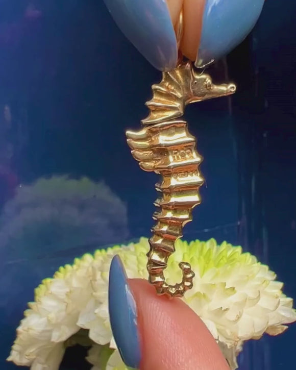 VERY GOOD TO EXCELLENT. This 9ct Gold articulating seahorse charm is in fabulous condition. The charm has a gentle movement and intricate detailing throughout. The 9ct Gold exhibits minor surface marks and some darkening to the grooves, but this only adds to her antique charm. The Gold is buttery with a beautiful matte finish throughout and the soldered jump ring allows for secure wear.