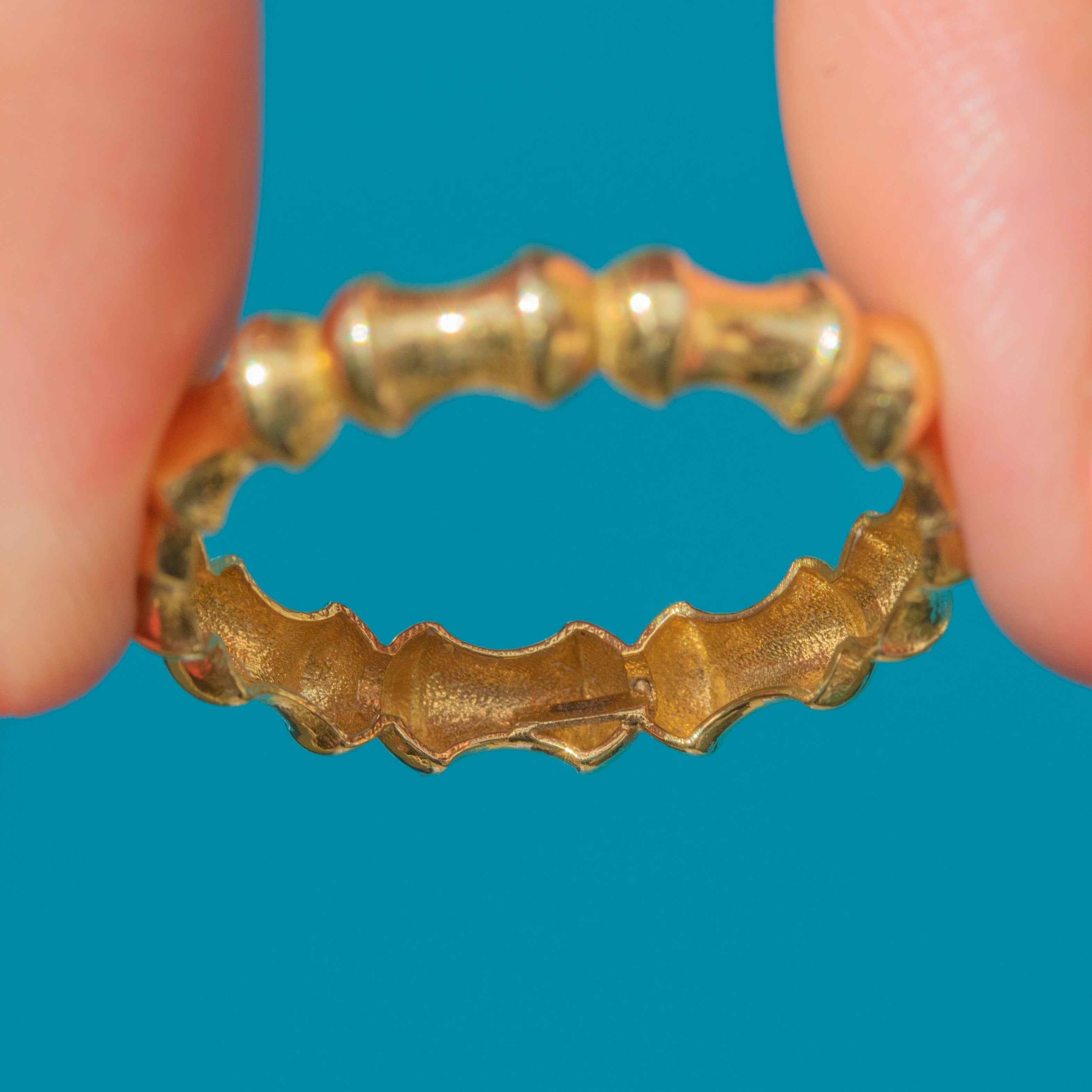 Crafted from solid 9ct Gold, this buttery delight has elegantly curved lines and the bamboo details catch the light beautifully. Slender in form, this vintage Gold band will bring elegance to your collection!