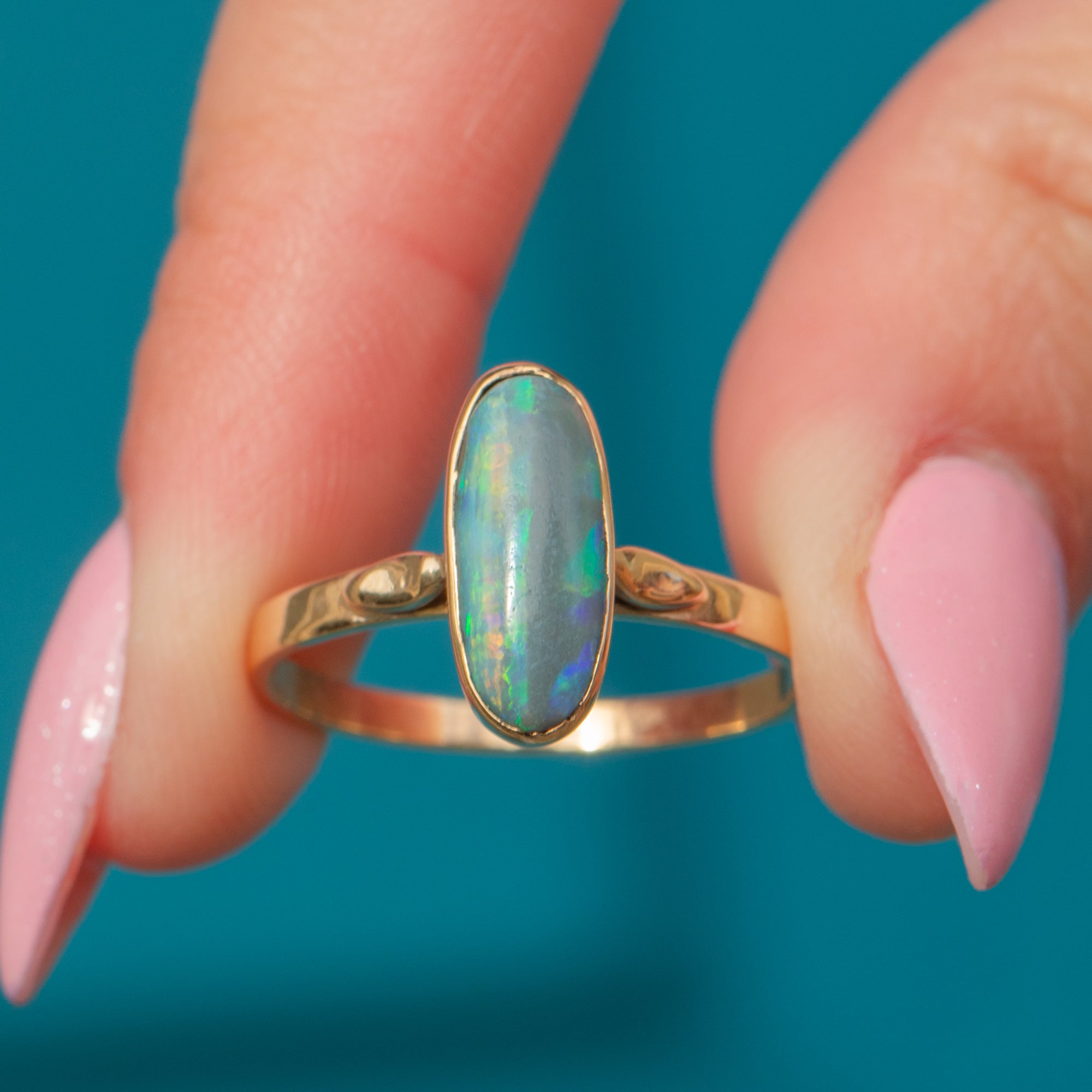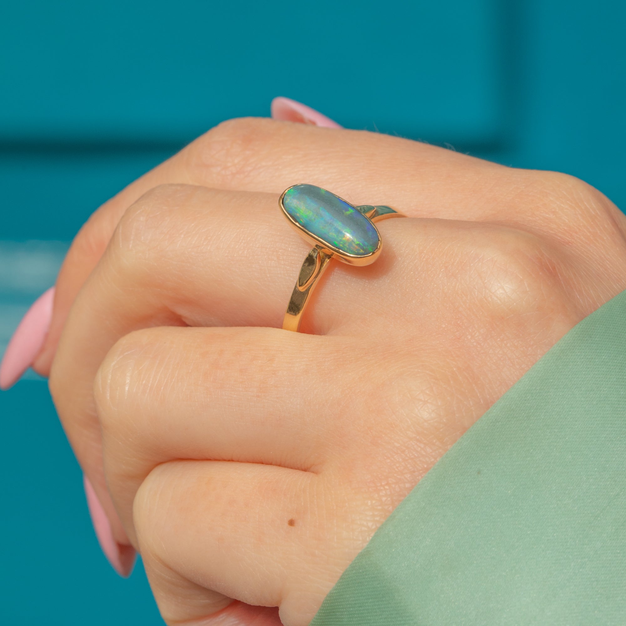 The stunning oval black Opal catches the light to display a magnificent iridescence- revealing vibrant shimmers of greens, oranges and blues across its dark core. She is set within a buttery 9ct Gold bezel, the warmth of the Gold effortlessly complementing the vibrancy of the Opal.
