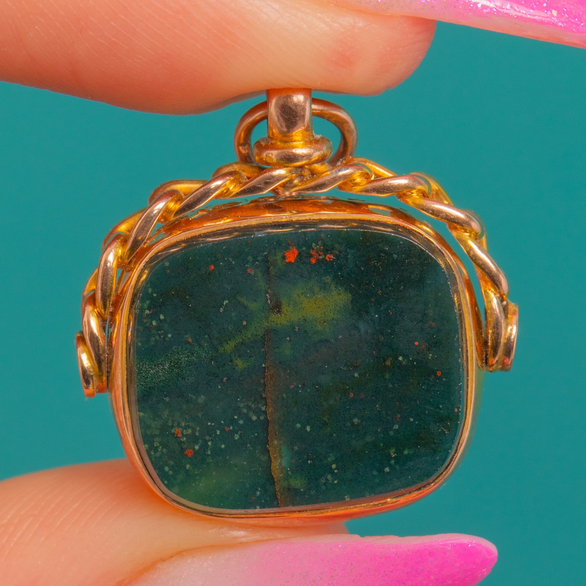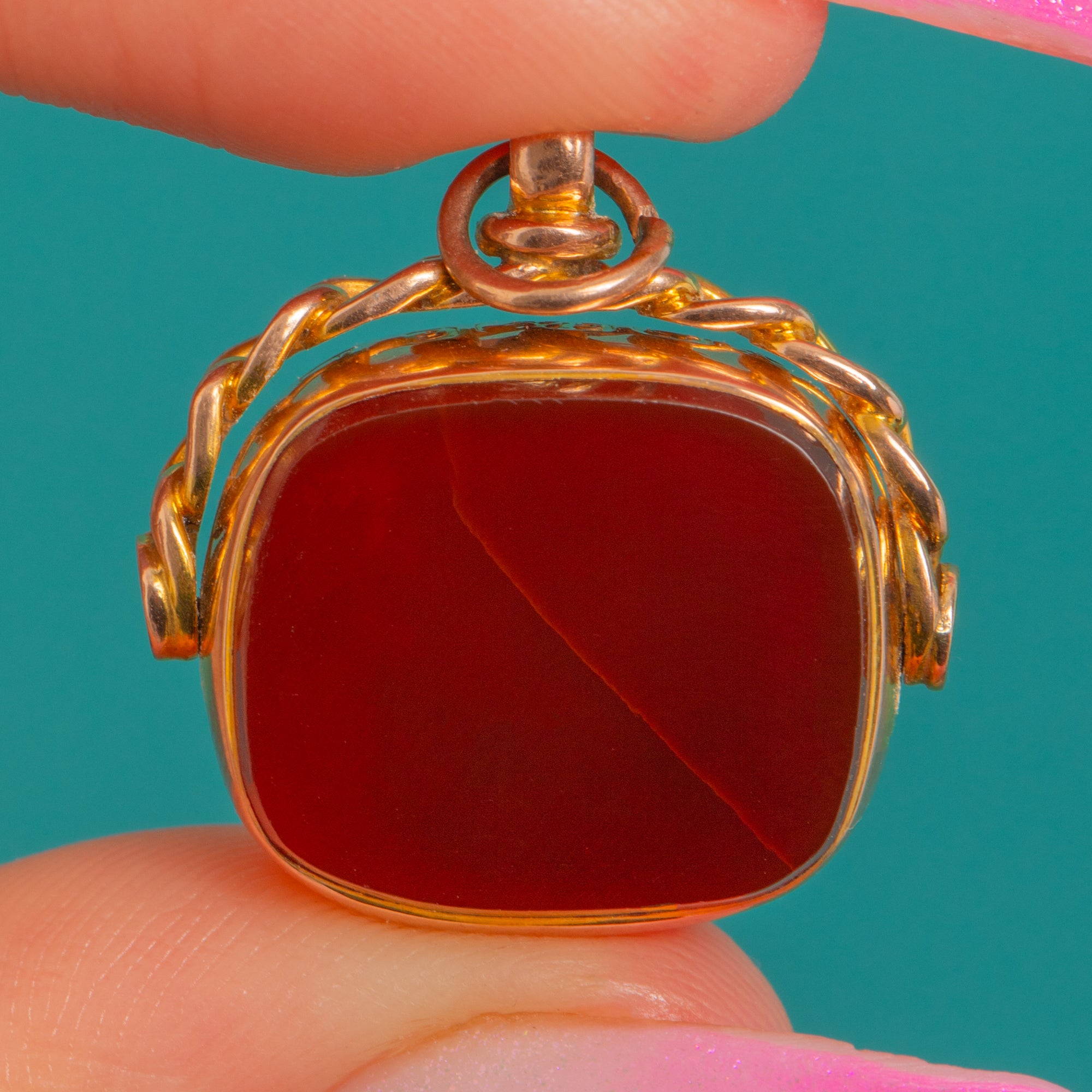 VERY GOOD: The Bloodstone and Carnelian show light surface wear/small abrasions under close inspection, with no chips observed. The 9ct Gold frame and swivel show gentle age-related wear and a soft patina. No visible signs of later repair; the mount and fittings are secure and ready to wear.