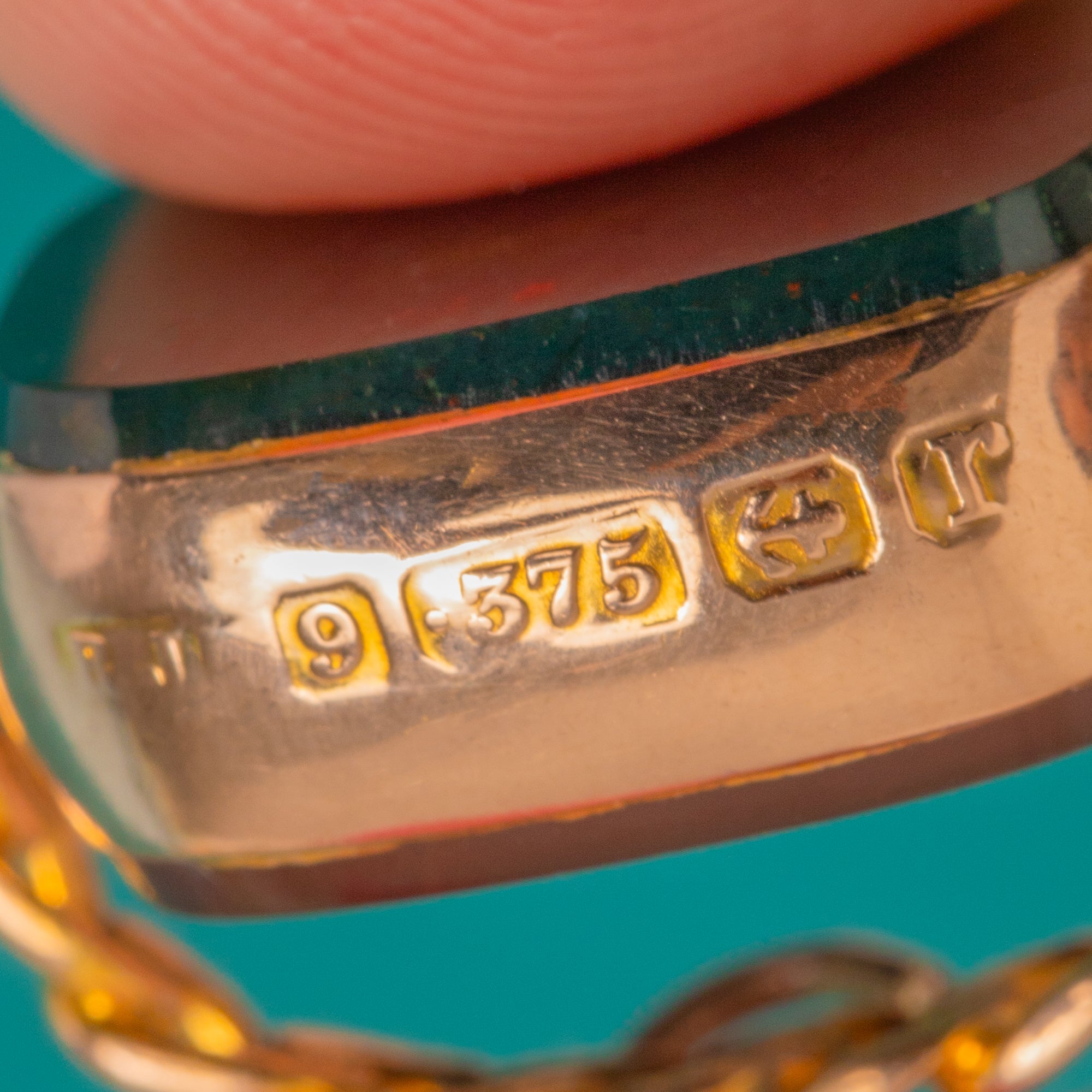 MATERIALS: Tests as 9ct Gold, Bloodstone, Carnelian.