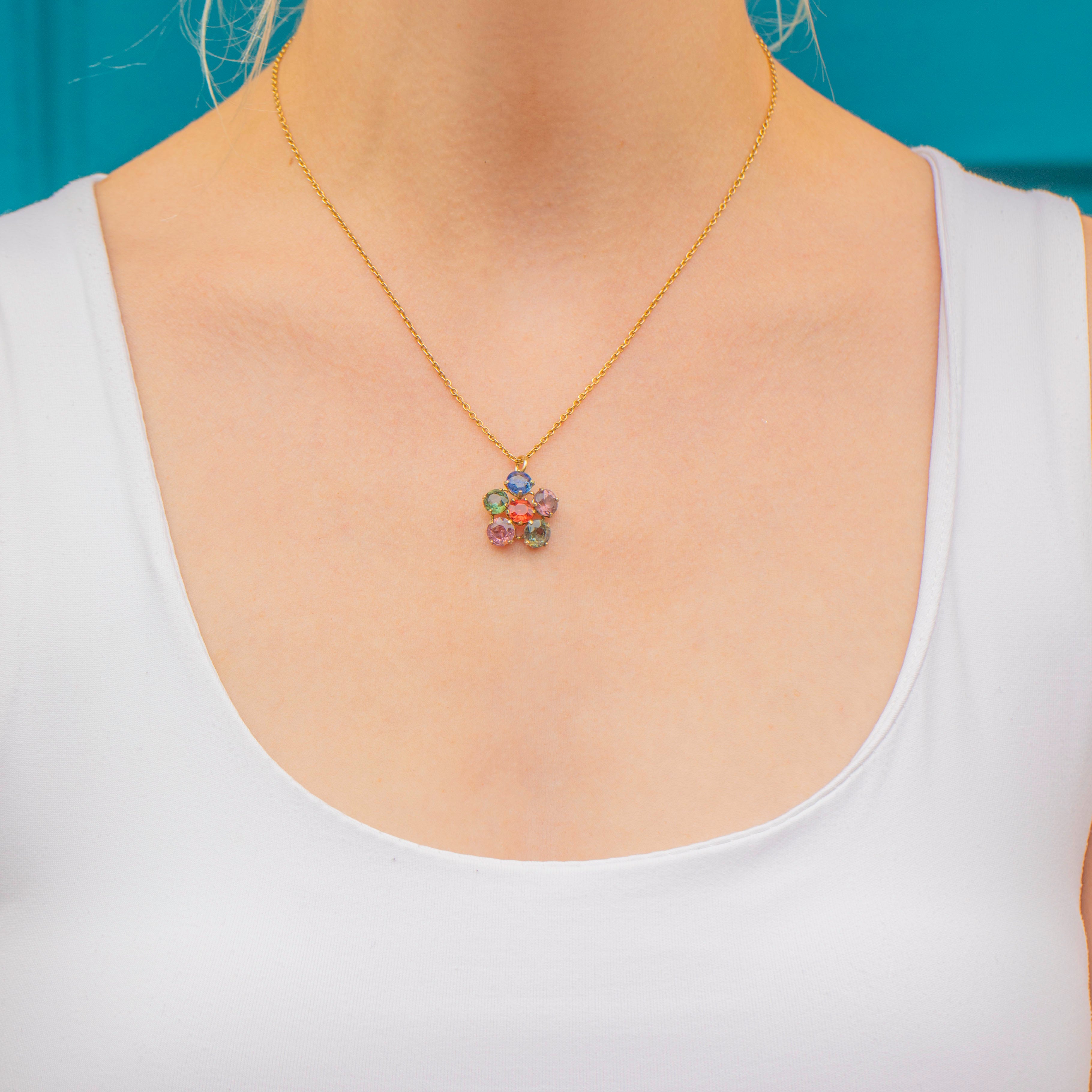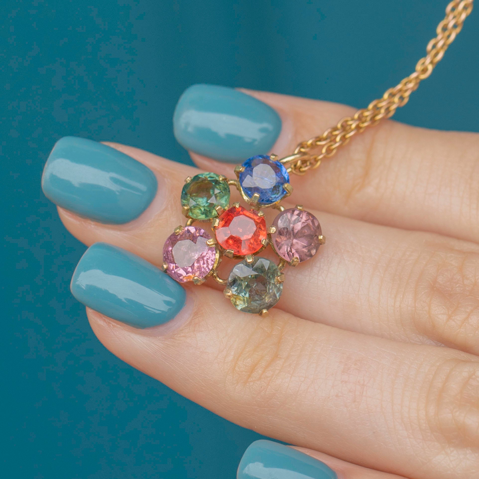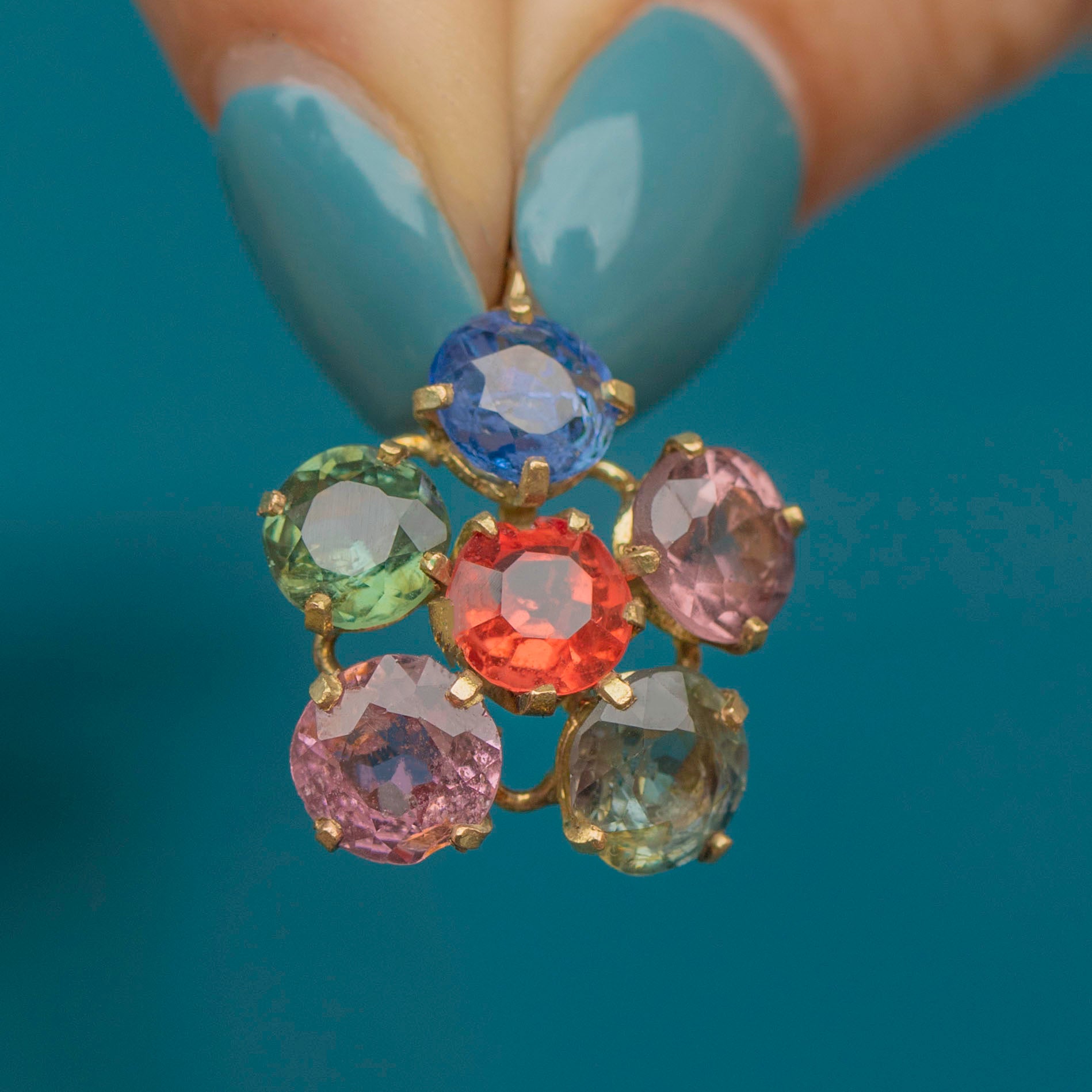 In the centre of the flower is a vivid Sapphire boasting gorgeous reddish orange tones. Encircling her central Sapphire are a plethora of colours, a cornflower blue Sapphire, a mauve Sapphire, a pink Topaz, and two teal-green Sapphires blossom around her. Crafted with precision and a touch of whimsy, she is a wearable work of art!