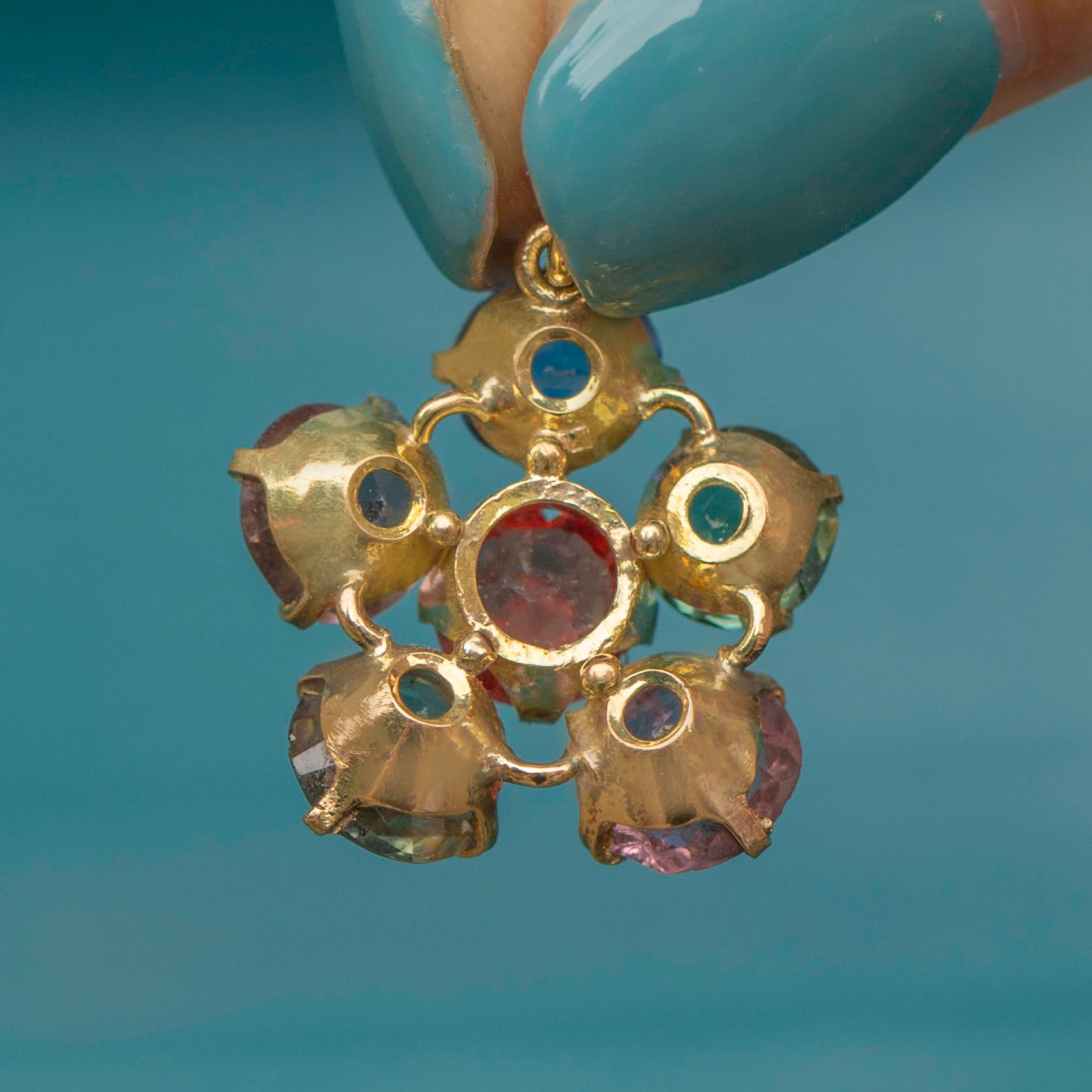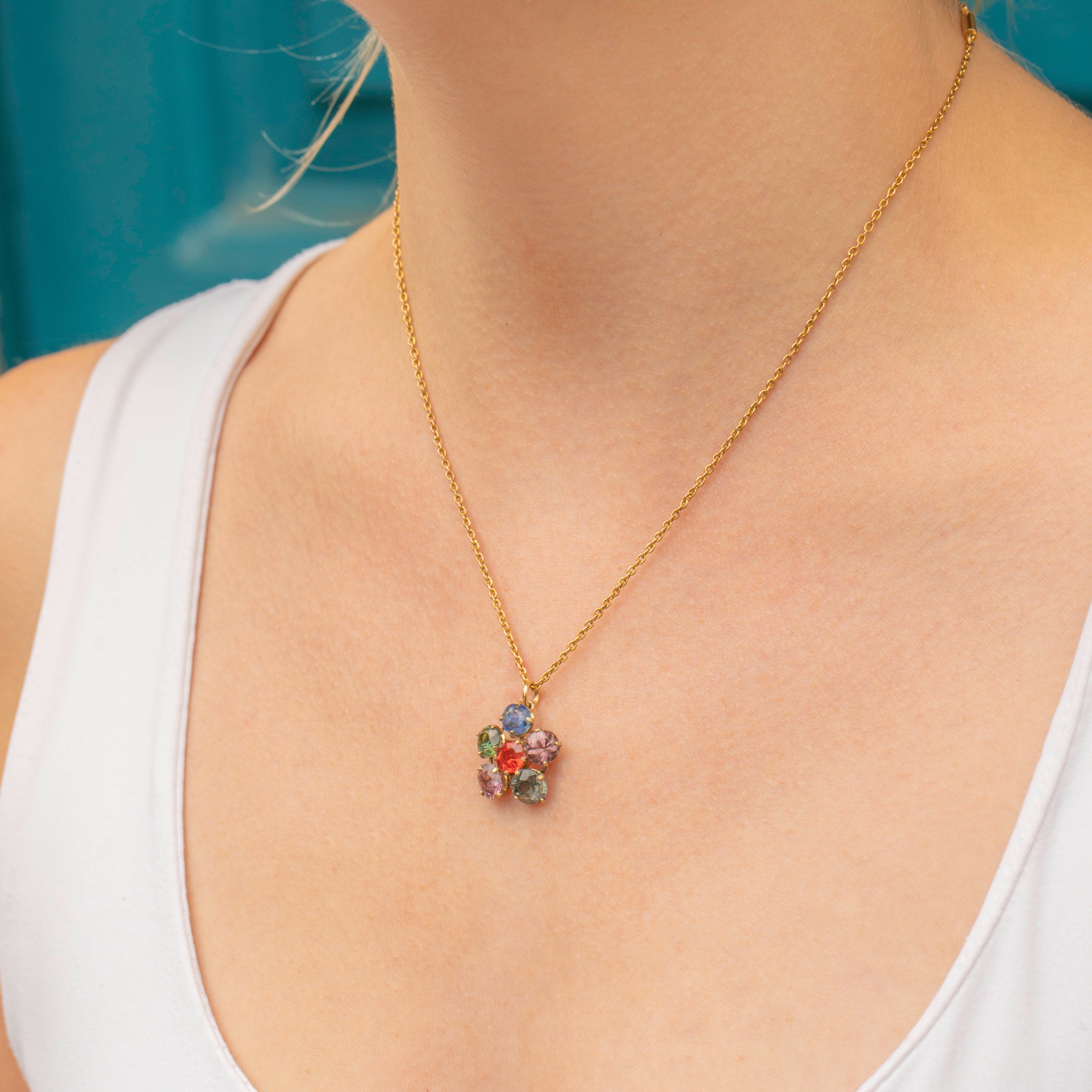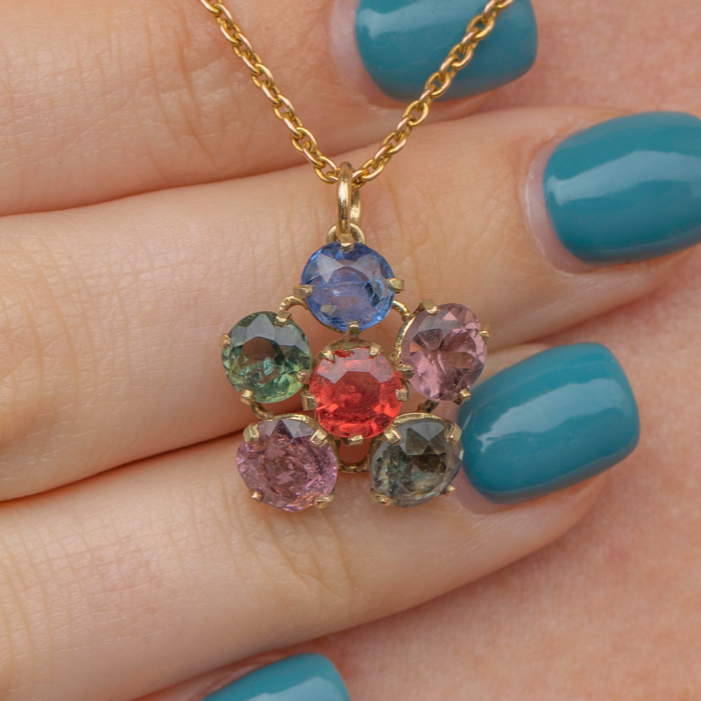 This 9ct Gold Blue Sapphire, Orange Sapphire & Topaz Flower Pendant is so alluring! Crafted in a buttery 9ct Gold, she features five beaming gemstones in a sweet flower formation, this pendant is a testament to Mid-Century Vintage craftsmanship.