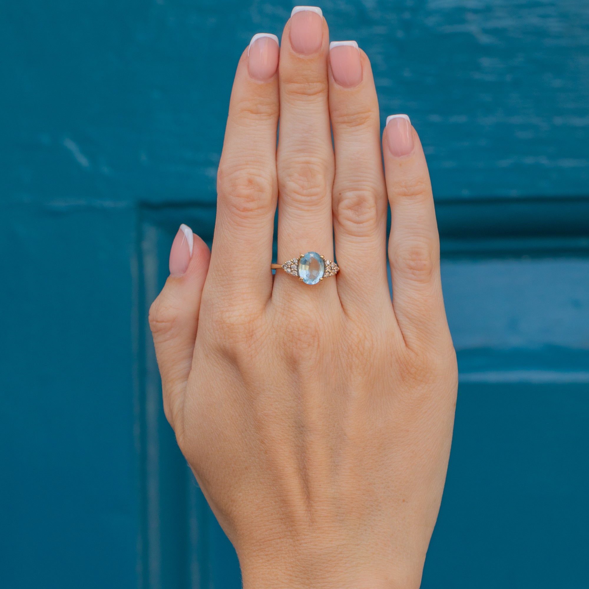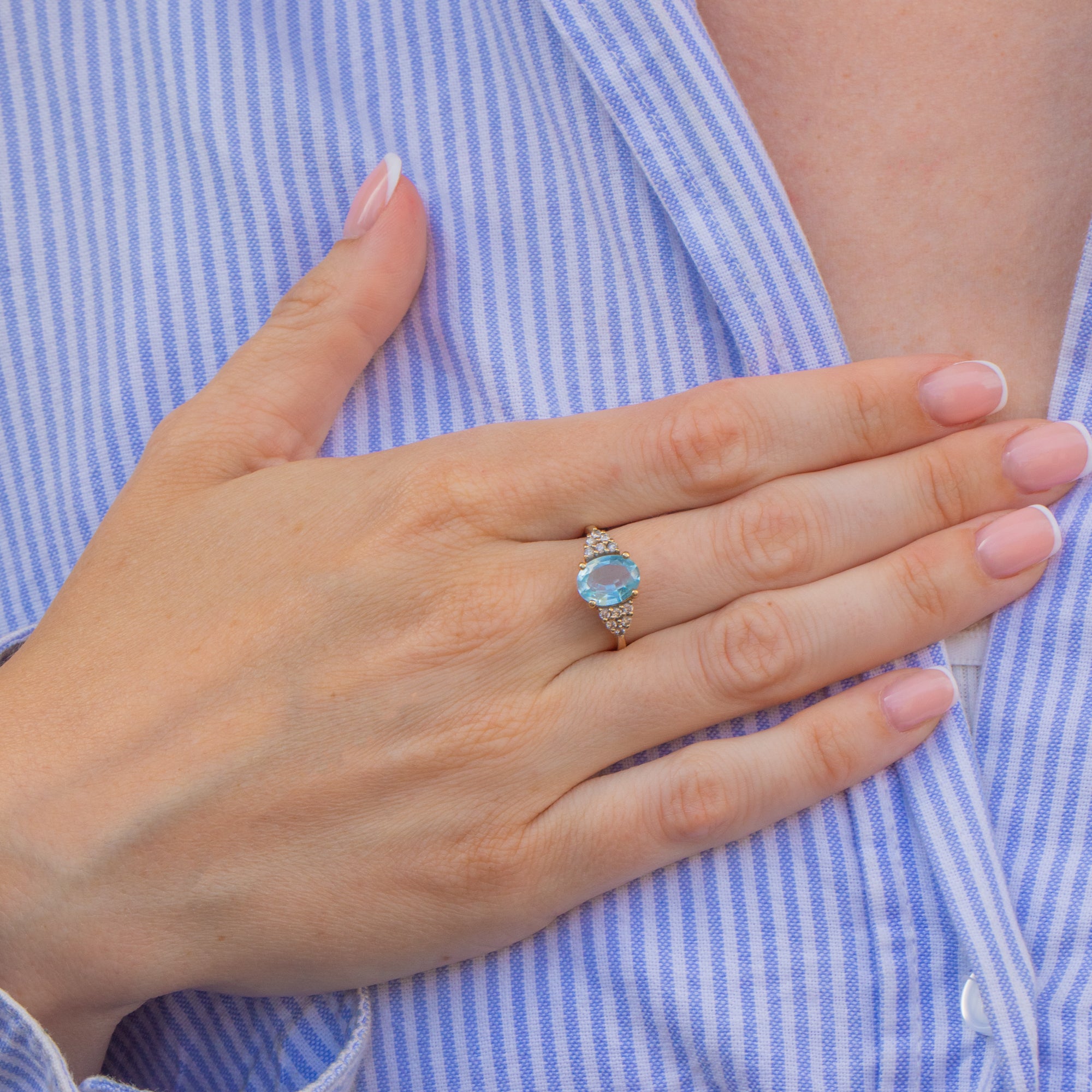 This 9ct Gold Blue Topaz Diamond cluster ring is heavenly. Boasting an impressive icy 0.80ct blue Topaz which takes centre stage, she is flanked by a cluster of gorgeous glistening Diamonds either side, captivating and charming all who gaze upon her.
