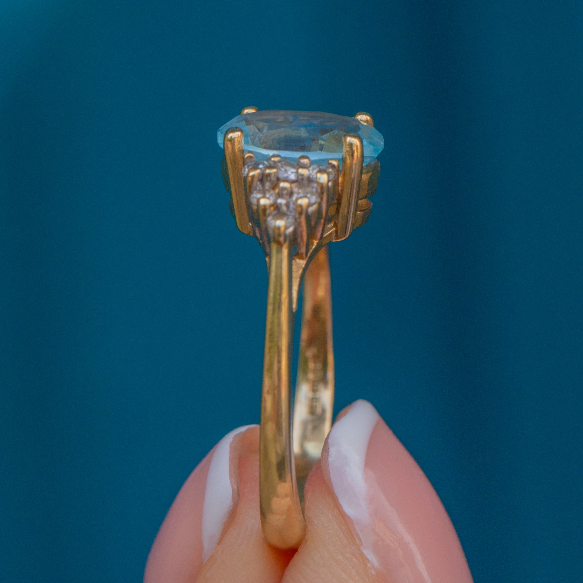 VERY GOOD-EXCELLENT This 9ct Gold Blue Topaz & Diamond Cluster Ring is in lovely condition. Her Blue Topaz is dazzling,with some very very light wear to the edge of the facets but still possessing an incredible hue! She and her scintillating Diamonds are securely set within their settings. The glossy 9ct Gold settings and band are all intact and free from any damage to note. Overall, this is a divine statement ring if you're looking to set your collection apart from the rest!