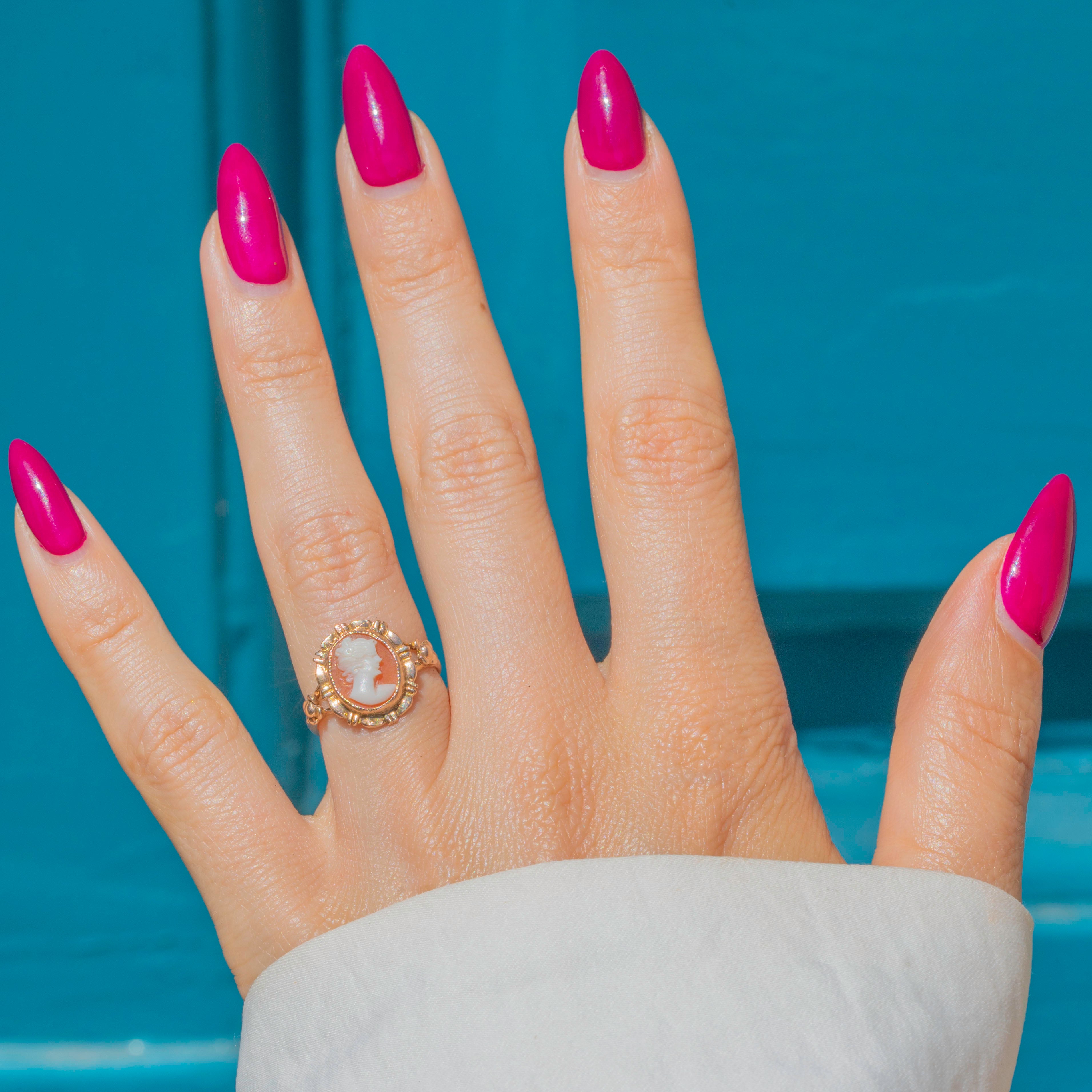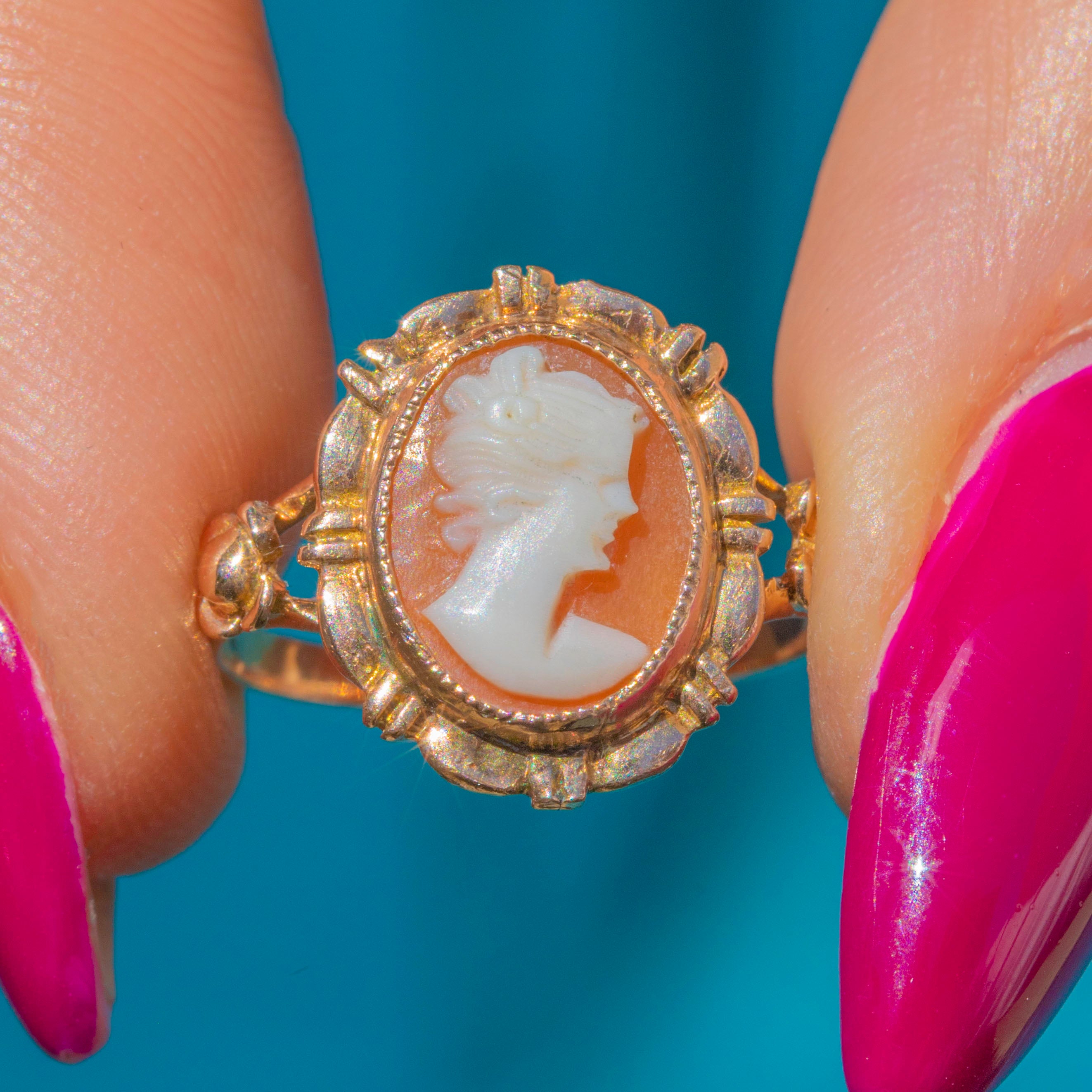 This sweet 9ct Gold cameo ring features a skillfully hand-carved portrait of a young lady on a soft terracotta coloured background.