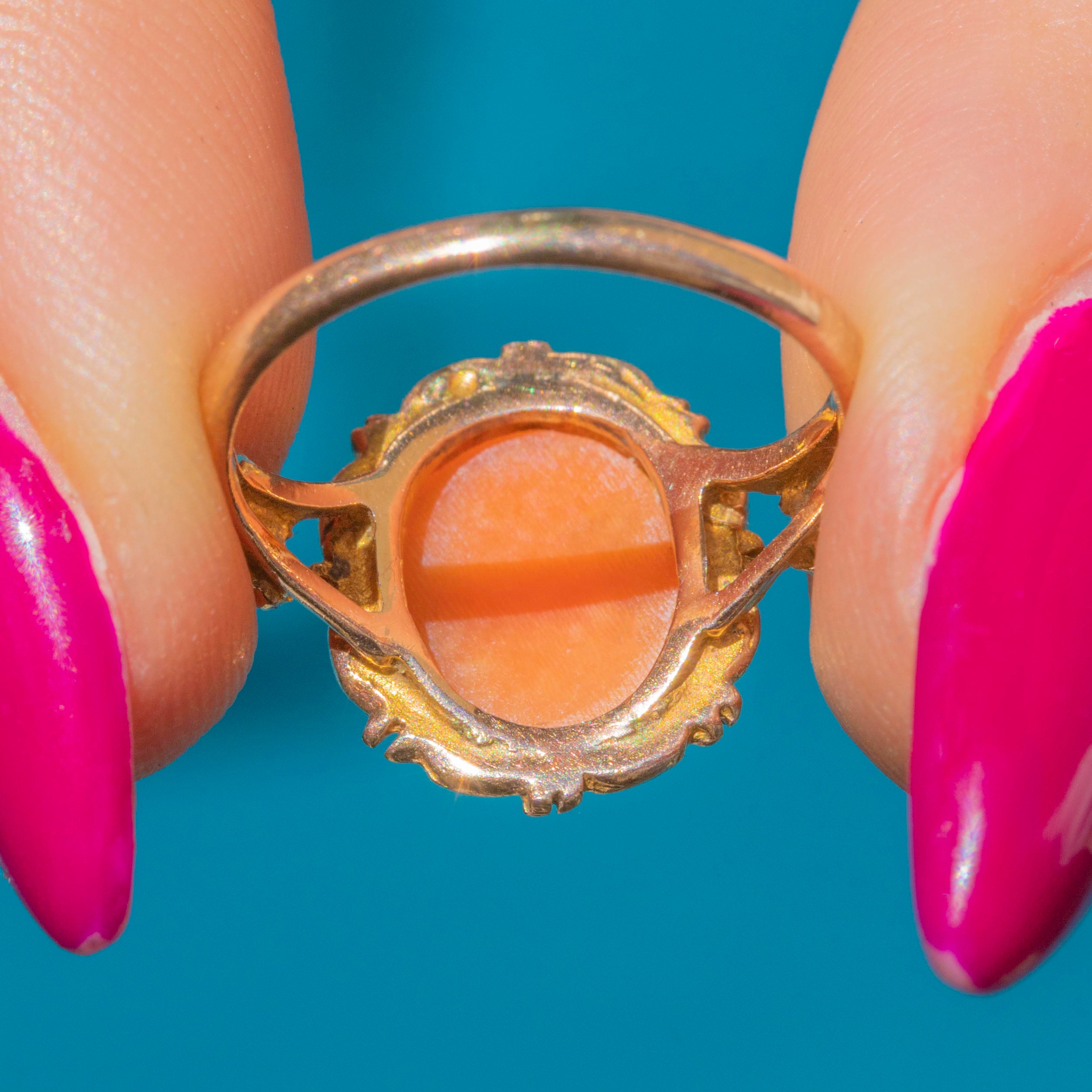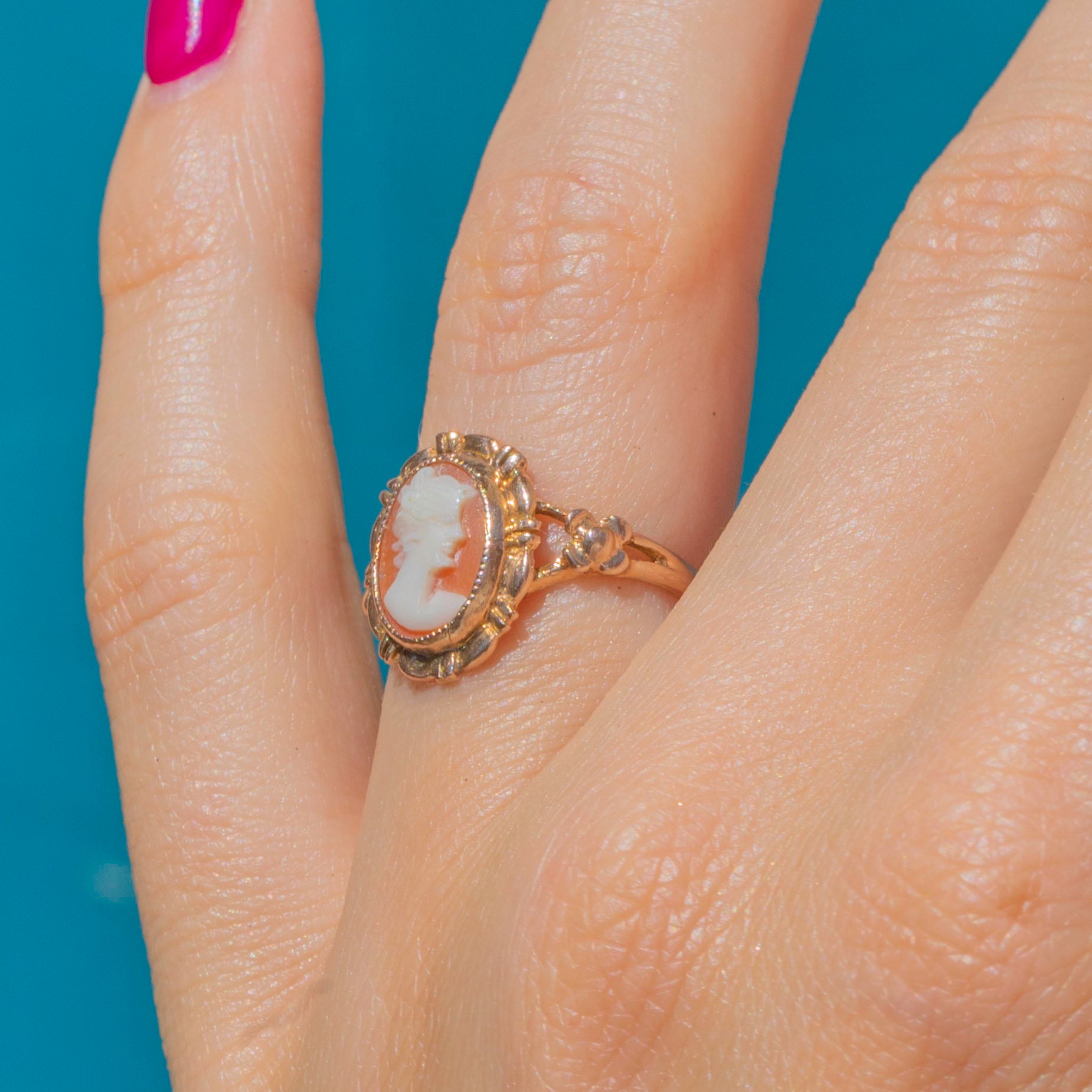 EXCELLENT: The Gold is in lovely condition with good shine and polish, and only minor wear to the very back of the band, with only a faint resize mark on the back of the ring. The delicately carved cameo is in perfect condition, with no splits, chips or damage whatsoever, and it is held firmly in place- ready to wear & enjoy!
