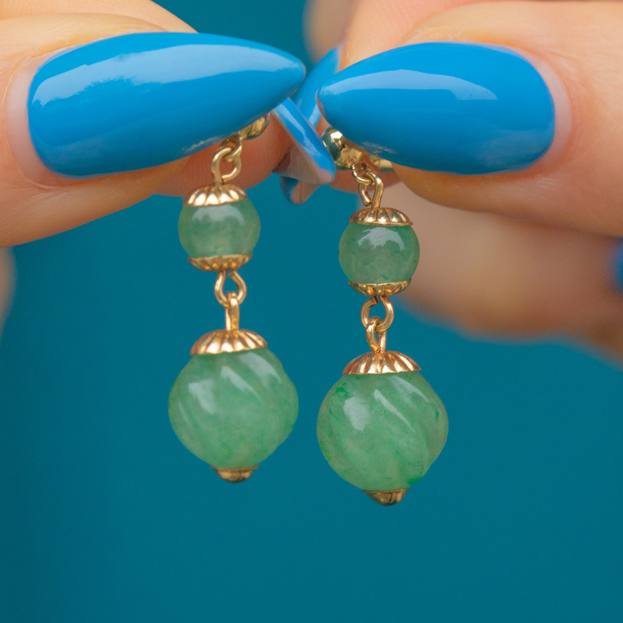 EXCELLENT. These 9ct Gold carved Jade double drop earrings are in excellent condition. The Jade beads are smooth with no chips or scuffs to note and the Gold is buttery throughout. Each component is securely affixed and the butterfly backs provide secure and comfortable wear!