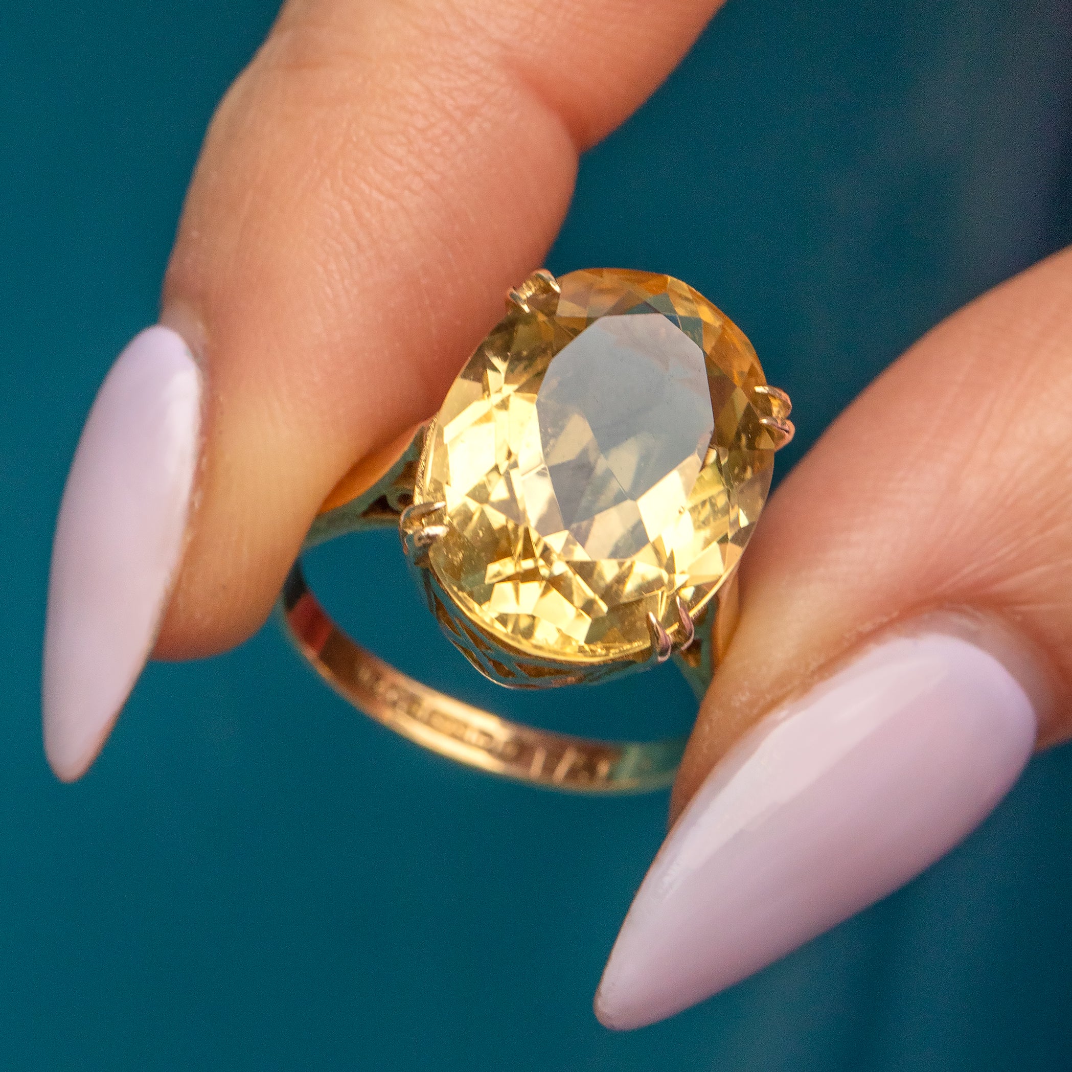EXCELLENT. A divine 9ct Gold Citrine cocktail ring in beautiful condition! The Citrine sits securely within the claw settings, allowing the light to stream through from all angles. With a smooth ring band, she sits comfortably upon your hand. The gallery is all in pristine condition and the 9ct Gold is buttery throughout. With such sheer beauty and radiance, this antique Citrine ring must be yours!
