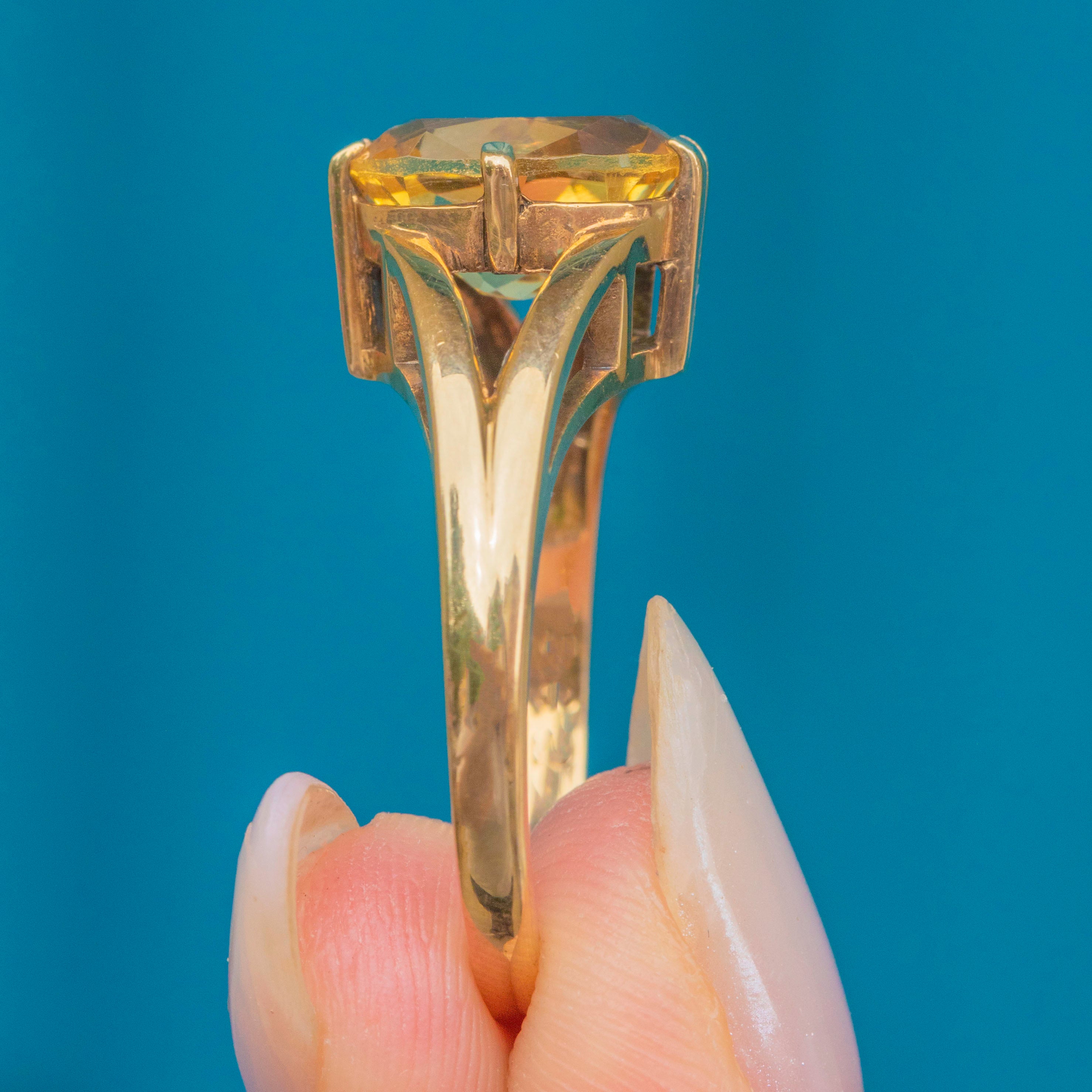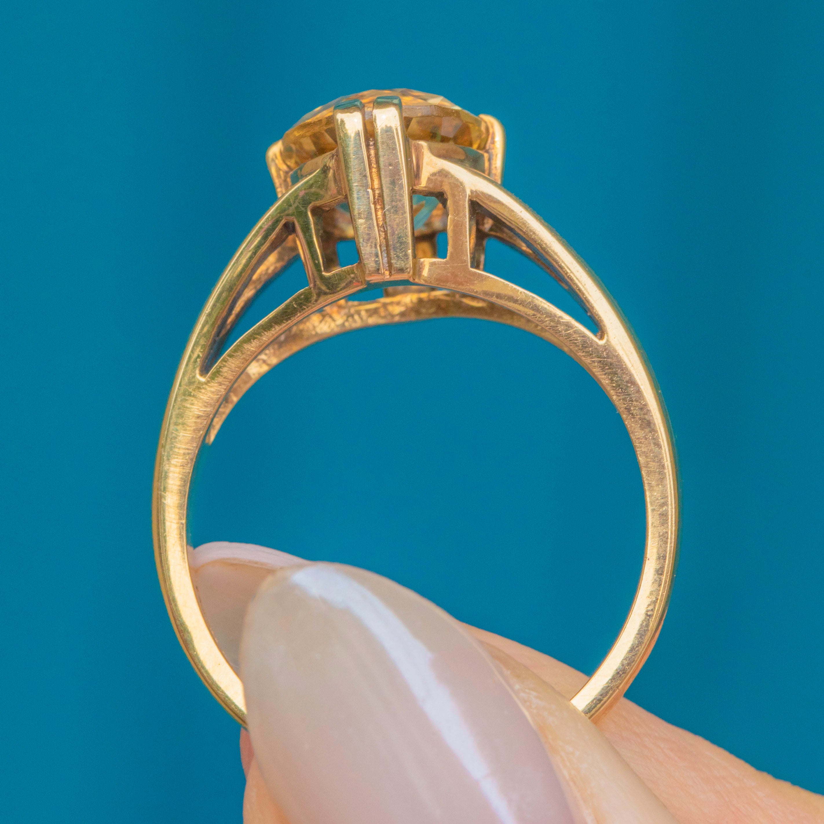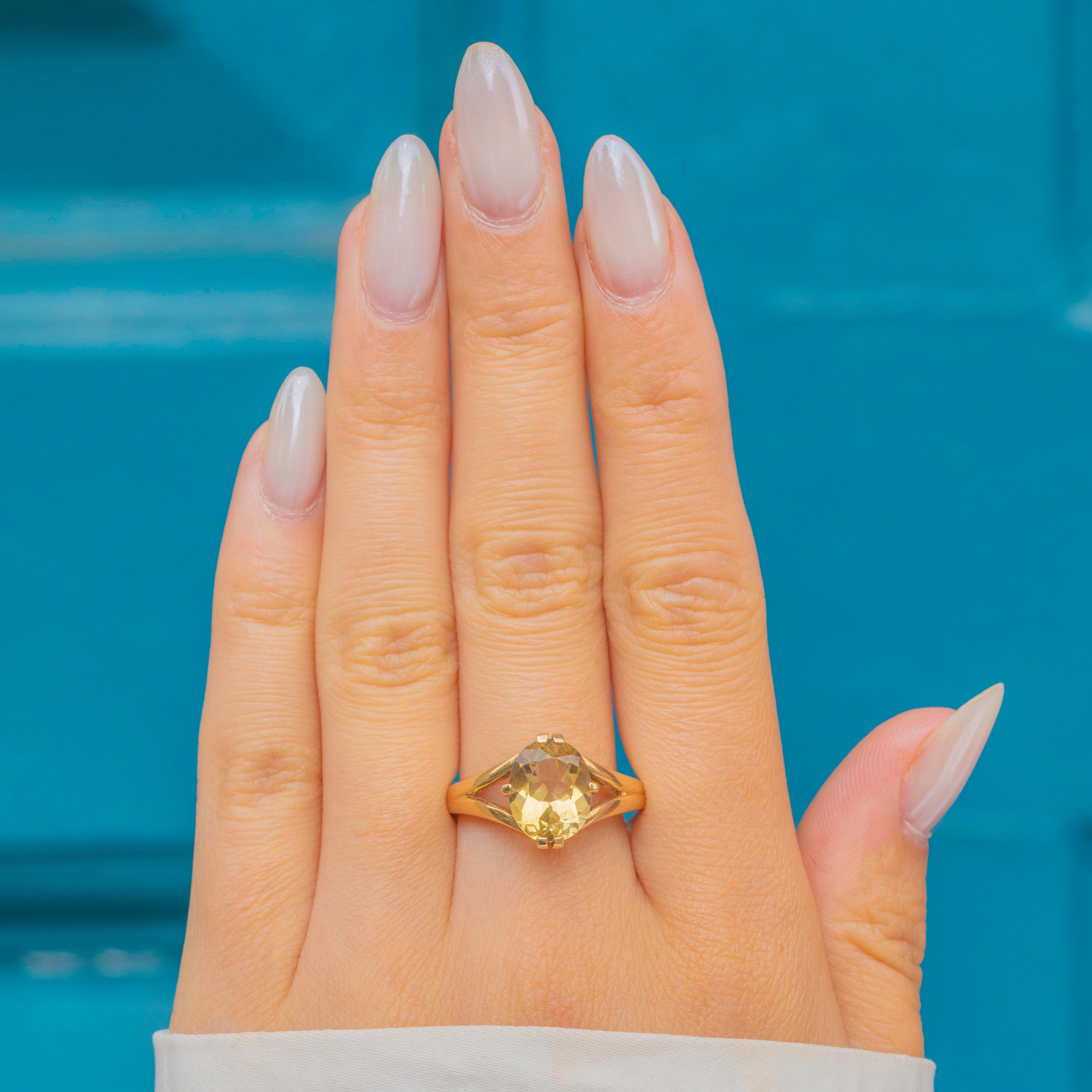 Crafted circa 1900, this Citrine solitaire ring provides wonderful coverage and brings impact to your hand. Hugged by tapered 9ct Gold claw settings, and poised on a split shoulder band, there is everything to love about this lovely lady from the moment you lay eyes on her!