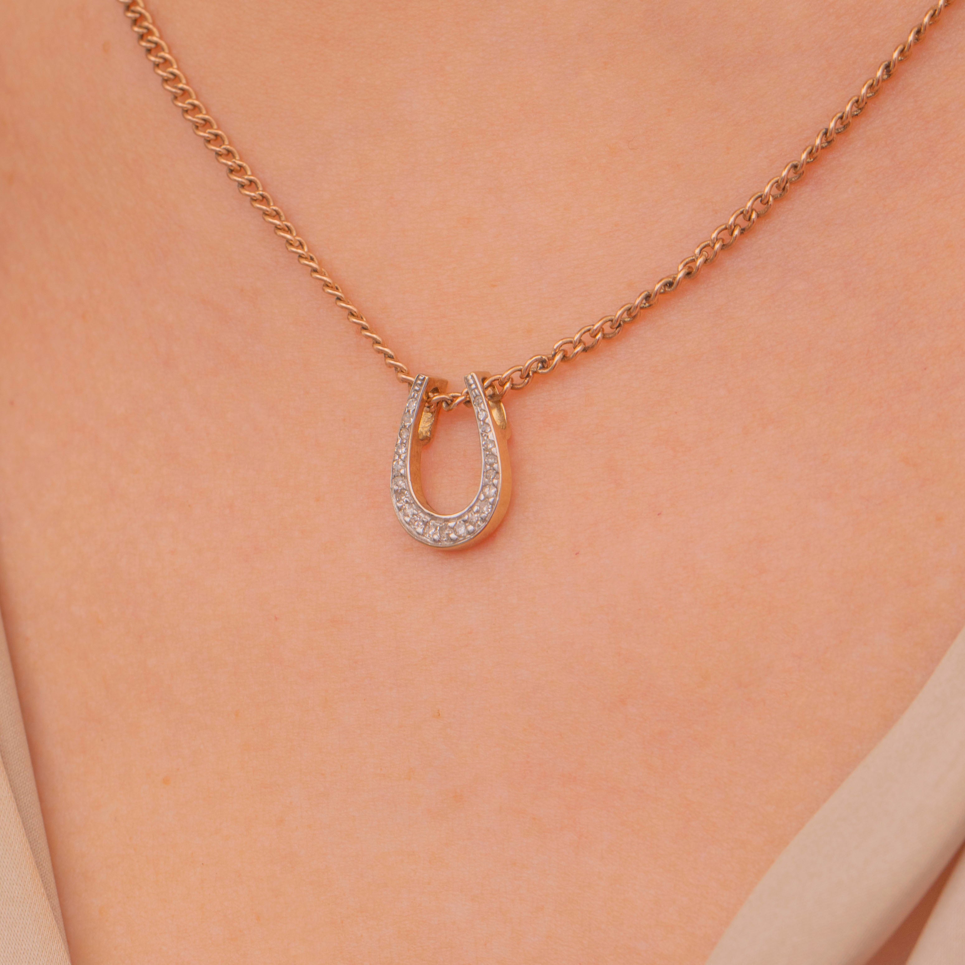 EXCELLENT. This 9ct Gold Diamond horseshoe slider pendant is in excellent condition. Her Diamonds are securely set and twinkle majestically without chips or scratches, and the Gold is bright and buttery. All in all, this fantastic vintage pendant is the most wonderful lucky charm to add to your collection!