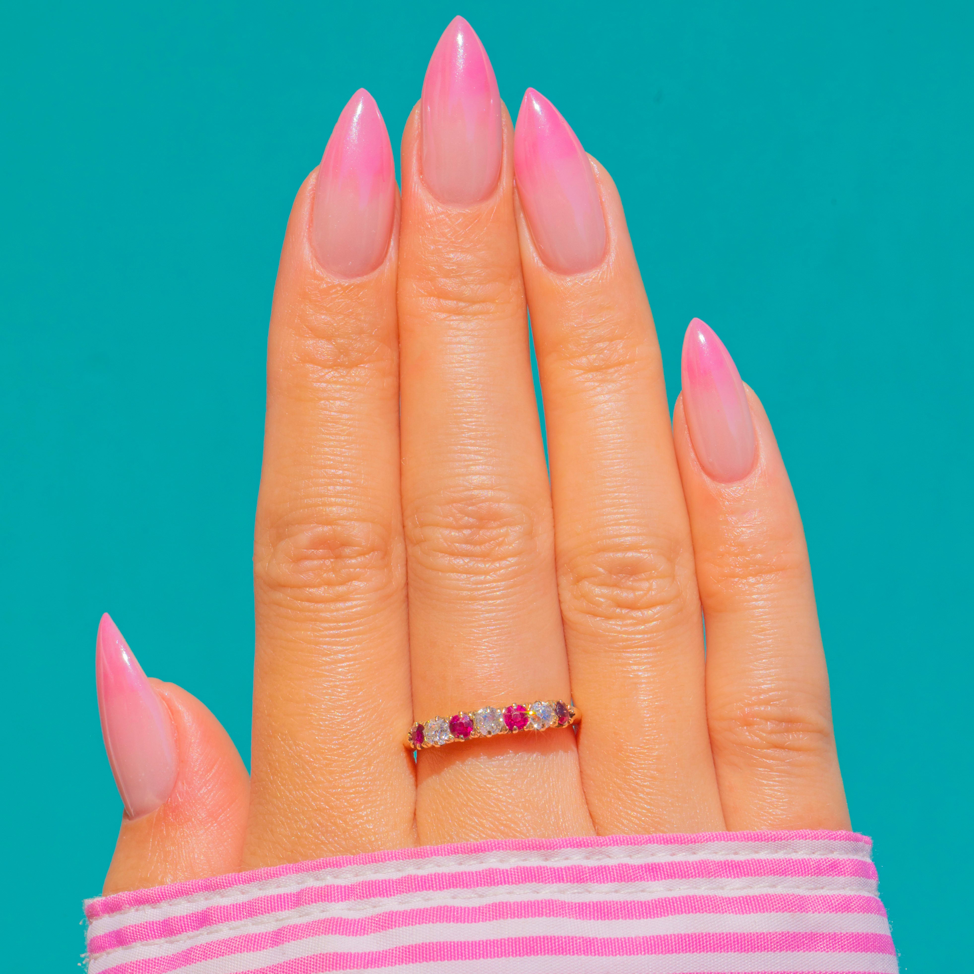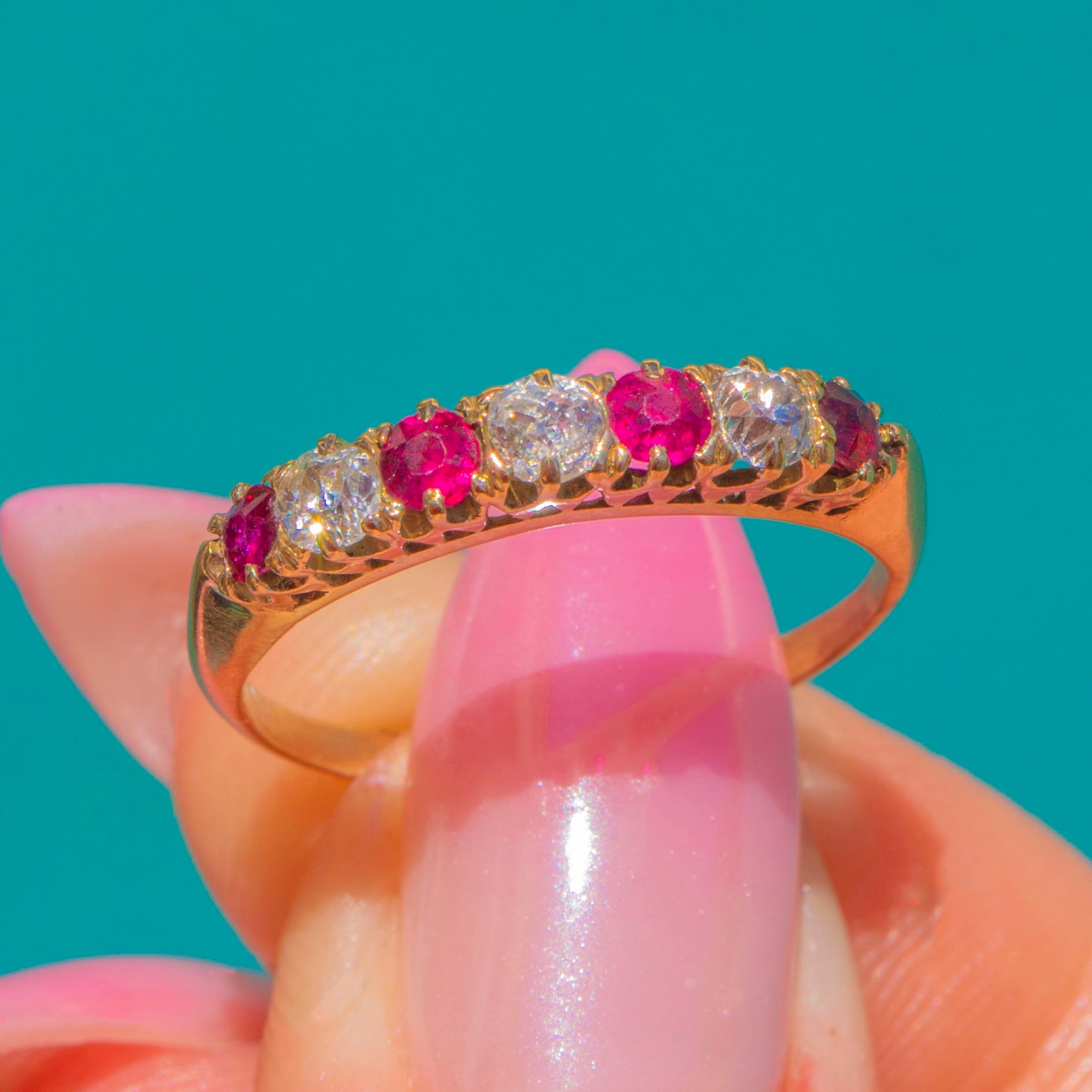 A delicate delight in 9ct Gold, this half eternity ring pairs vivid Rubies with twinkling Diamonds in a neat, alternating line. Each round stone is individually claw-set to catch the light, creating a refined ribbon of pink-red and white sparkle across the finger.