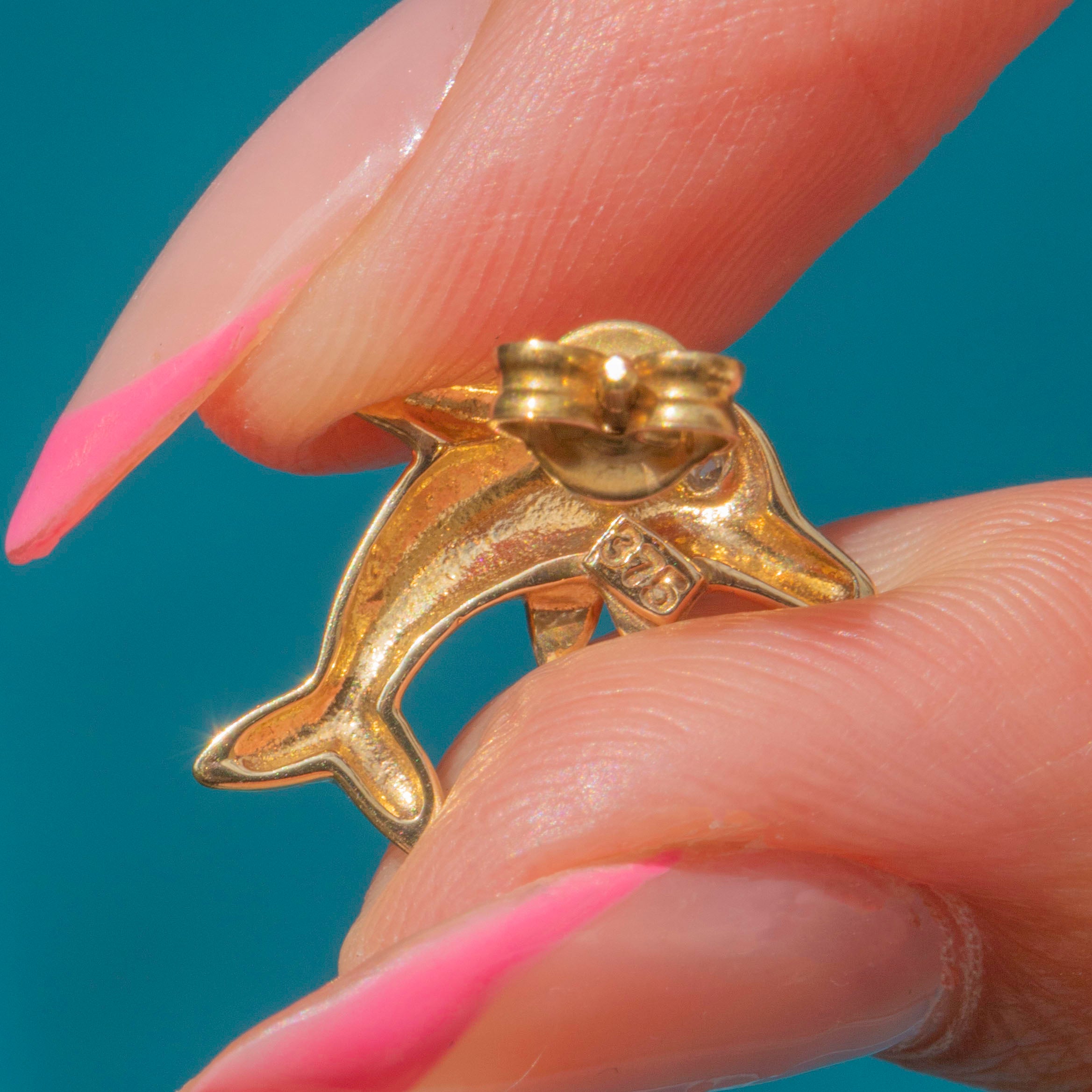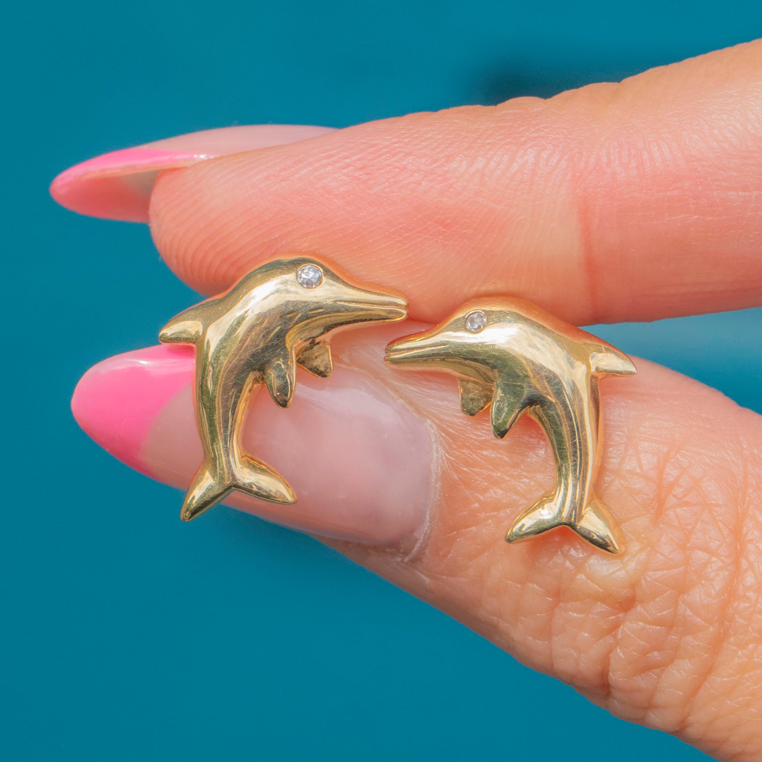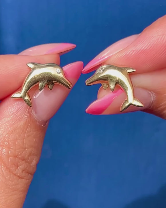 VERY GOOD-EXCELLENT: These 9ct Gold and Diamond dolphin earrings are in great condition. Each earring has been crafted wonderfully, with a lovely glossy sheen. There are some minor dings to the Gold, though this is difficult to spot without a loupe. With her Diamonds securely set, these vintage studs are a must-have!
