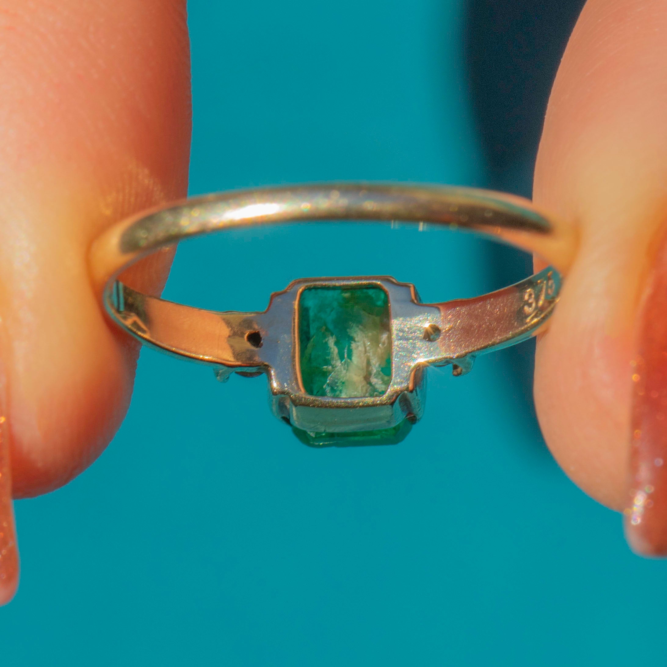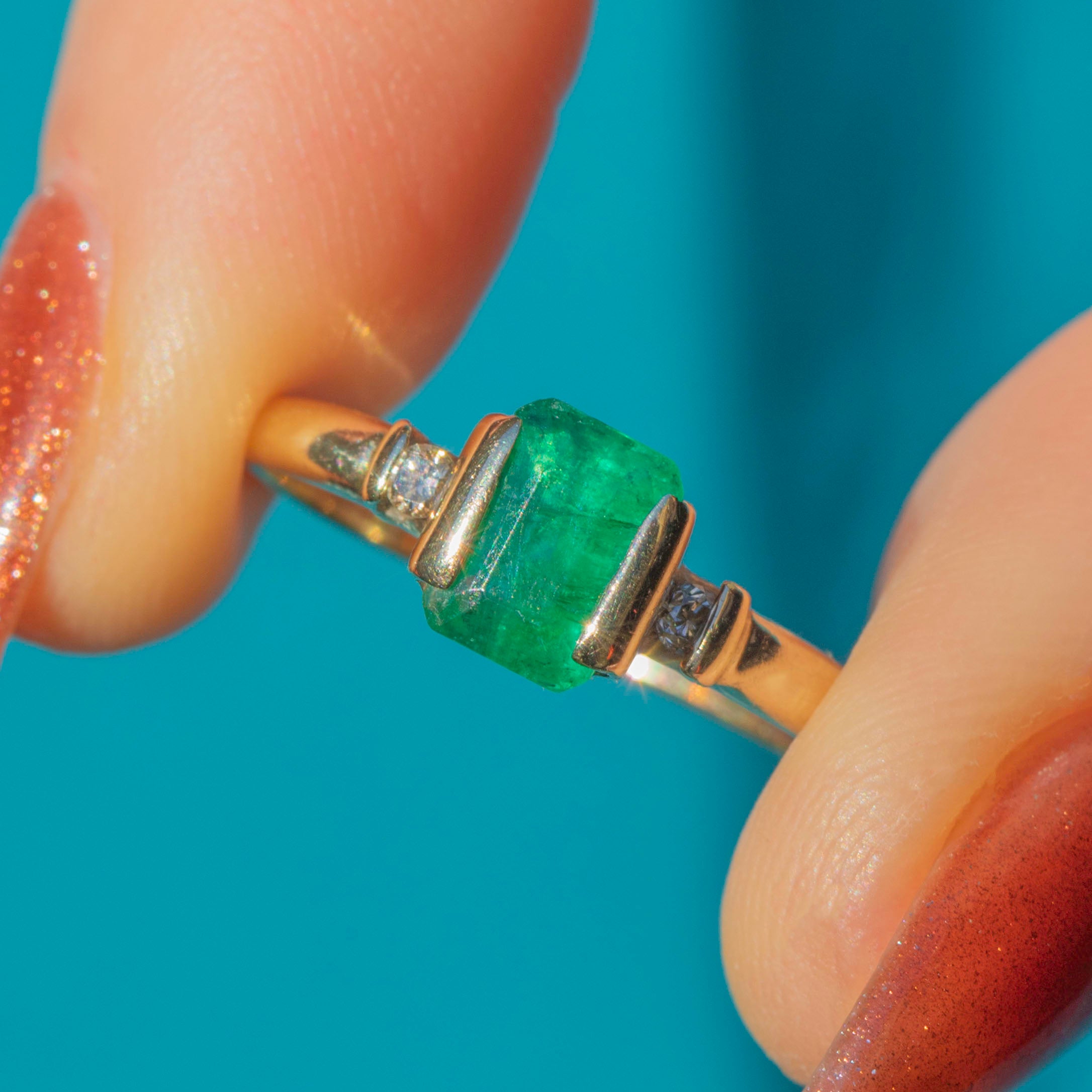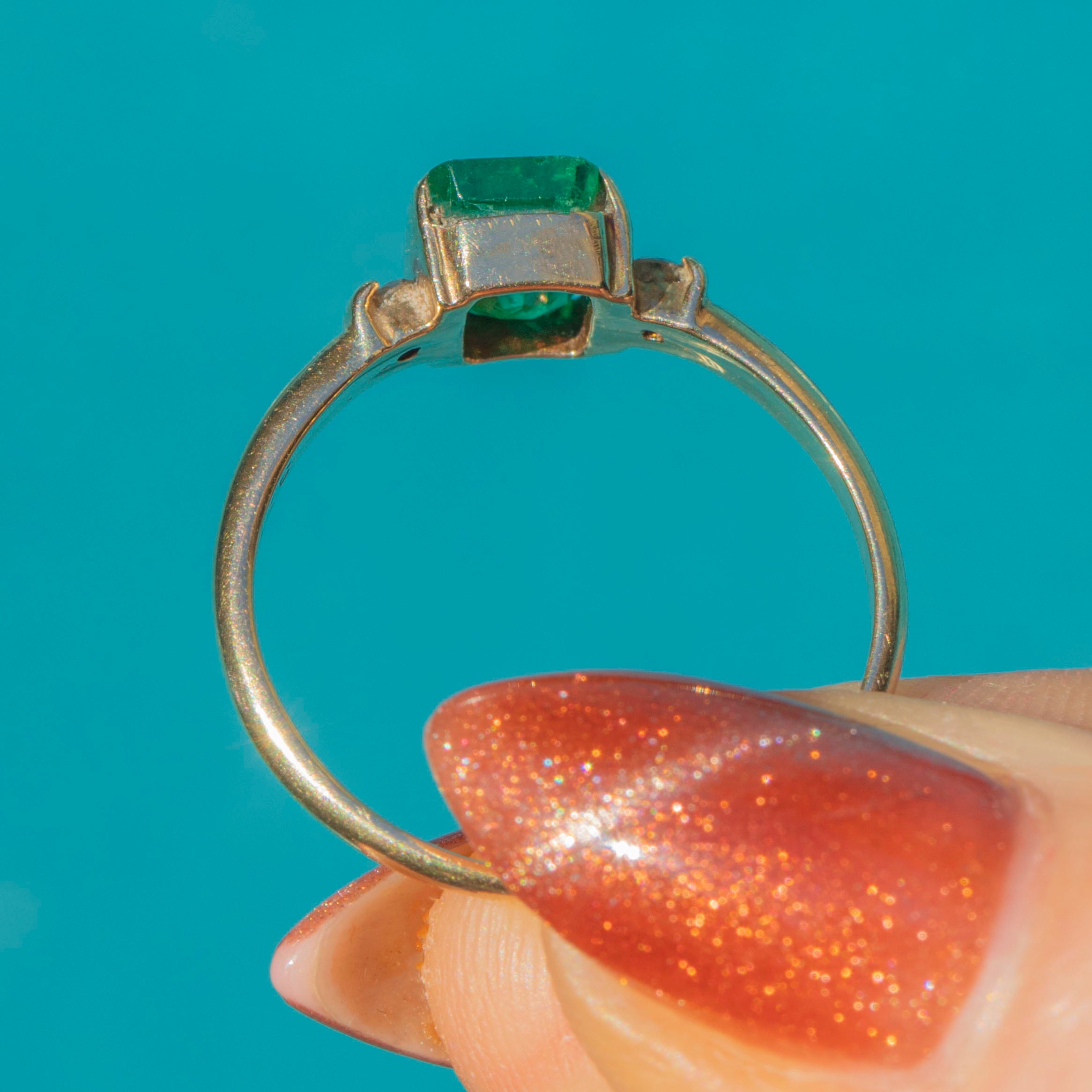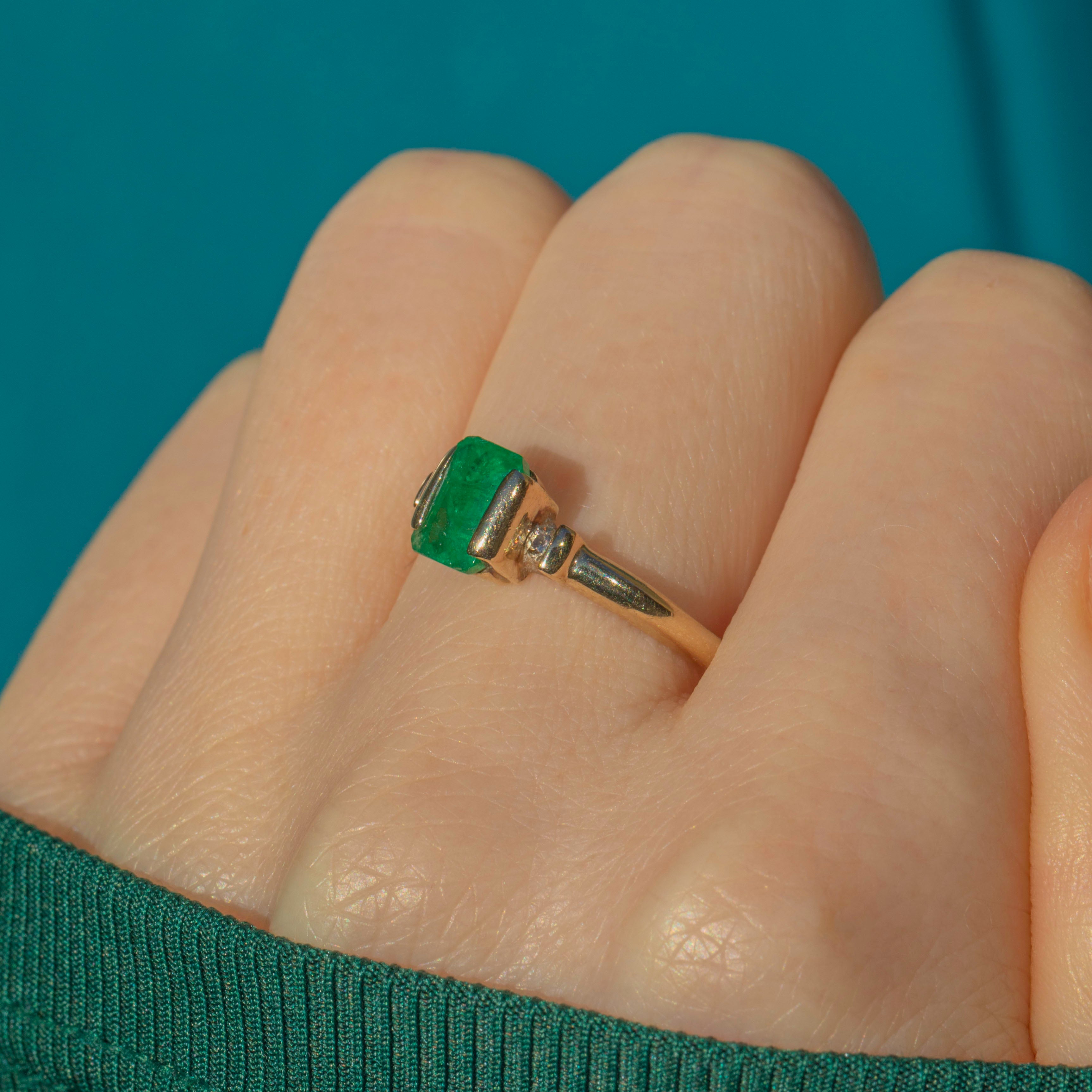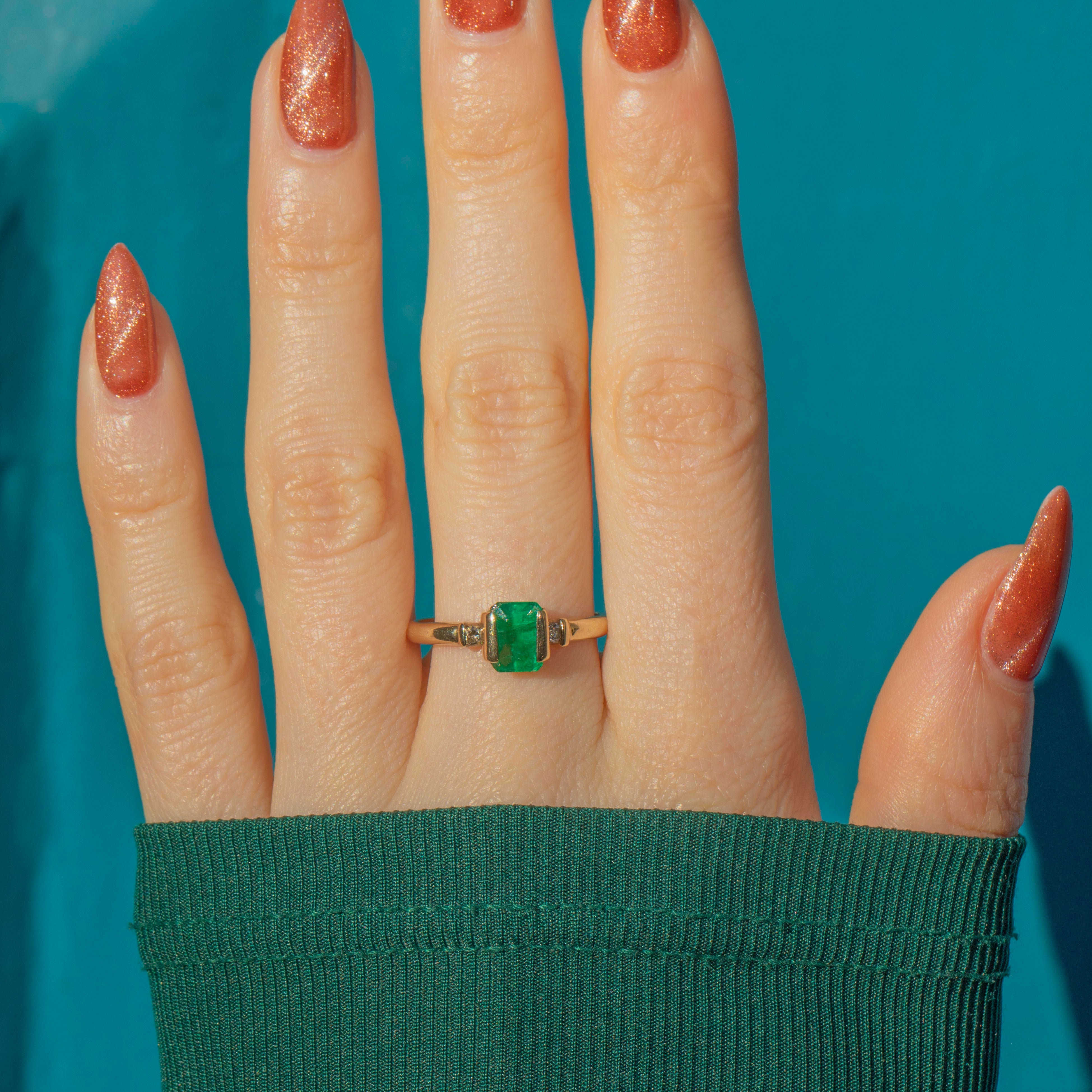 This charming vintage Emerald and Diamond ring is a gorgeous, elegant piece! In her centre sits a saturated Emerald, faceted wonderfully and radiating vibrant verdant green. She is flanked by two scintillating Diamonds, their bright sparkle emphasising the vibrancy of the central Emerald.